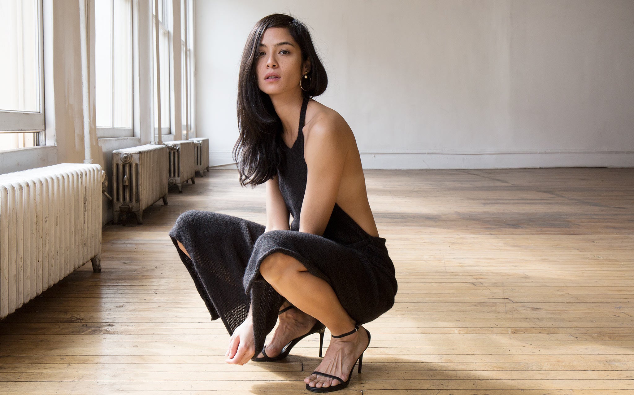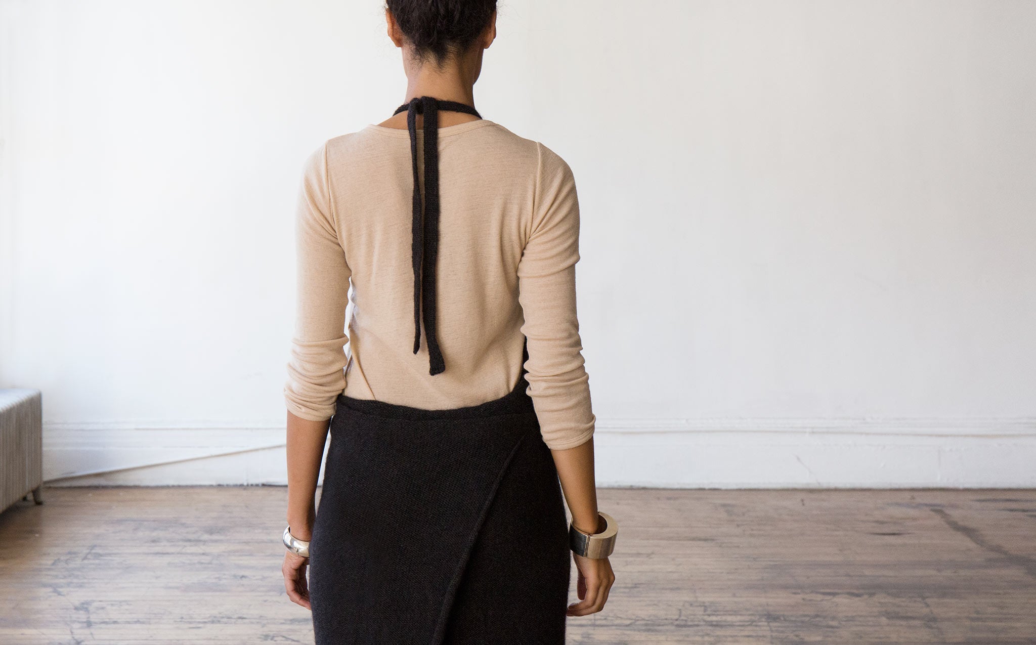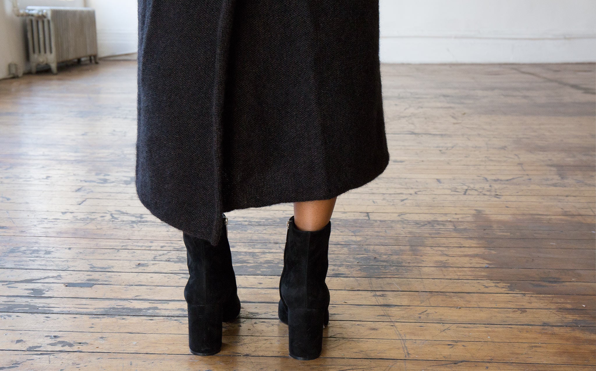 Black melange sweater dress is 33% yack wool, 33% silk, and 33% mohair.