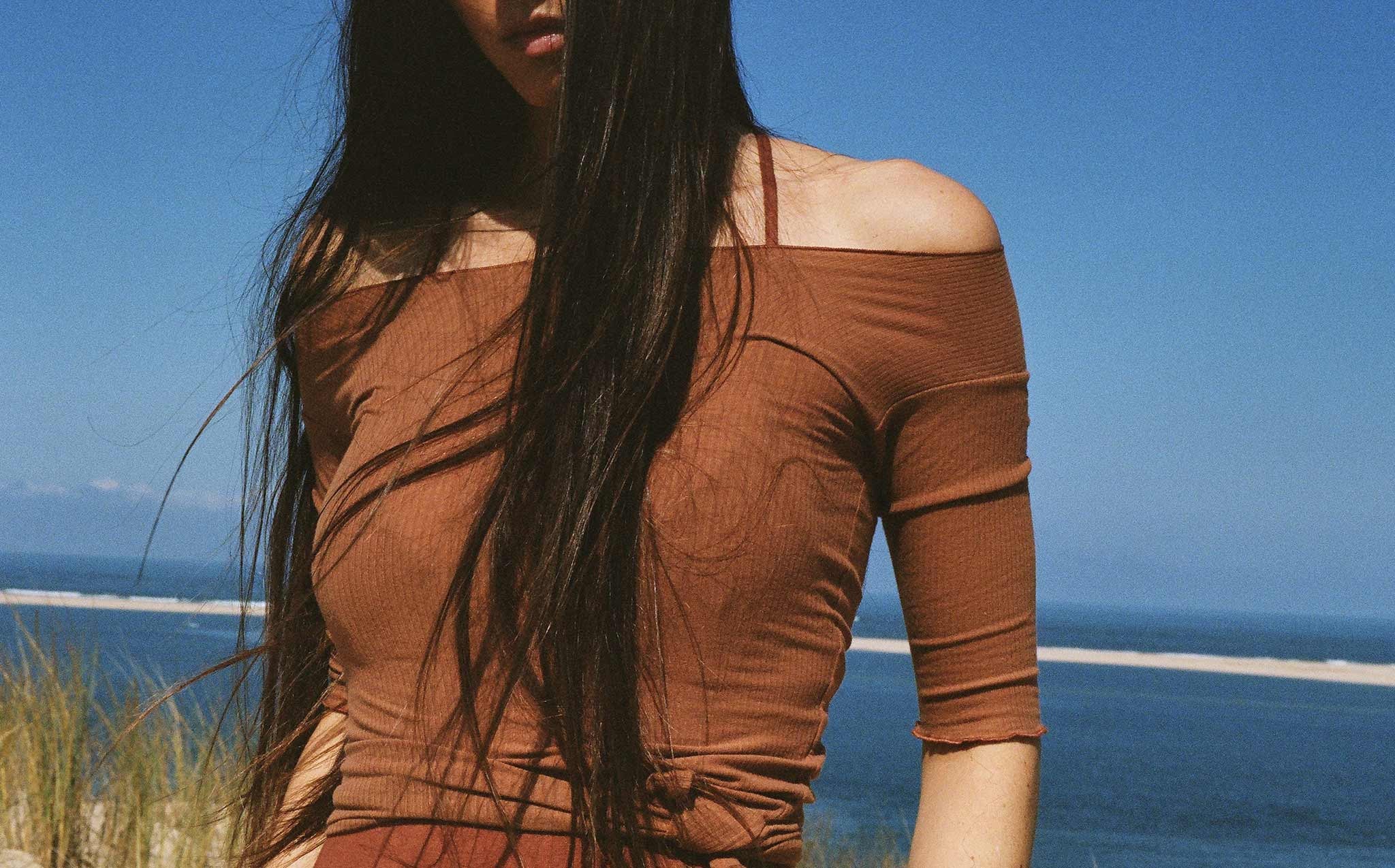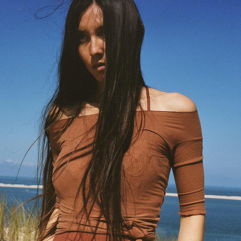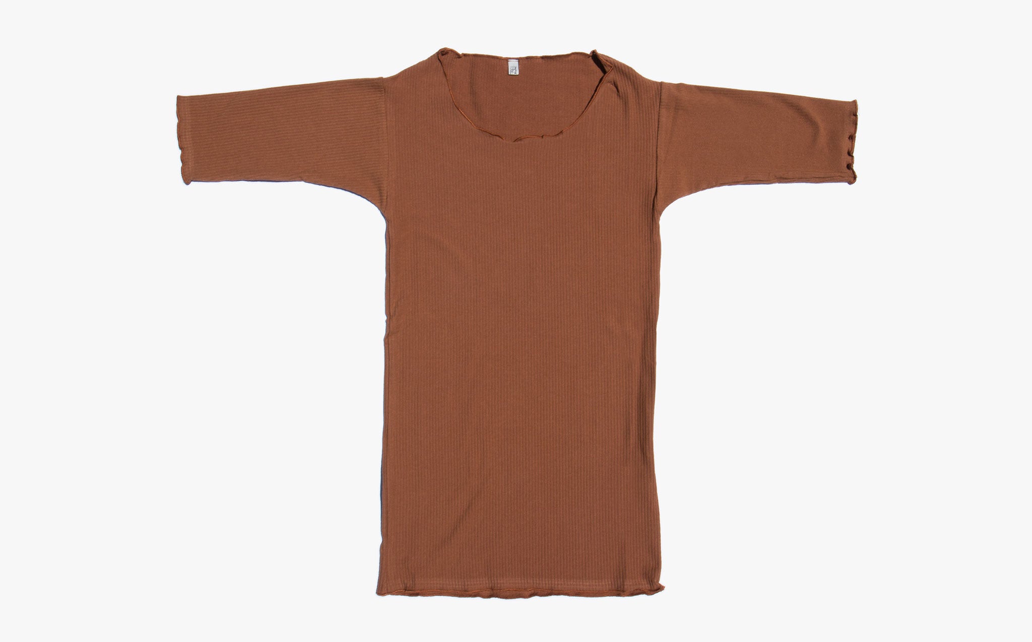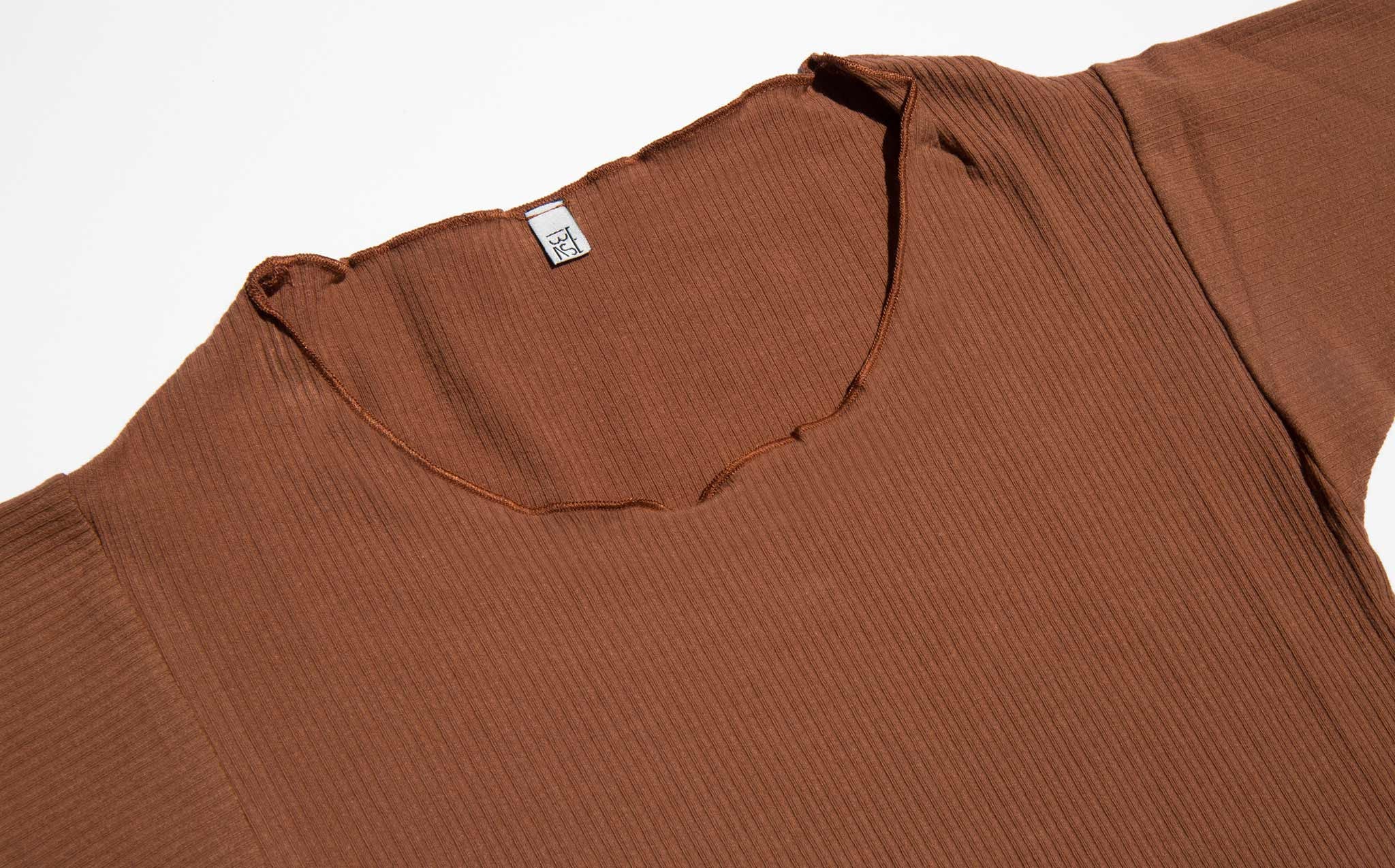 The Baserange Pama Ribbed Top is a fitted, fine rib, organic cotton tee with slight stretch and lettuce edge at hem and sleeves. This item is FINAL SALE.