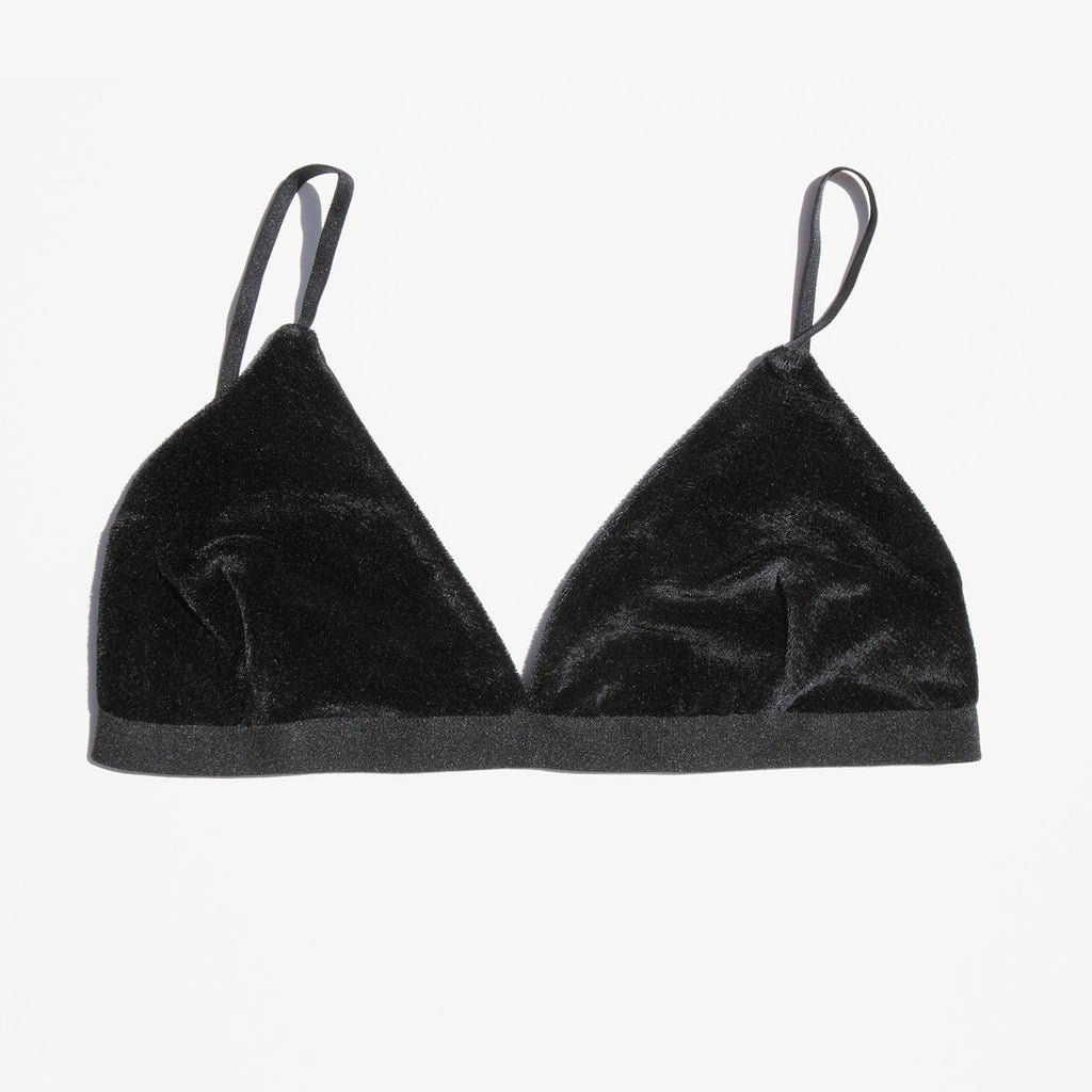 Soft modal velour triangle bra with thin, adjustable straps and elastic trim under bust for support. This item is FINAL SALE.