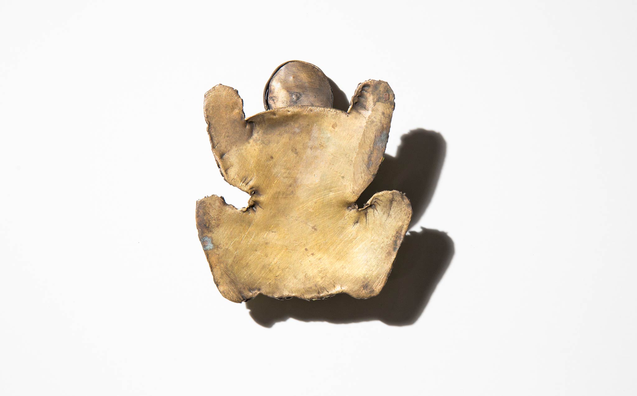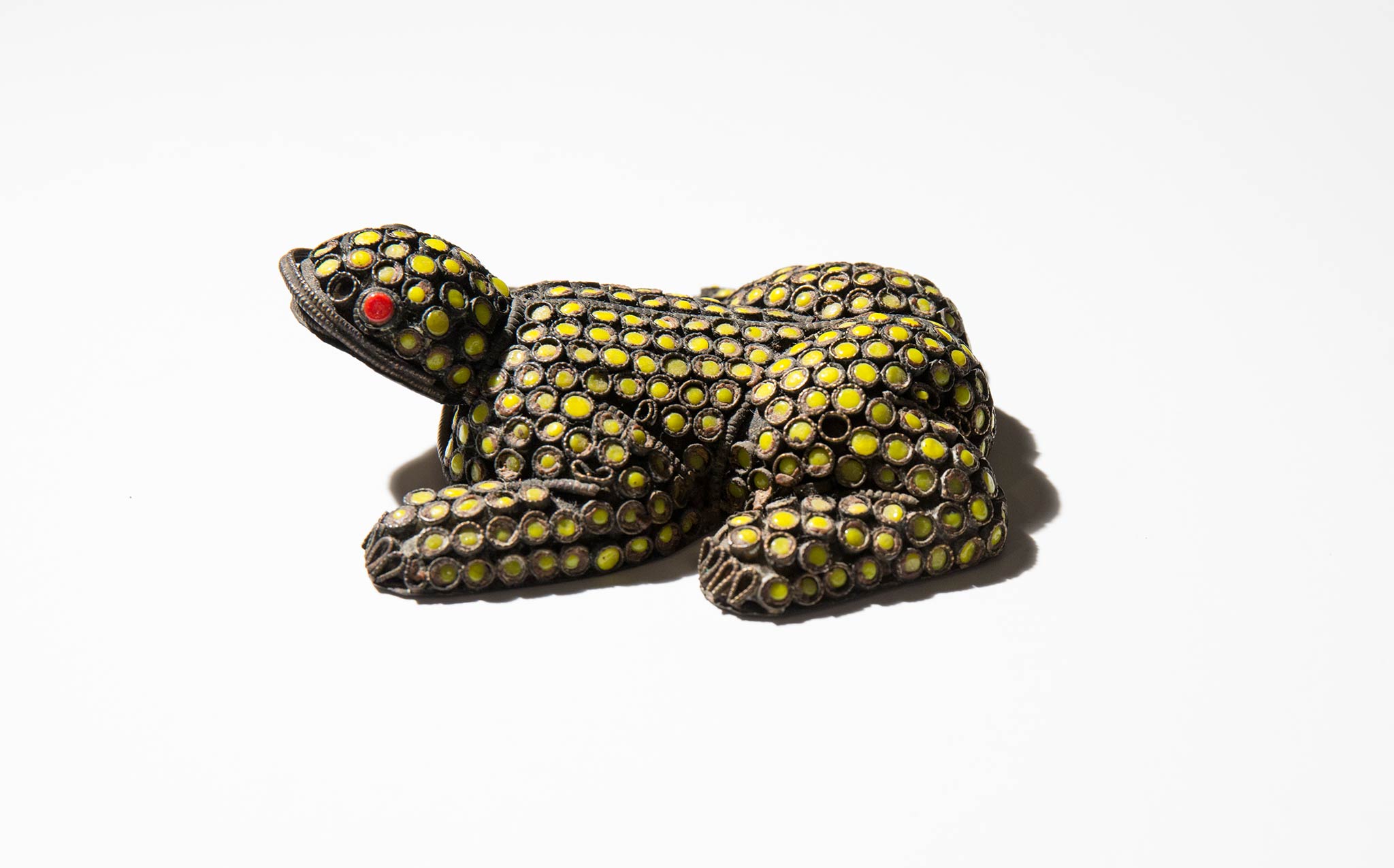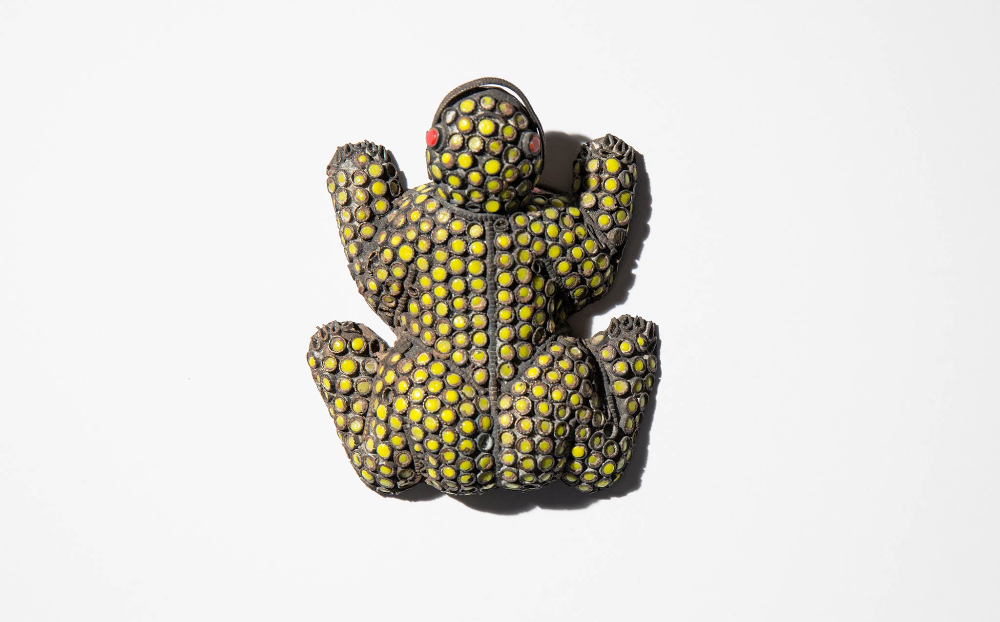 Primitive brass frog with bright pop spots and eyes.