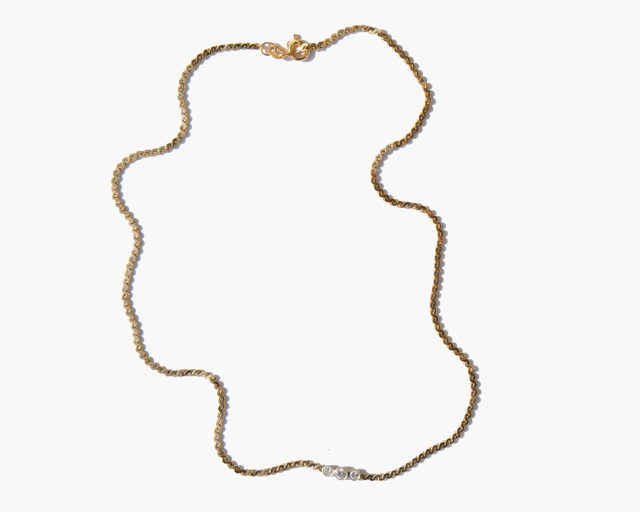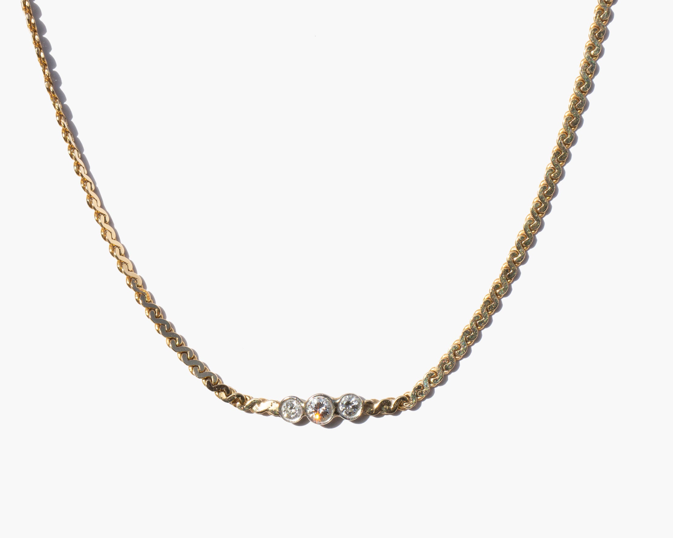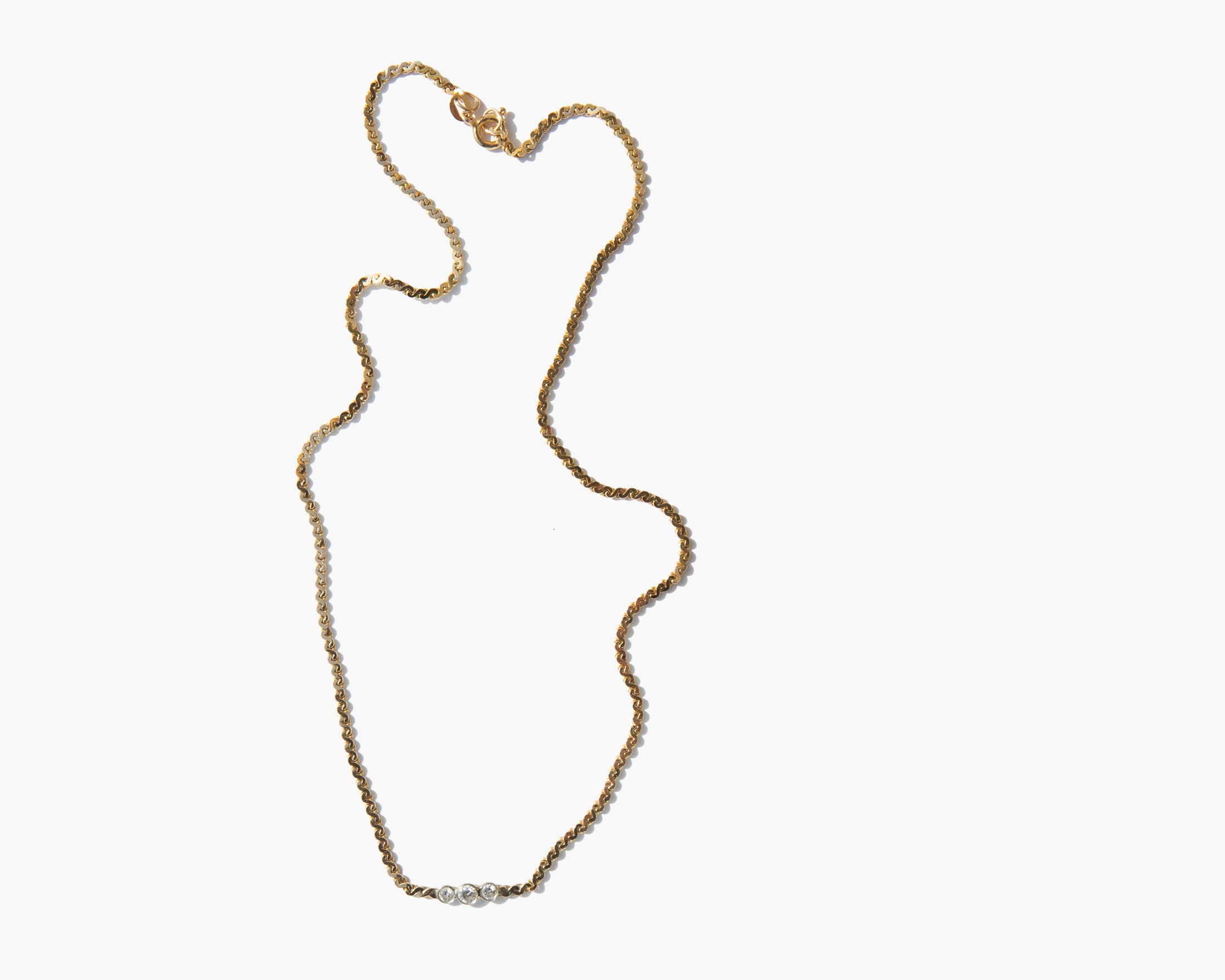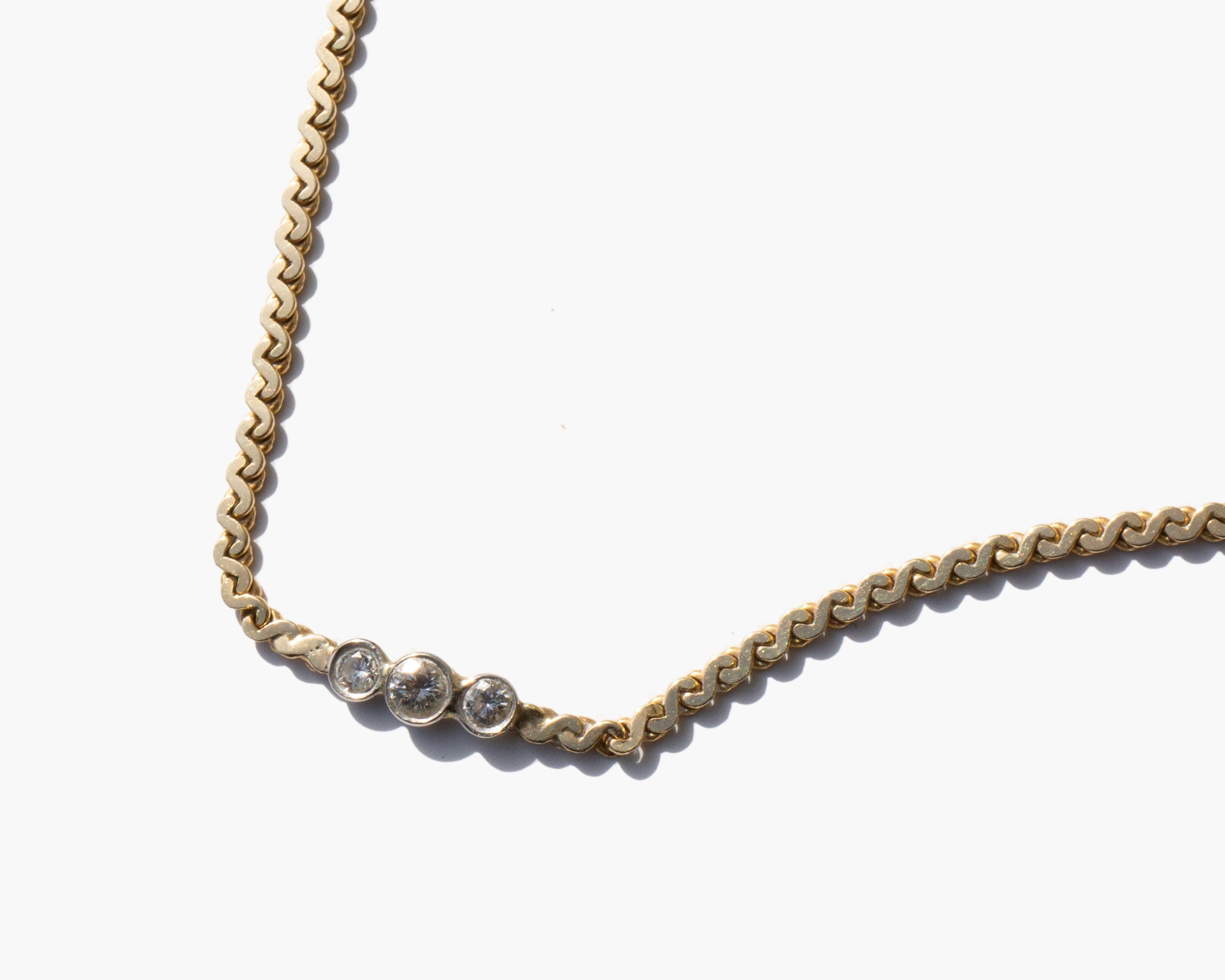 Elegant 14k gold choker necklace with diamonds at the neck.
