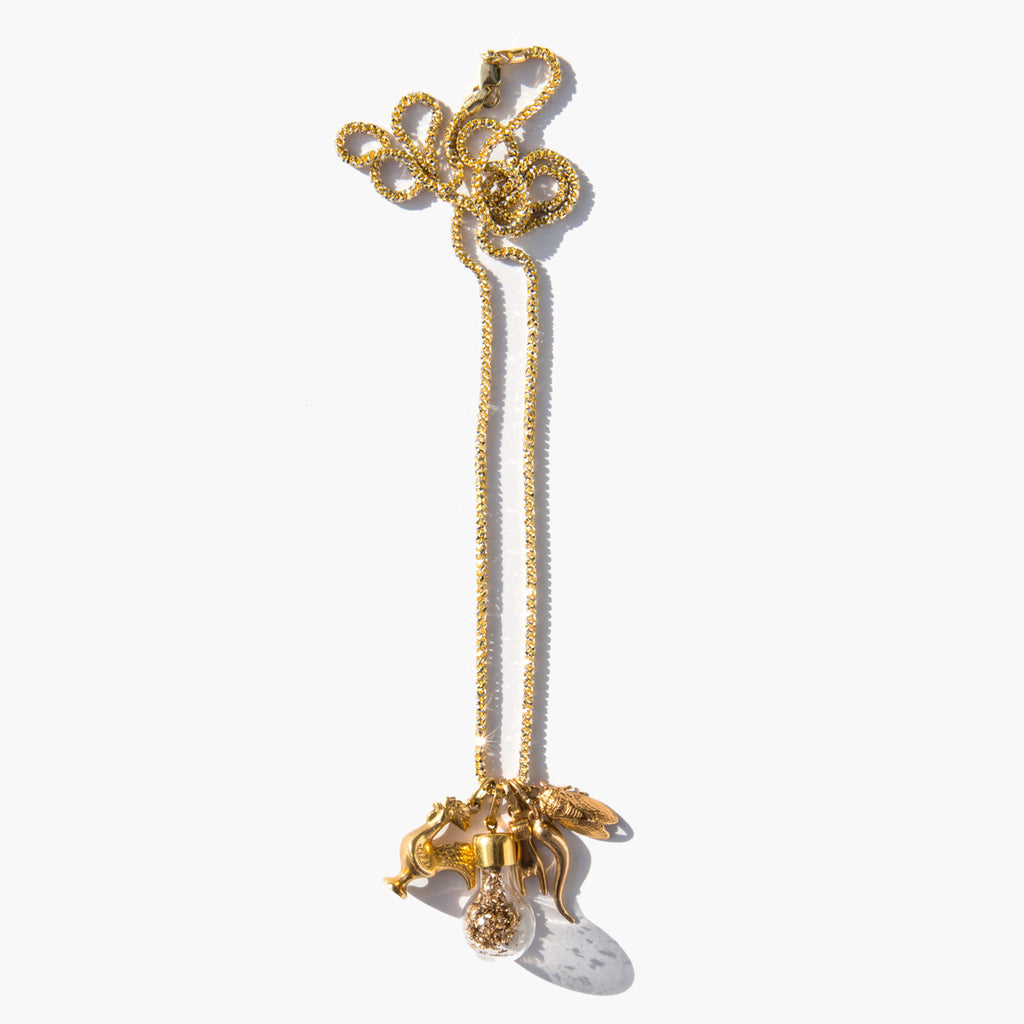 A faceted, sparkling solid 14k gold rope chain with an array of 14k gold charms for luck, prosperity, and transformation in the new year. The mano cornuto, or sign of the horns, and the corna, the Italian horn amulet, are used to ward off bad luck and the malocchio or evil eye, the rooster, a symbol of good luck and prosperity, the cicada, a representation of renewal, rebirth, and transformation, and a tiny glass vial of gold flake, an auspicious charm for wealth and success. **This item takes 1-2 weeks to ship, email info@kindredblack.com for more details**