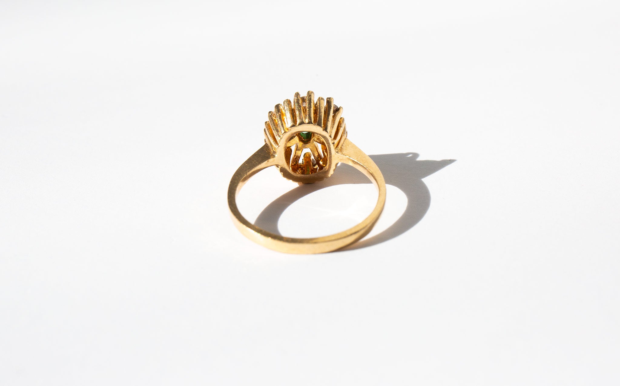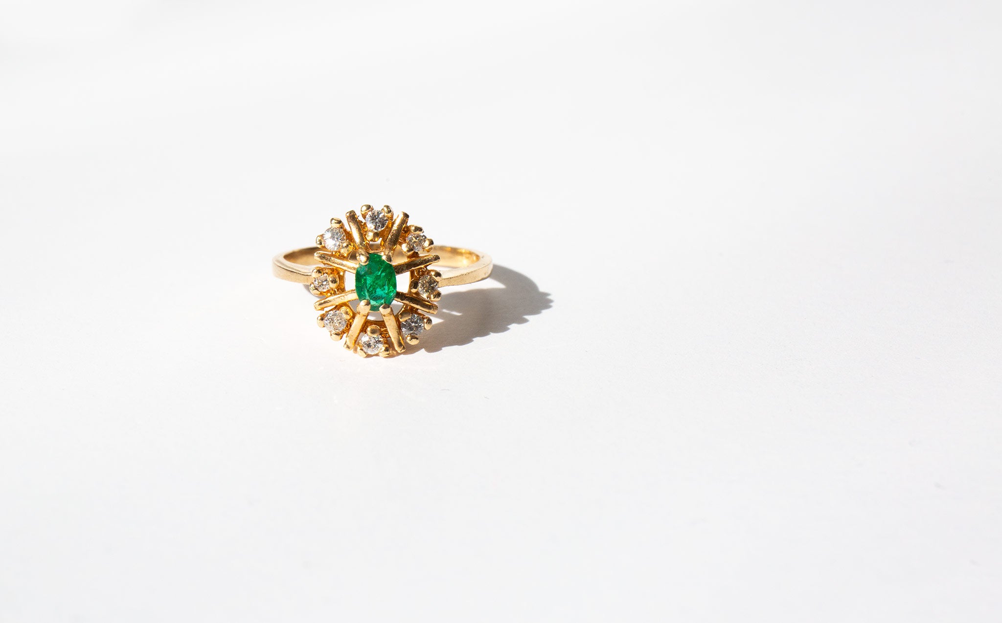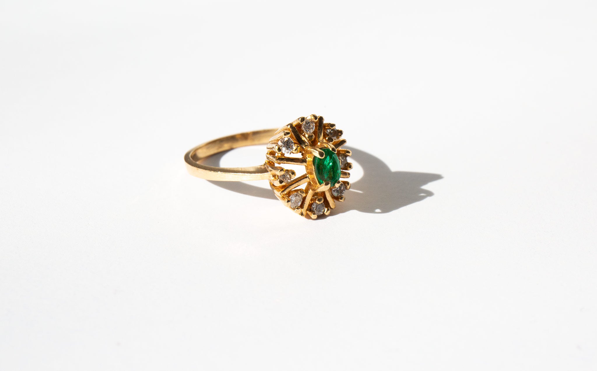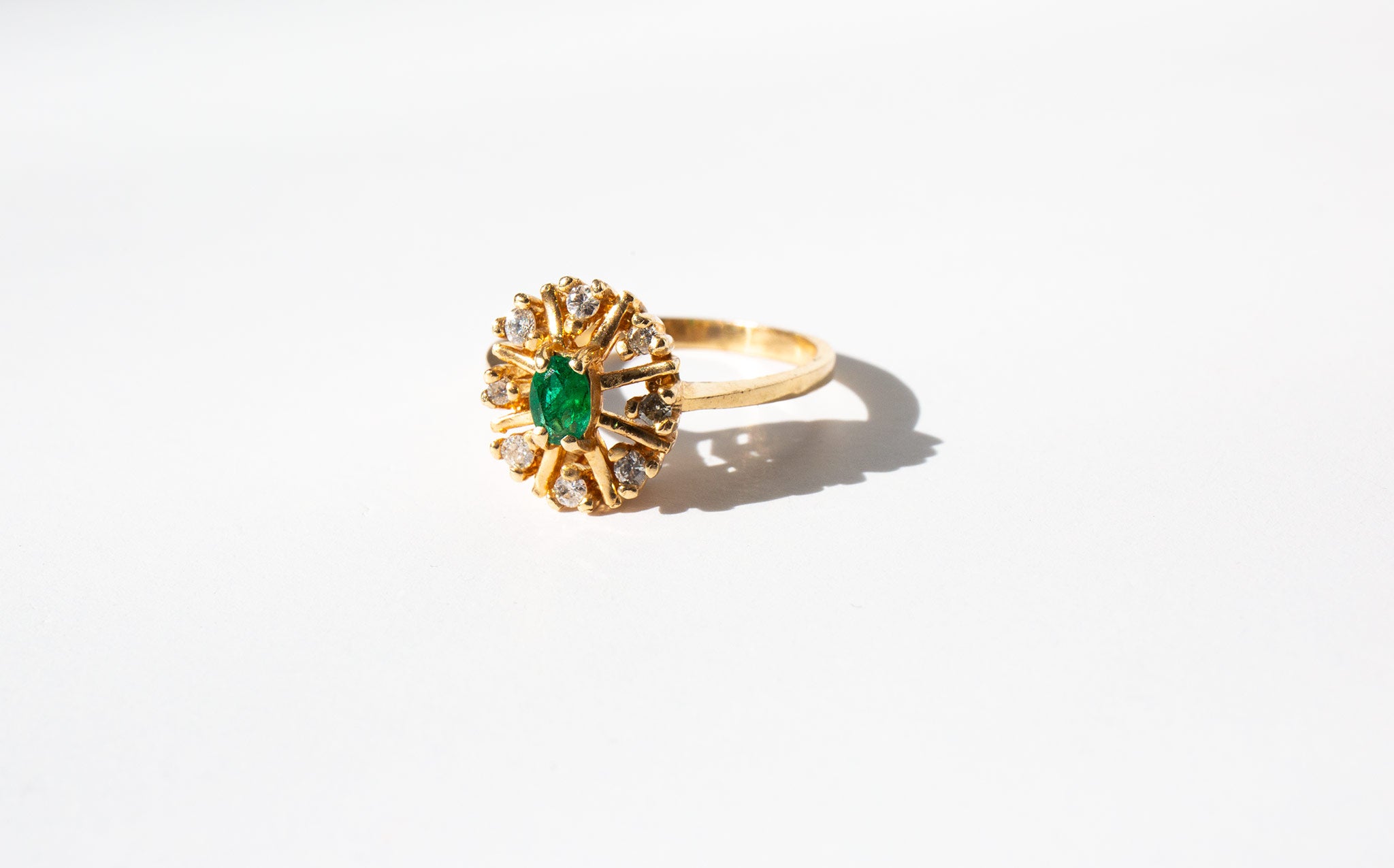 Pretty and colorful 14k gold ring of diamonds surrounding a center emerald.