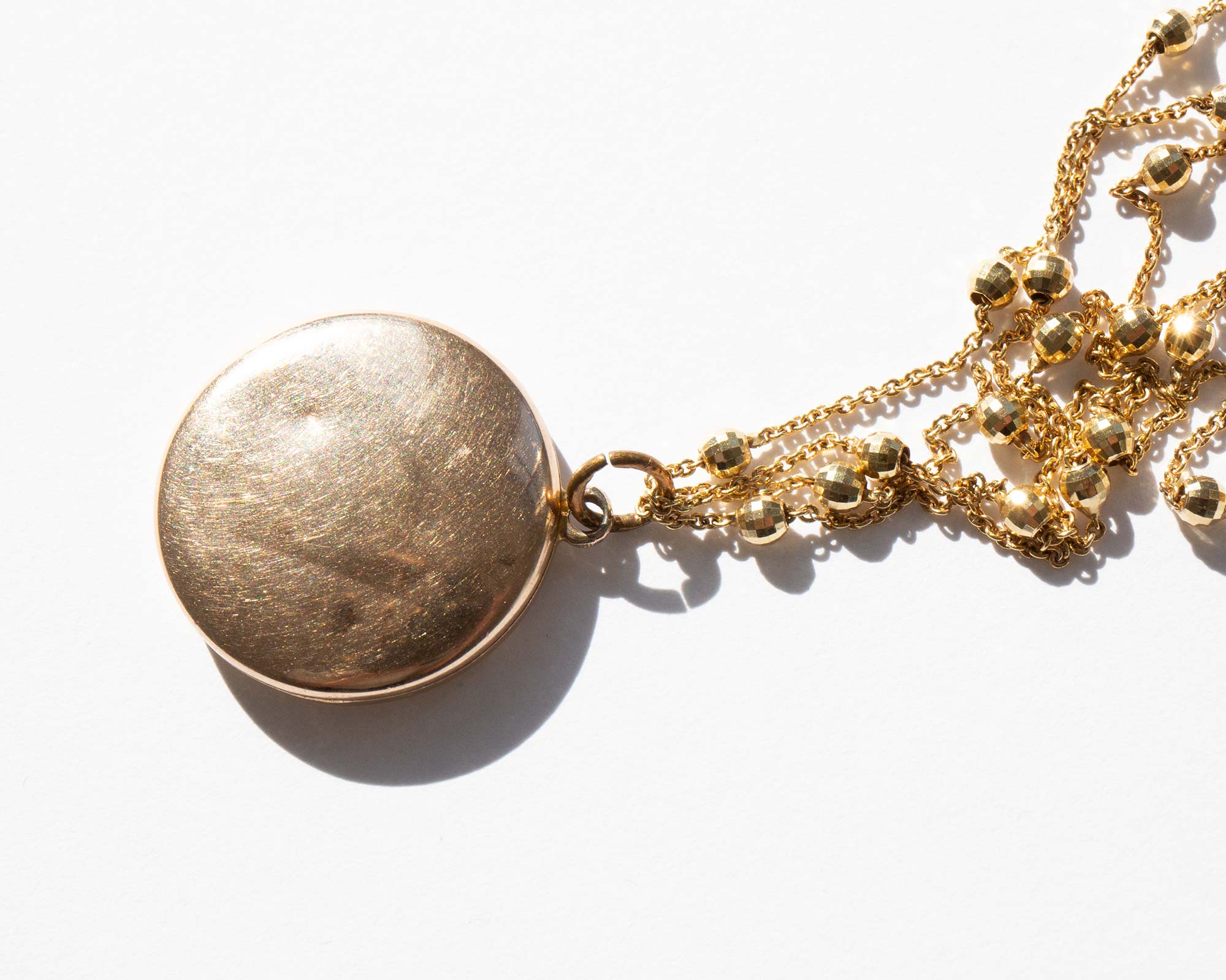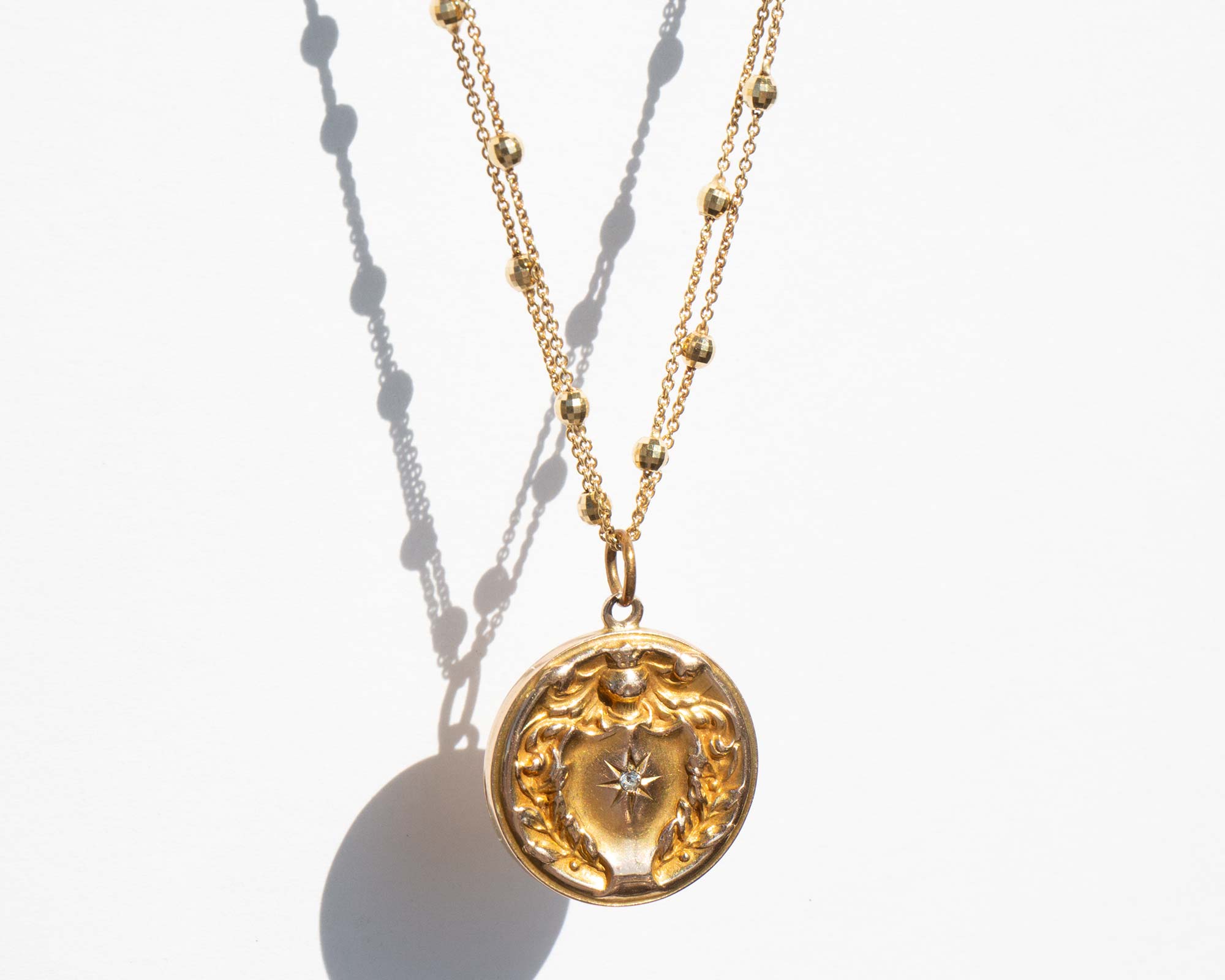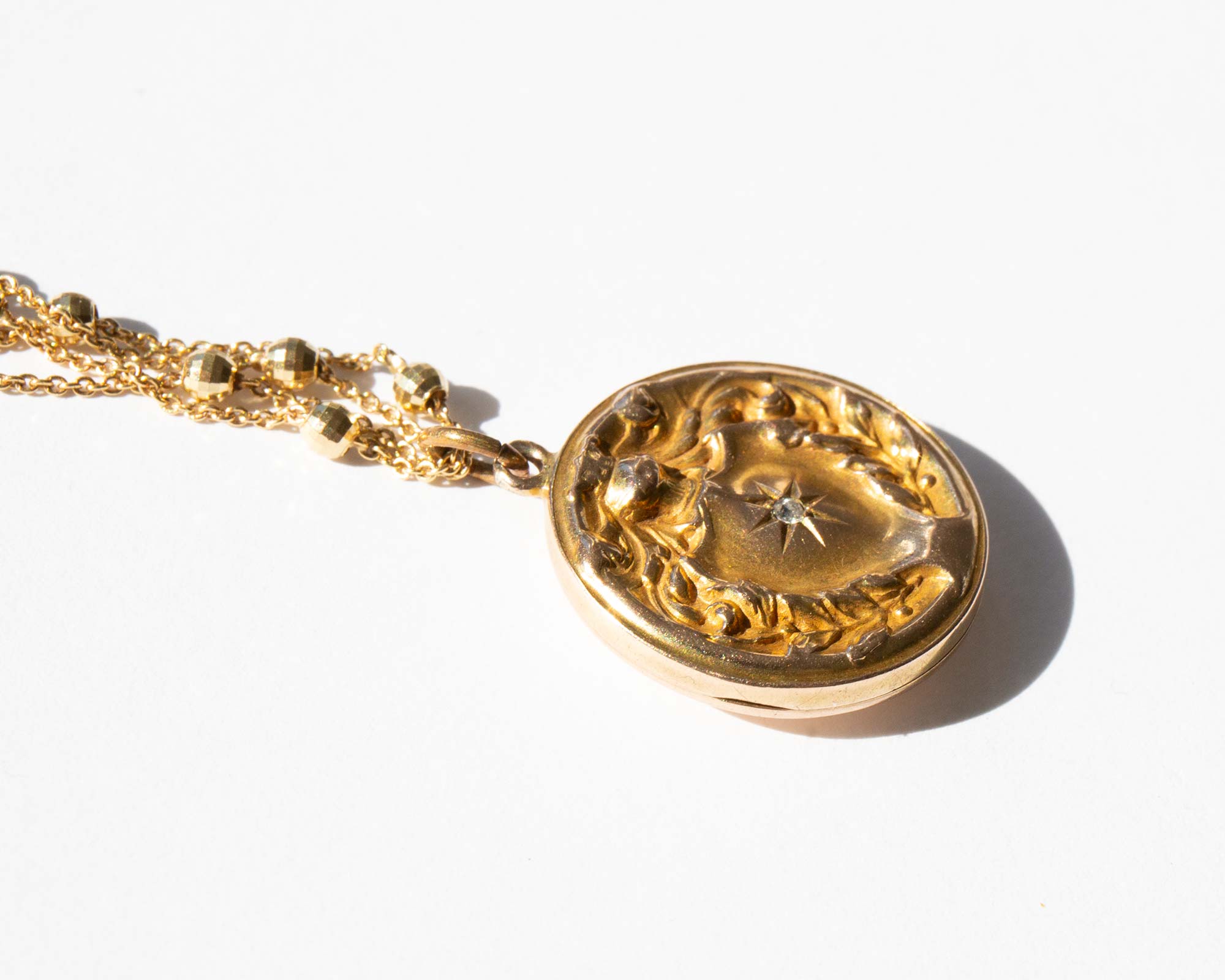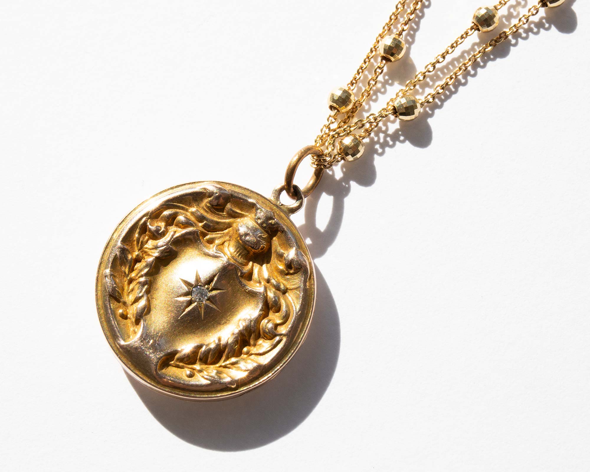 Antique Edwardian 14k gold and diamond locket on a sparkling vintage double Saturn chain.