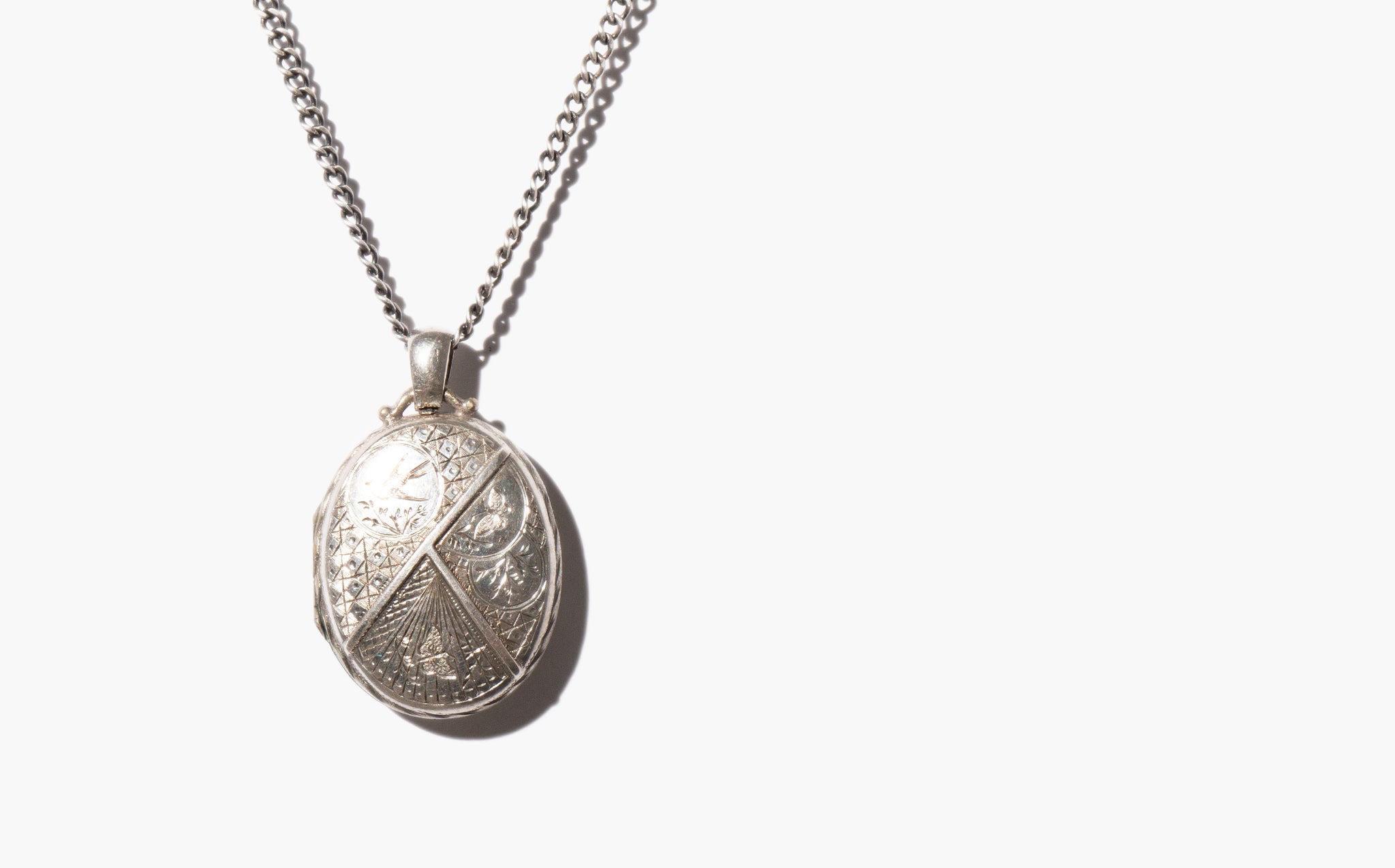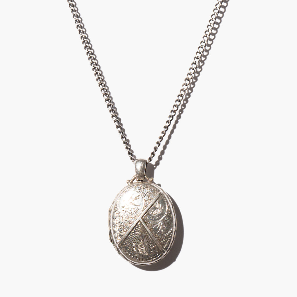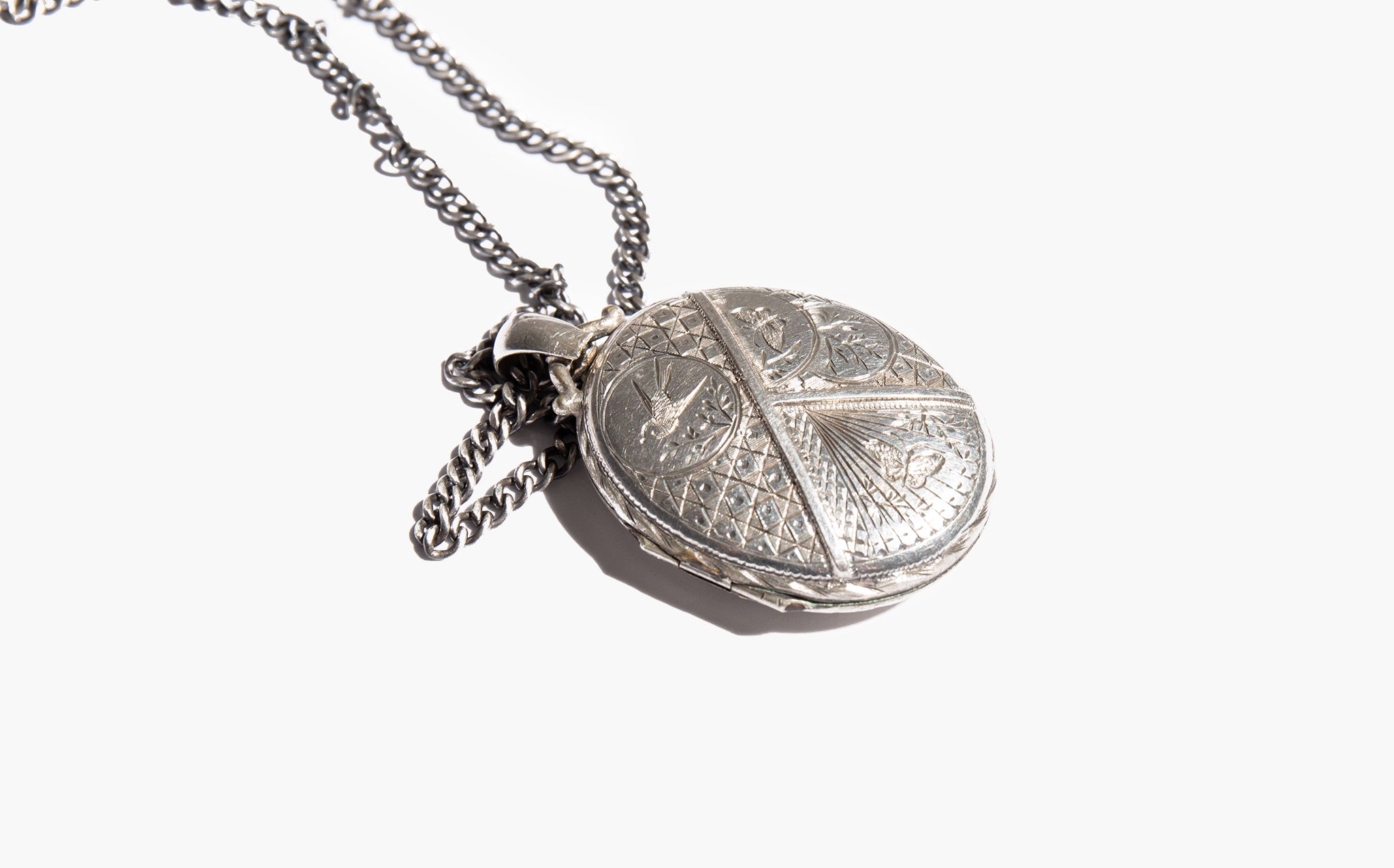 Intricately etched Aesthetic movement Victorian sterling silver locket on a sterling silver link chain.