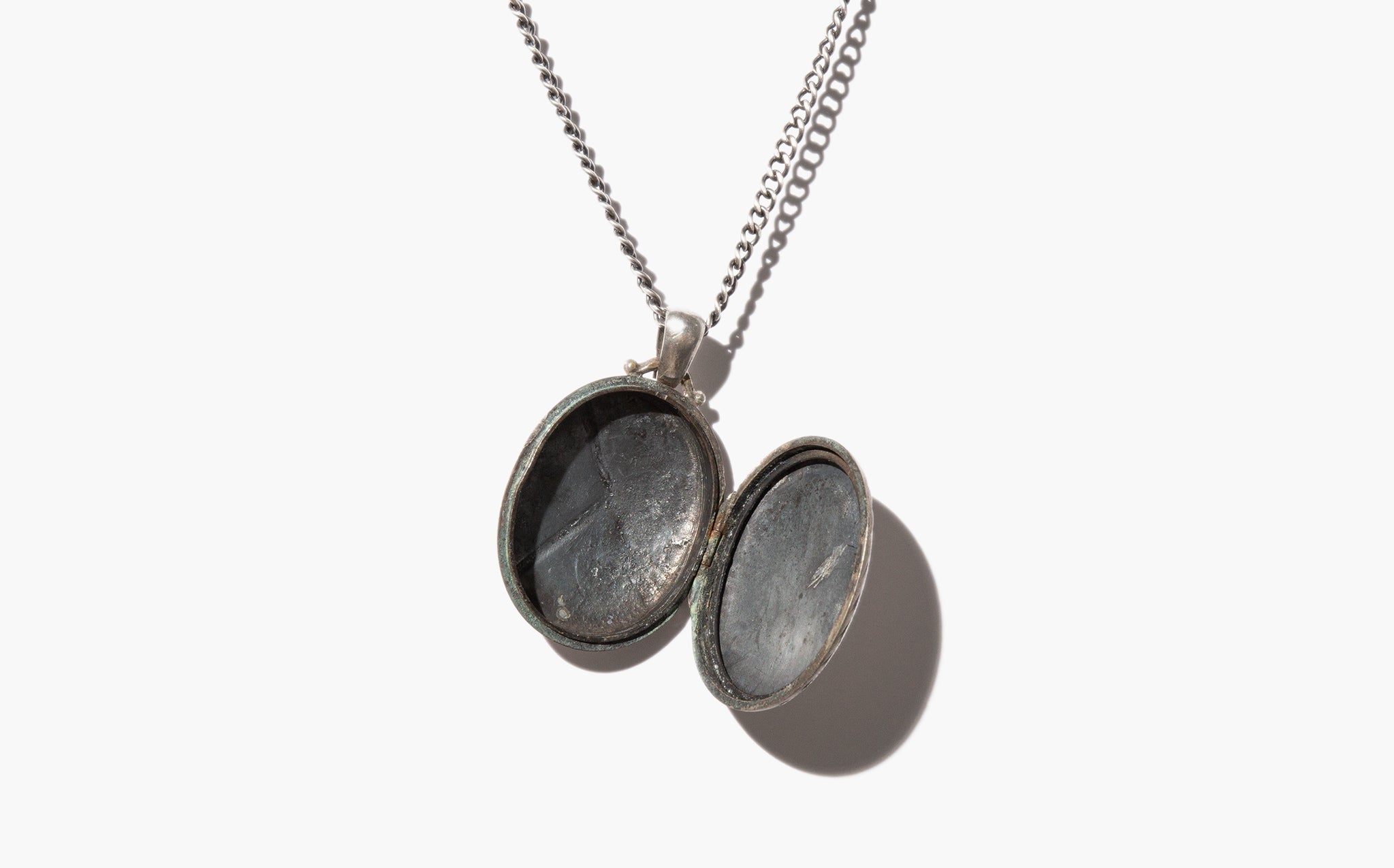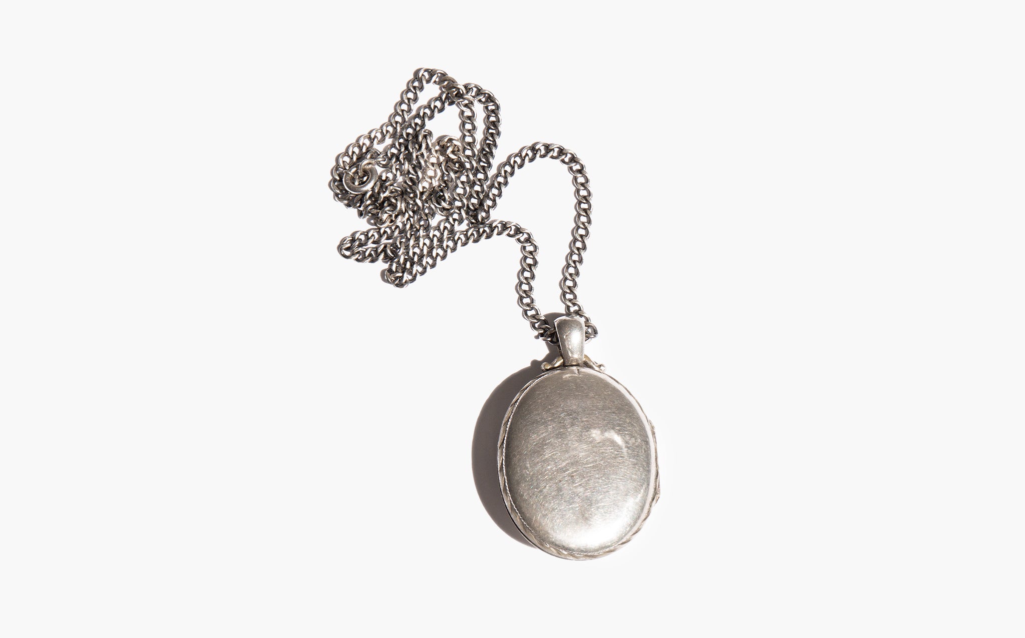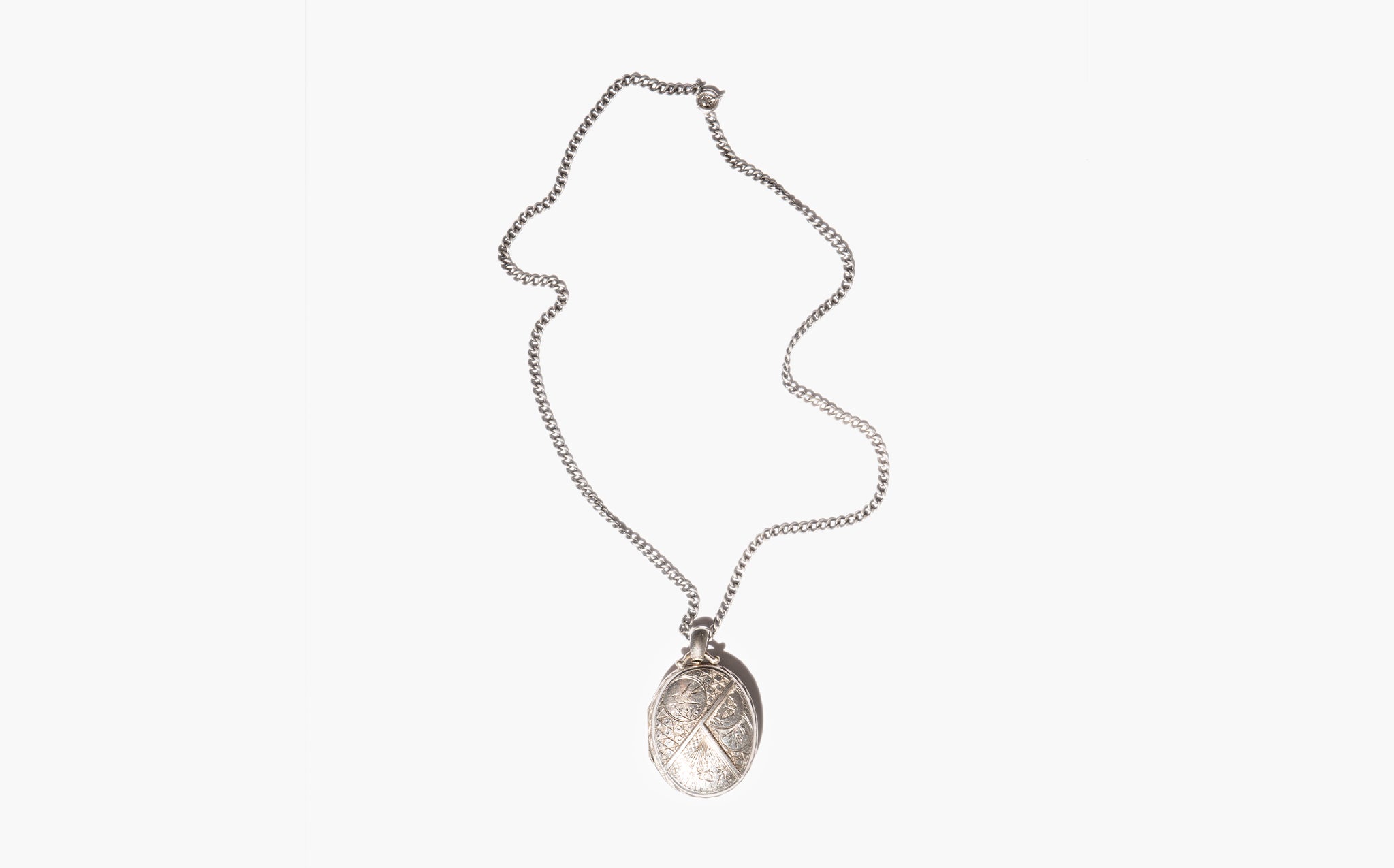 Intricately etched Aesthetic movement Victorian sterling silver locket on a sterling silver link chain.
