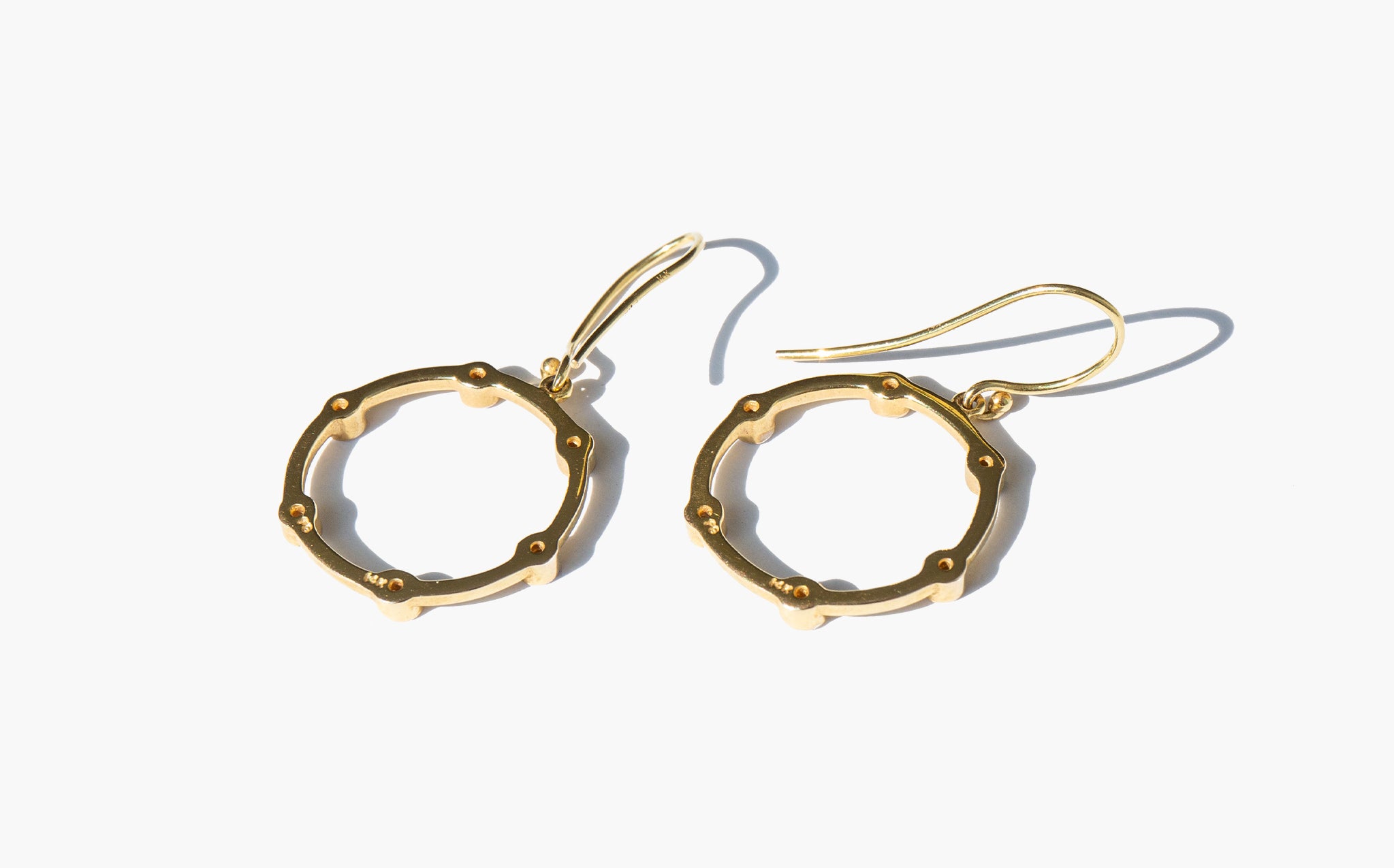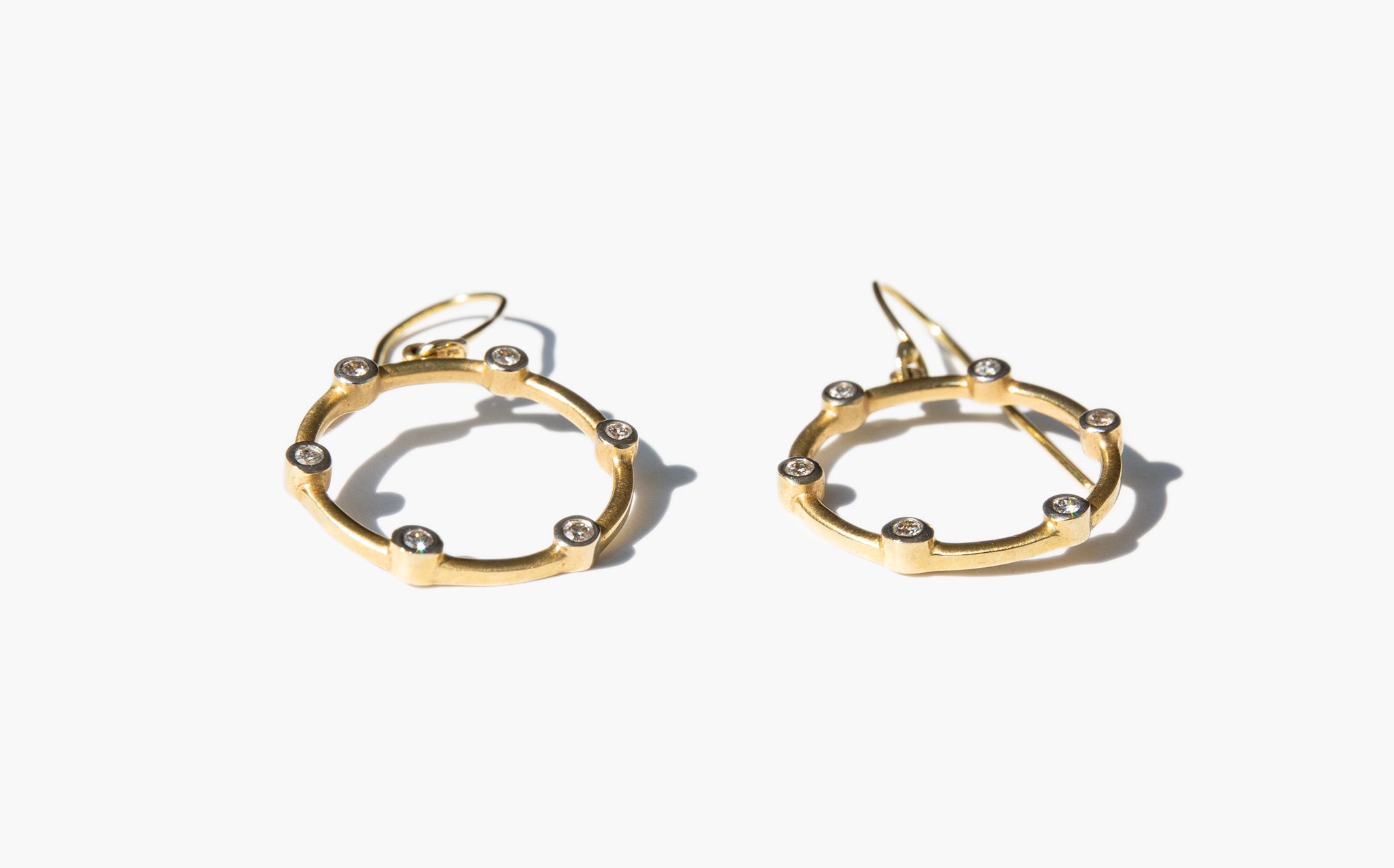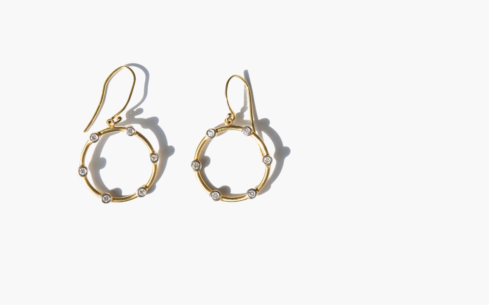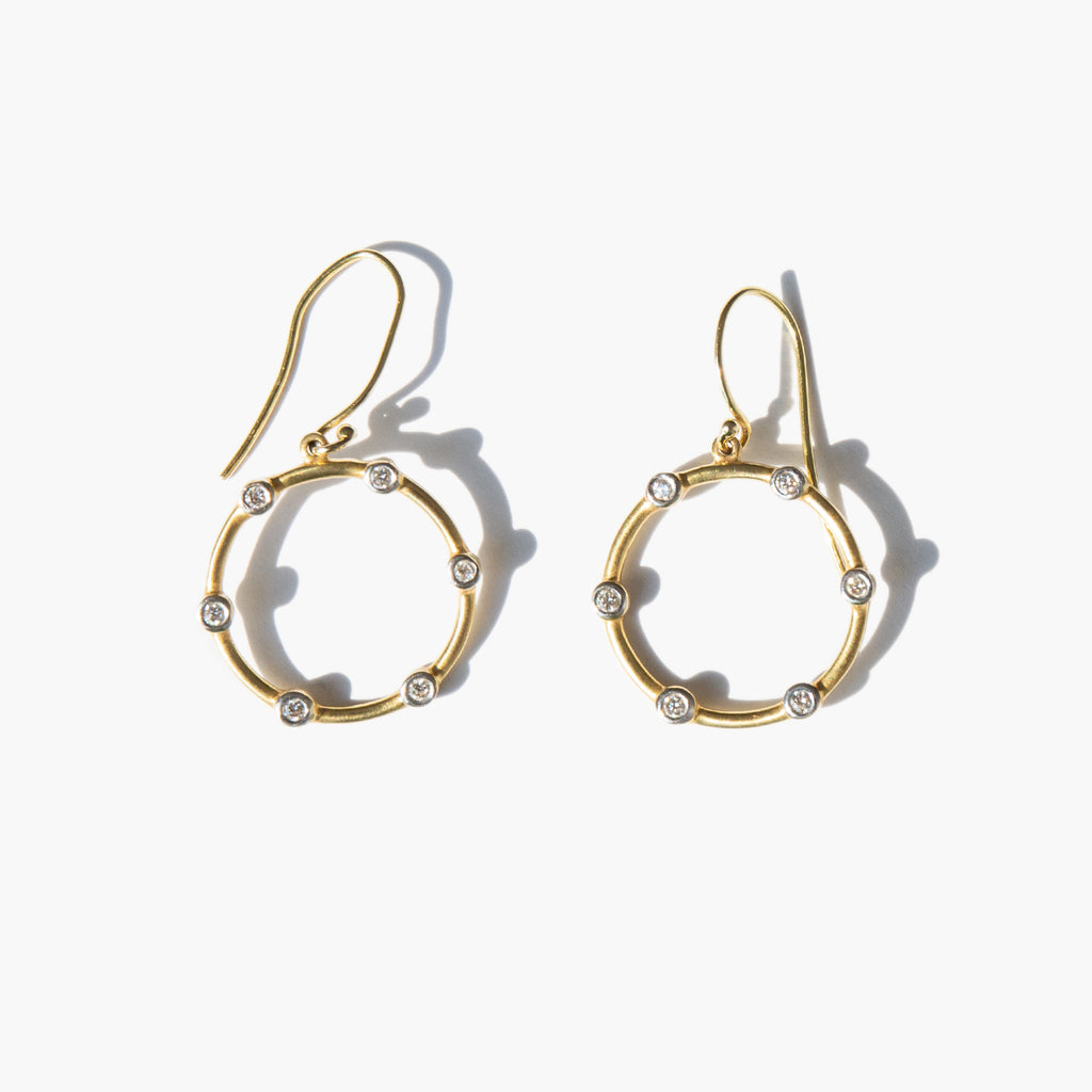 Dangling 18k gold hoop earrings studded with shimmering diamonds.