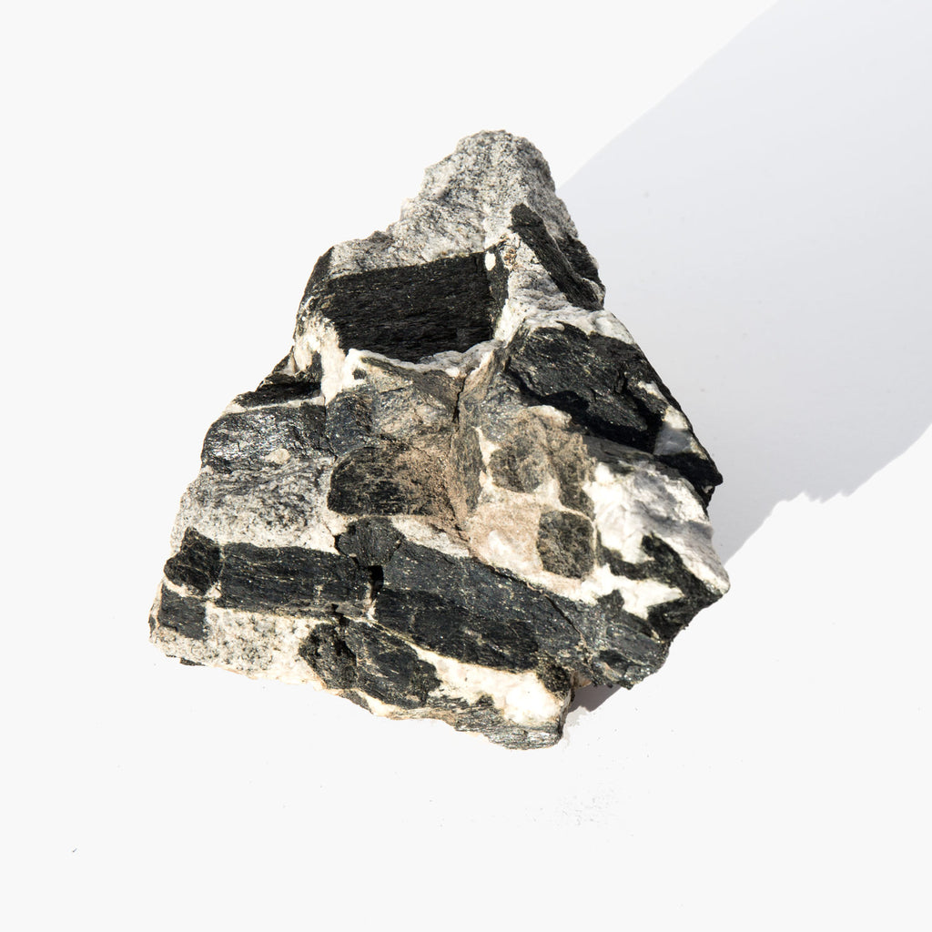 Lustrous black schorl, a form of black tourmaline, in quartz. Black tourmaline has been used since ancient times as a highly protective and negative energy deflecting stone. Schorl is also a stone that connects earth and the human spirit and is said to be a talisman that the ancients used to protect themselves from the spells of earthly demons.