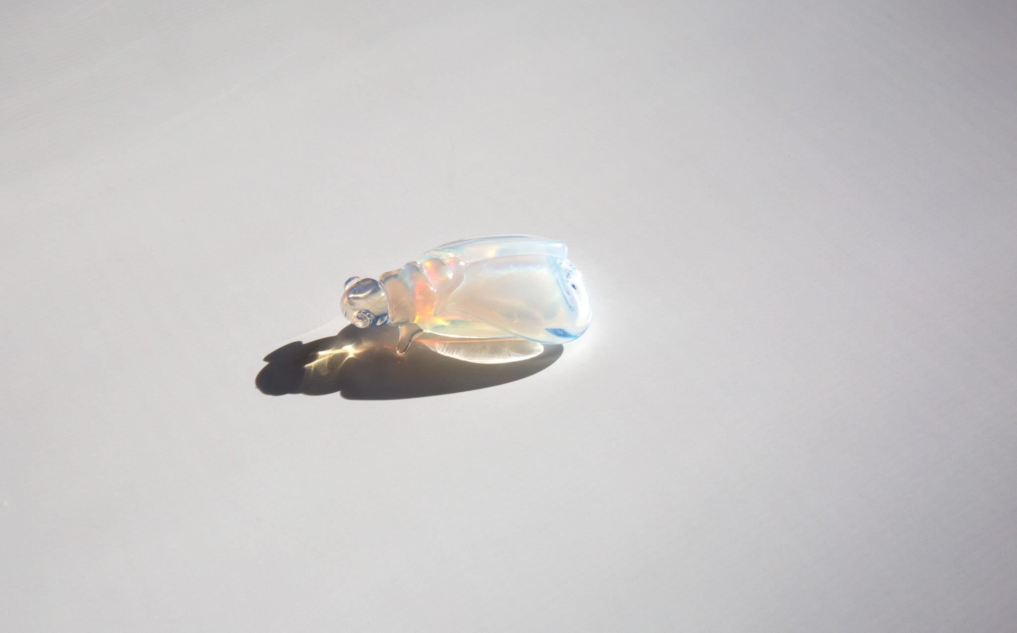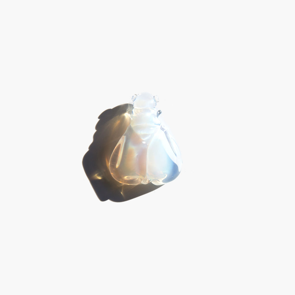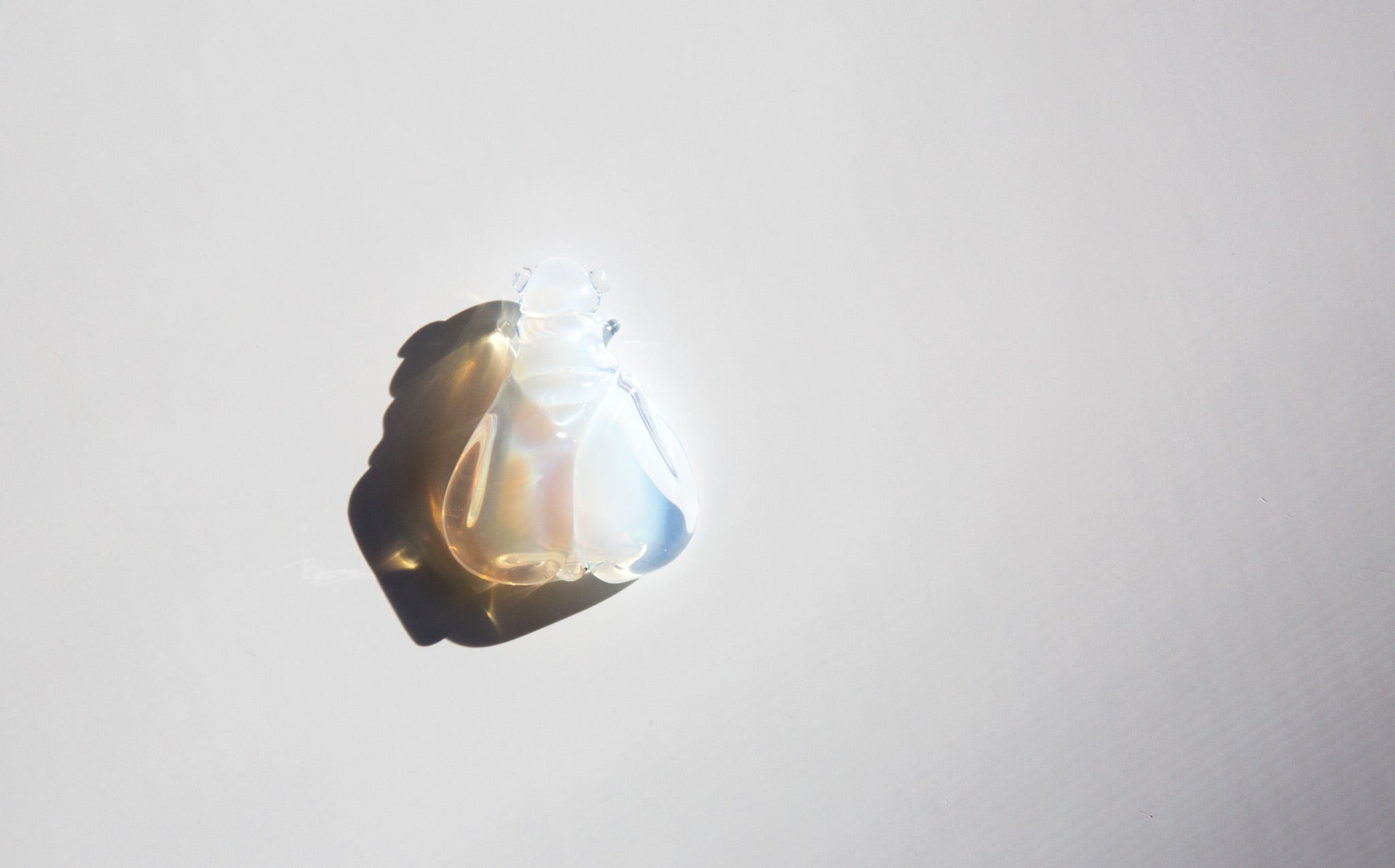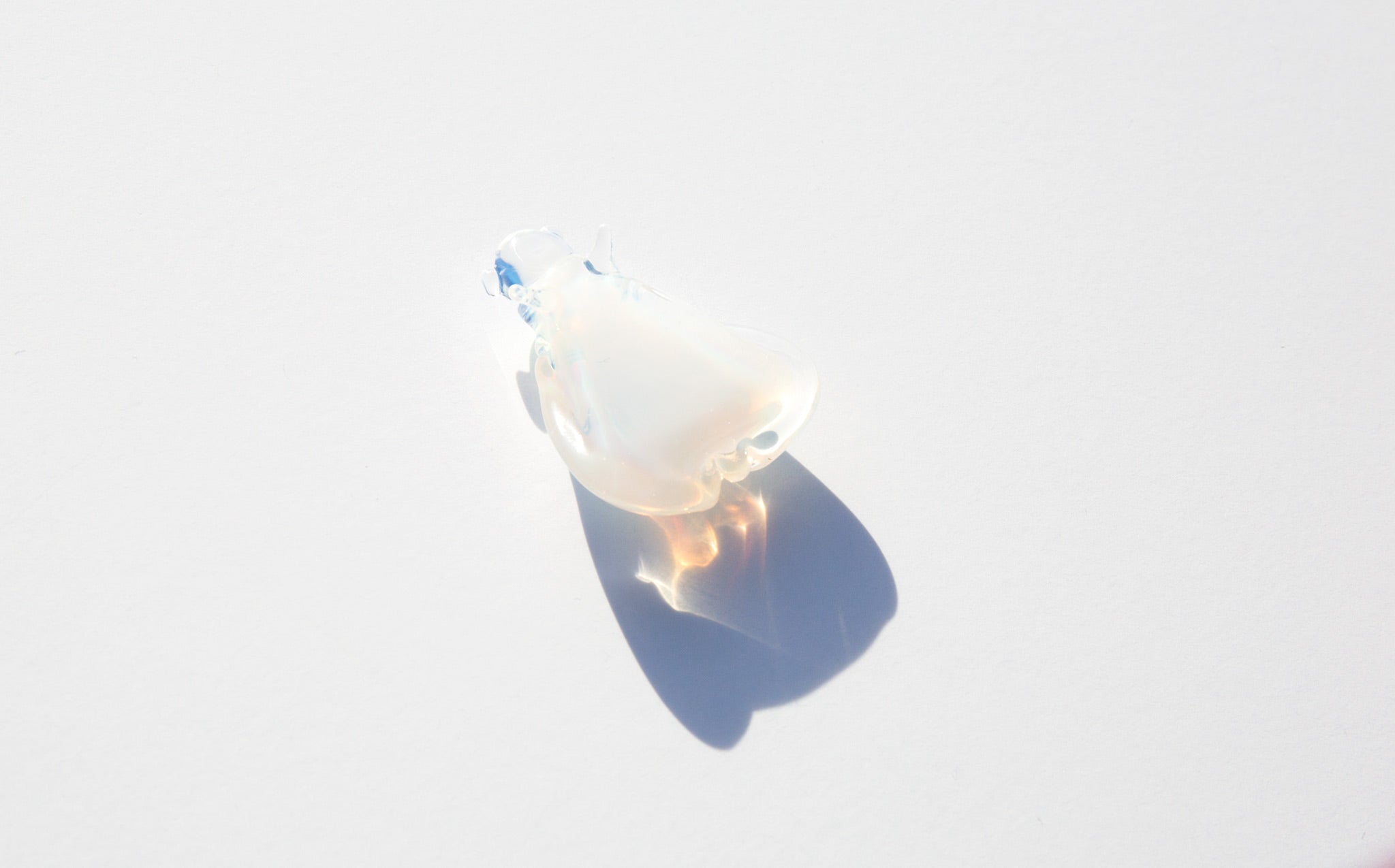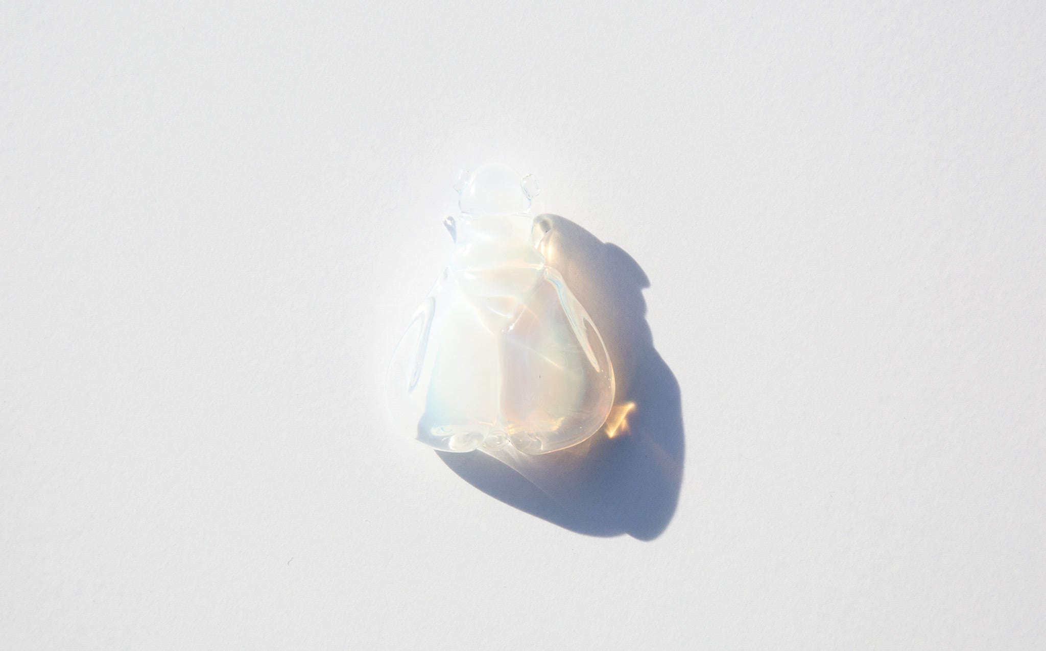 Hand blown opaline glass moth talisman. The moth is a warning – blind faith can be self destructive. Light entrances this small winged insect and it will doggedly move toward a dazzling bulb or fire with rare determination, despite the fact that it has no idea what lies beyond the bright flash. While inspirational in its persistence, the moth is often burned and thus destroyed because of its folly.
