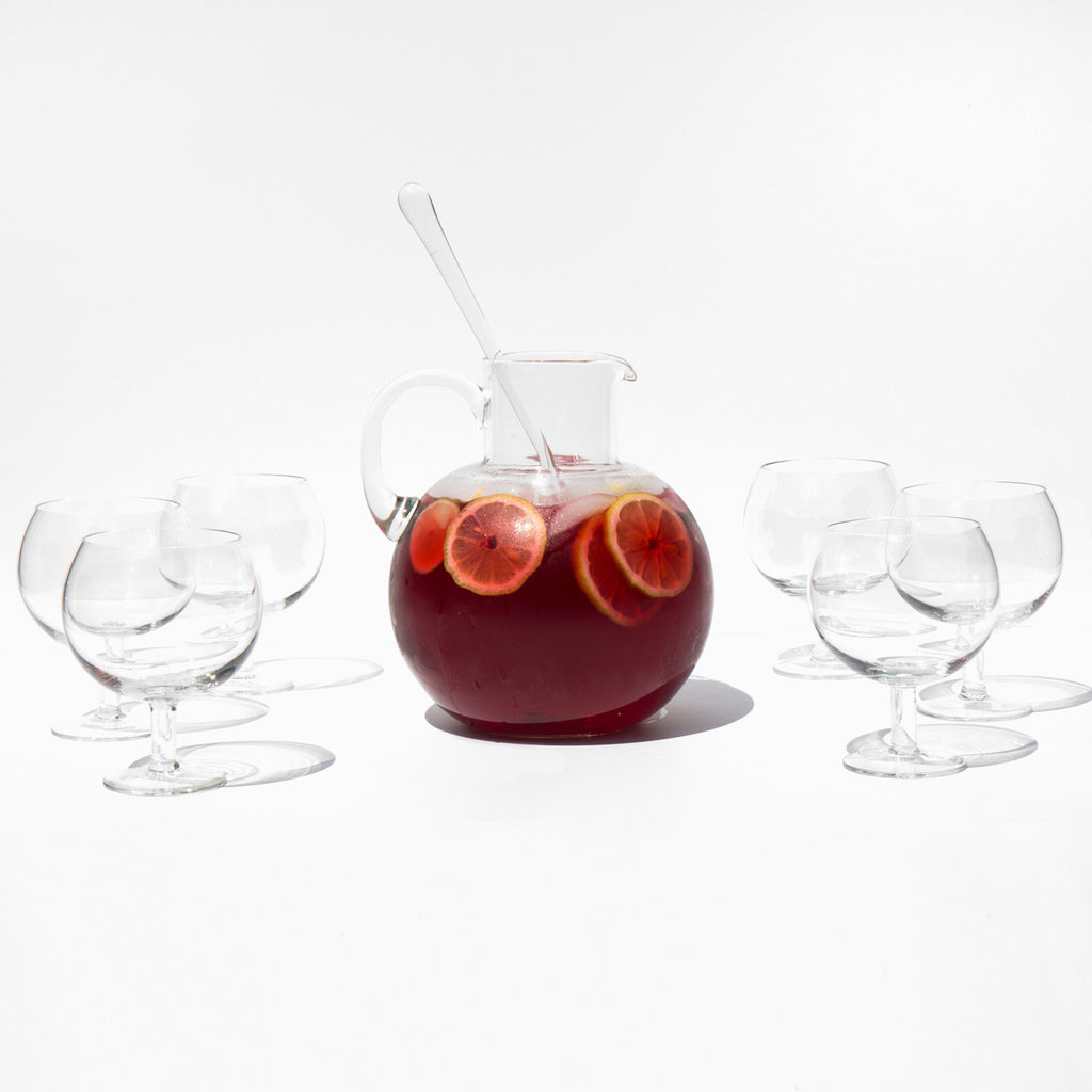 Seven-piece blown glass Sangria set, including six goblets and a handled pitcher with glass stirrer.