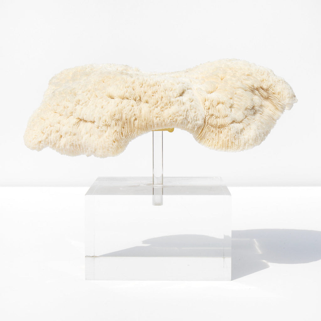 Vintage, large piece of creamy white bowl coral mounted on a block of lucite.