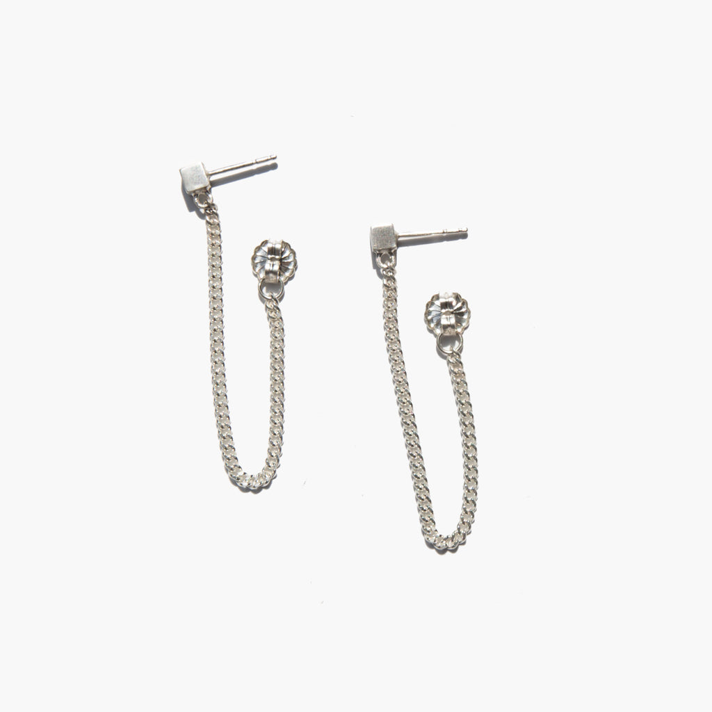 Modern, light sterling silver stud earrings with attached chain detailing.