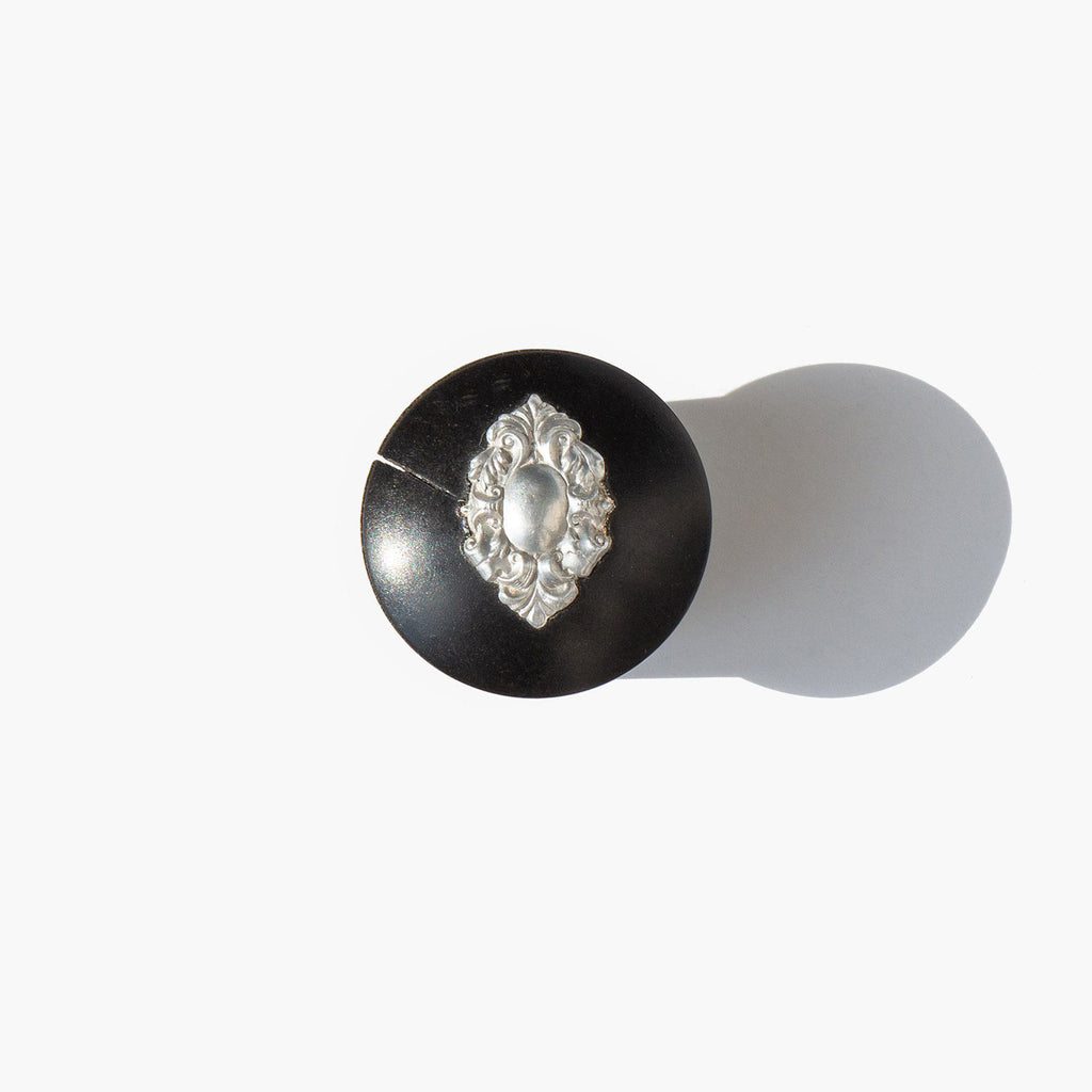 Tiny handmade ebony toned wood treasures box with a gleaming metal accent on the lid.