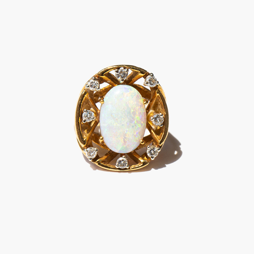 A spectacular piece – weighty 14k gold setting with a large, rainbow-hued opal surrounded in shimmering diamonds.