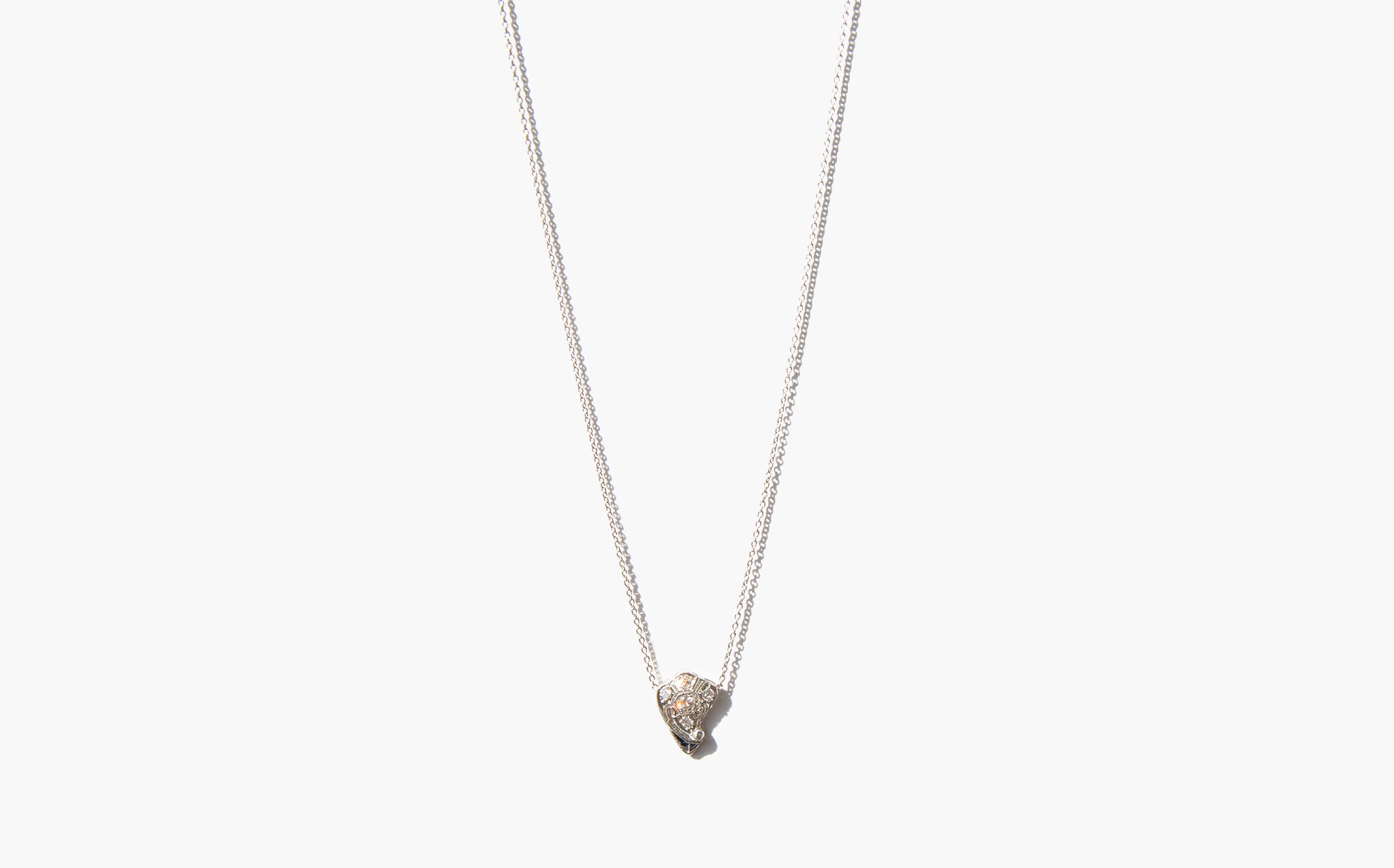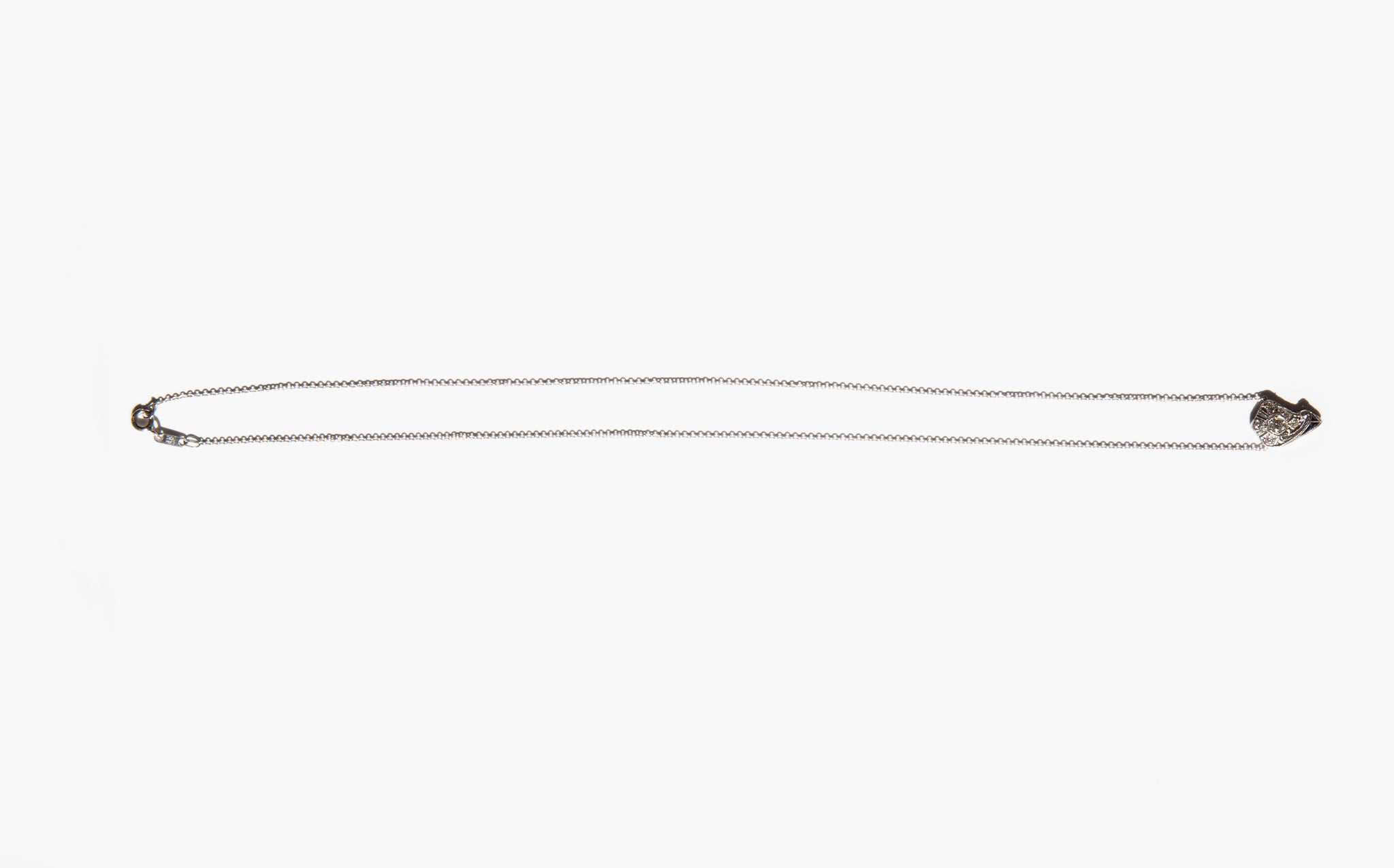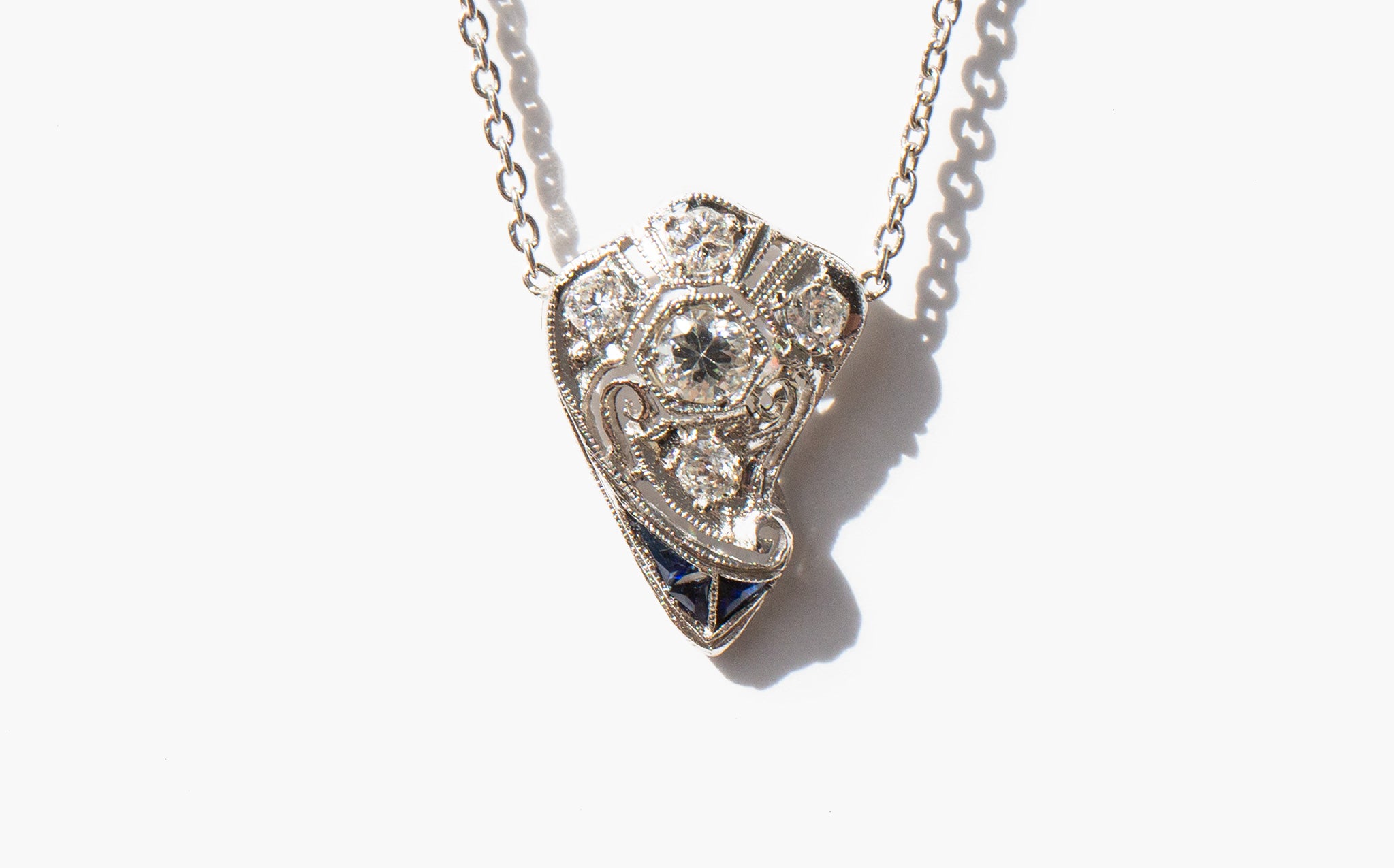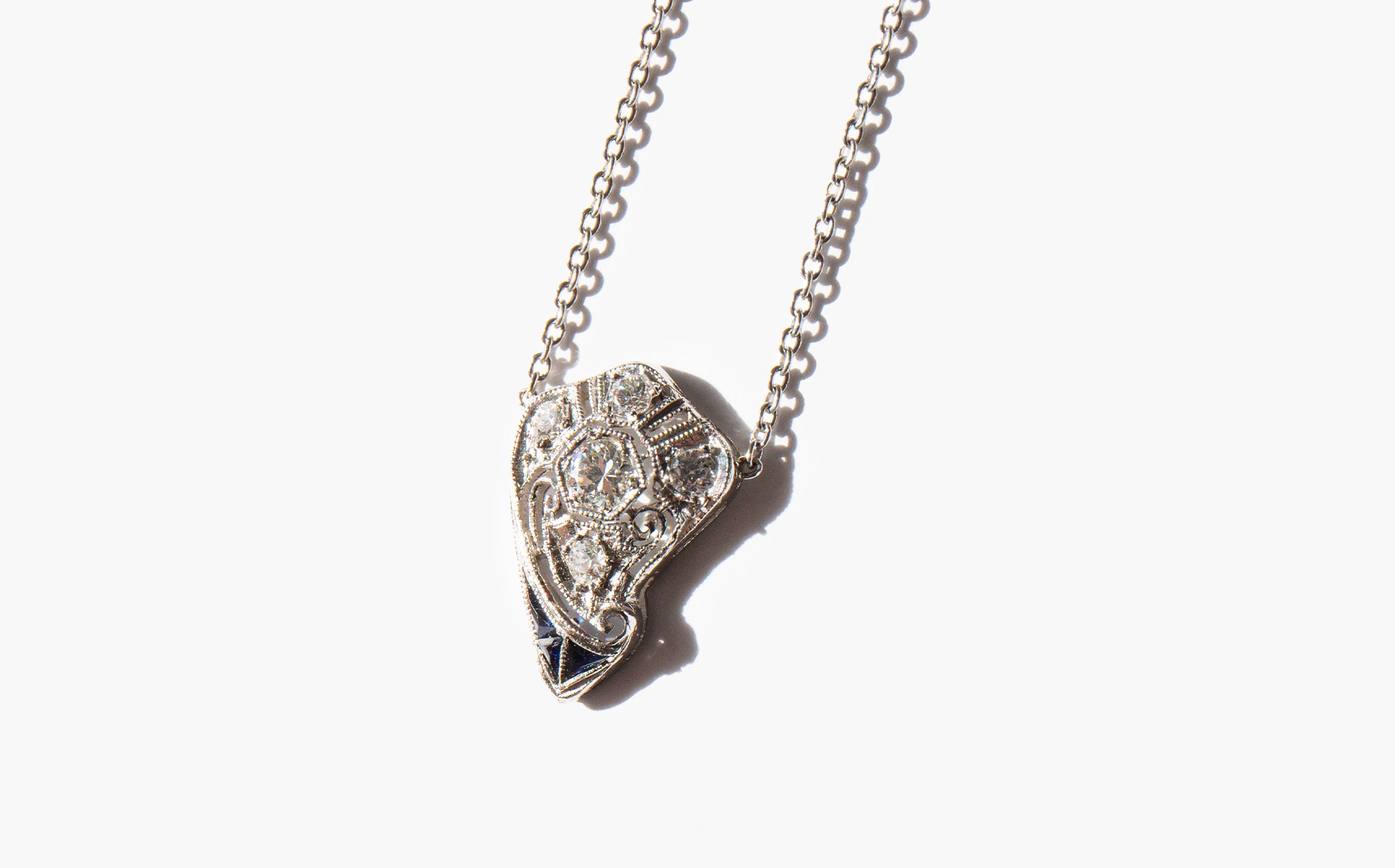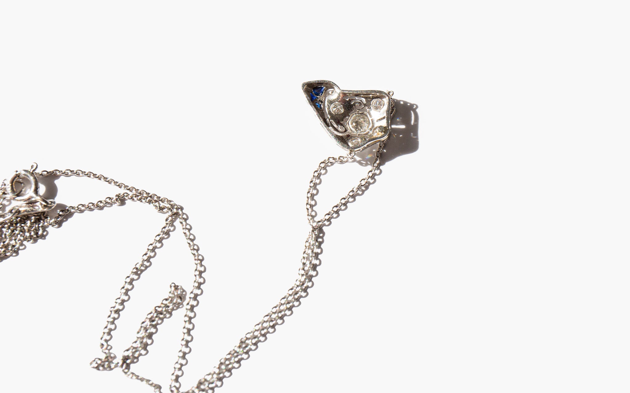 Antique 1920's diamond and sapphire encrusted platinum converted stickpin strung from sparkling 14k white gold chain.