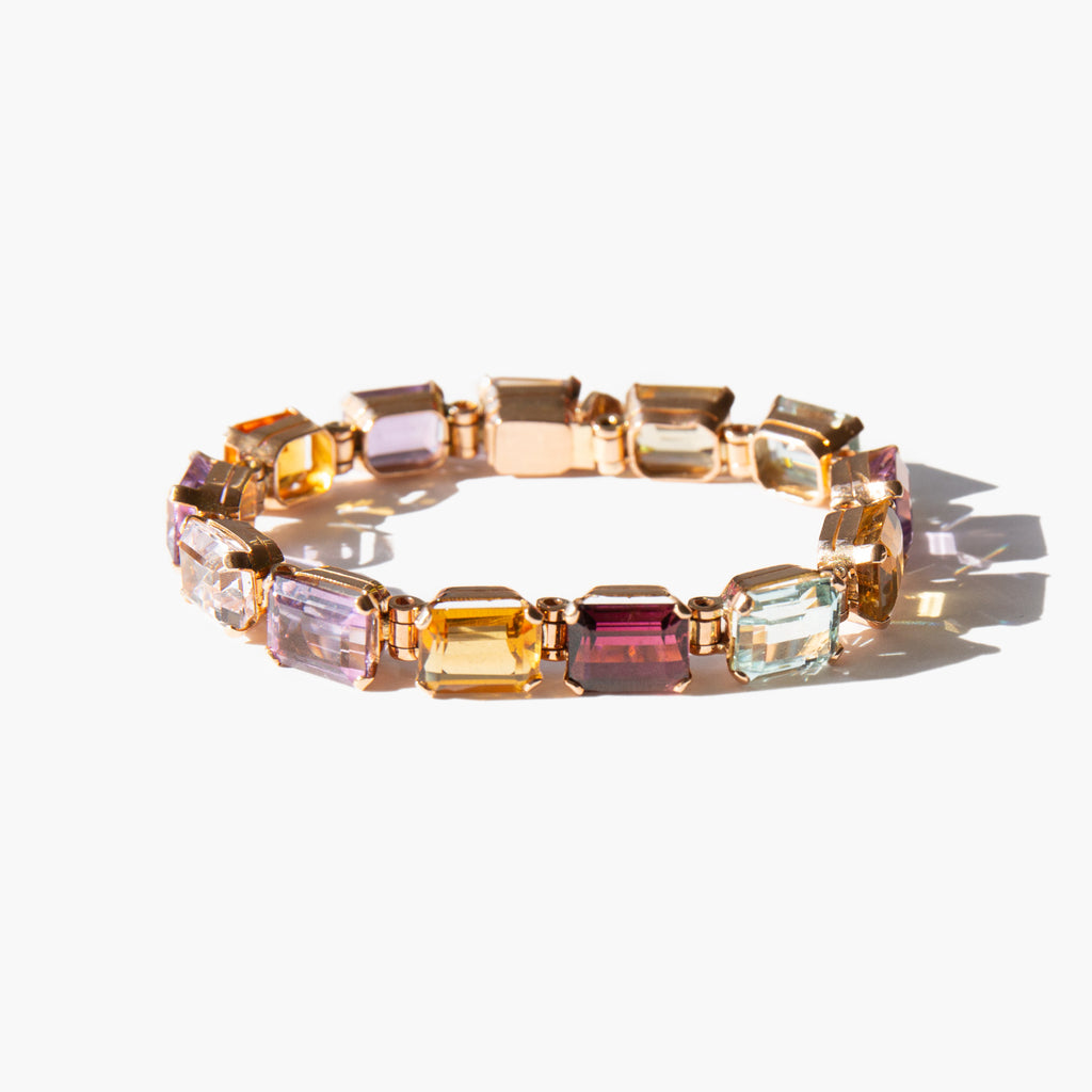 Mid century South American 18k peach gold bracelet with large, sparkling faceted stones including amethyst, citrine, rock crystal, topaz, and blue quartz.