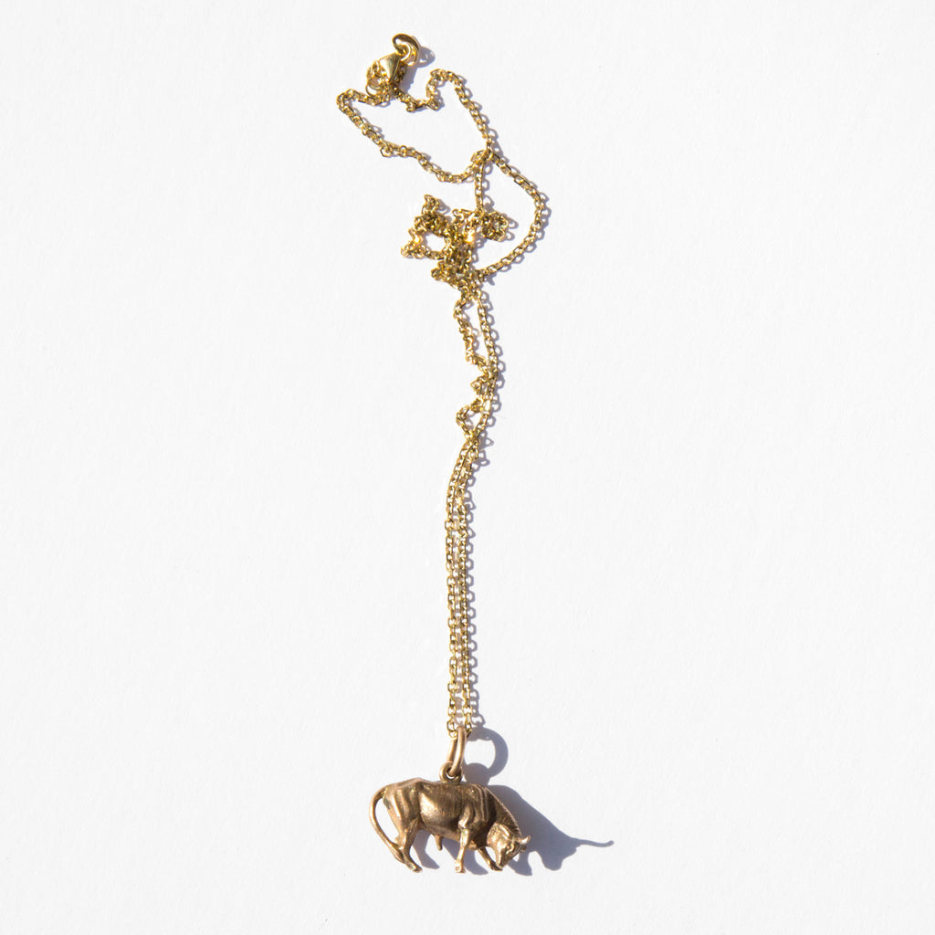 At its core, the embodiment of a strong will and an uncompromising nature but in some traditions, the bull is also a symbol of sexual vigor and stamina. Vintage 10k gold bull charm on a 14k gold chain.