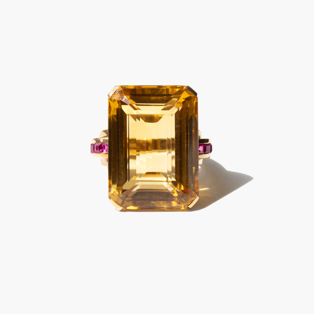 Spectacular mid-century cocktail ring of 14k gold with a large emerald cut citrine with ruby shoulders. Known as "the happy stone", citrine is said to dispel negative energy and bring happiness and positivity into the life of the those who wear it.