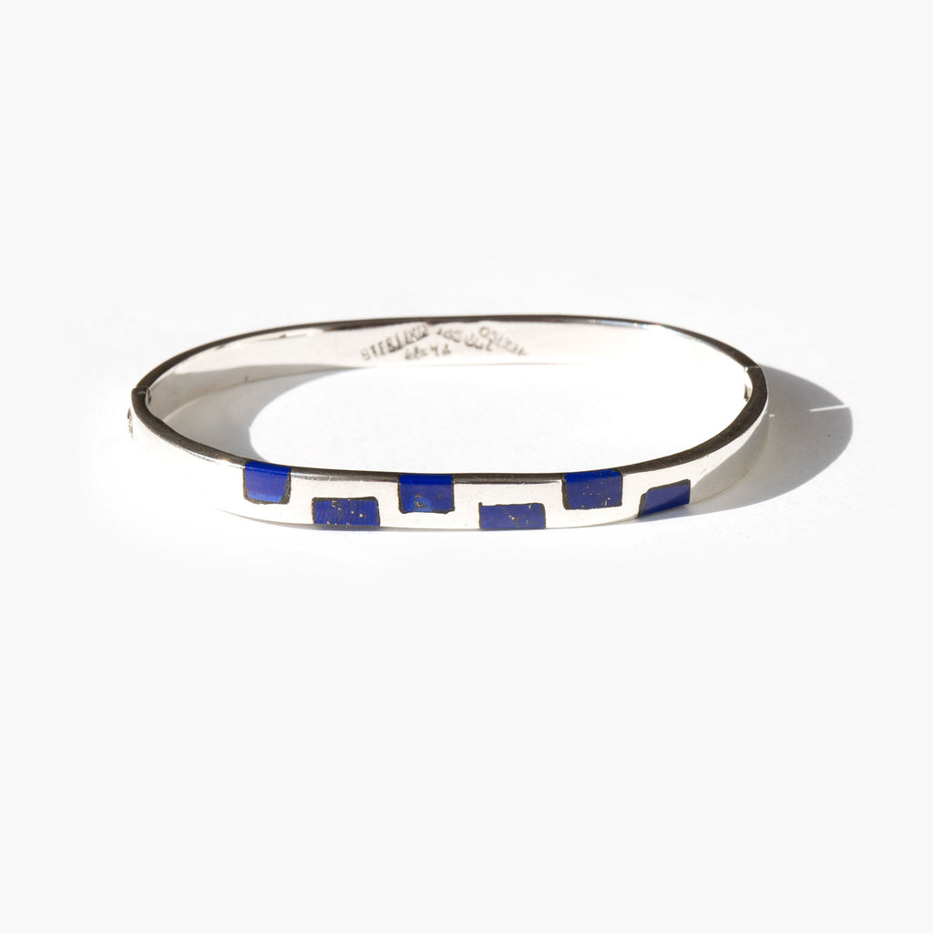 Mexican sterling silver and lapis bangle bracelet. Lapis is thought to be protective against spirits of the darkness and all manner of evil but is also used to release stress and encourage peace and harmony.