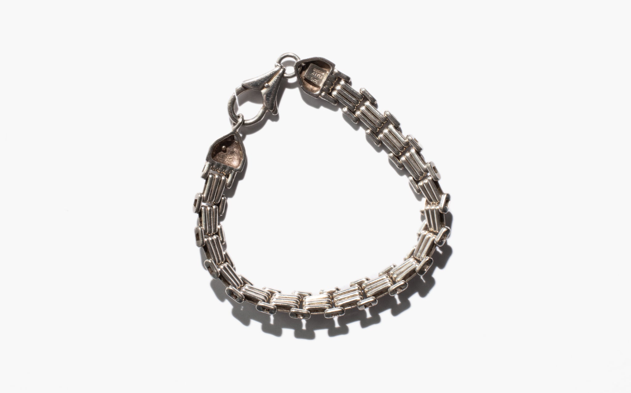 Geometric link sterling silver bracelet with intricate ends and catch.