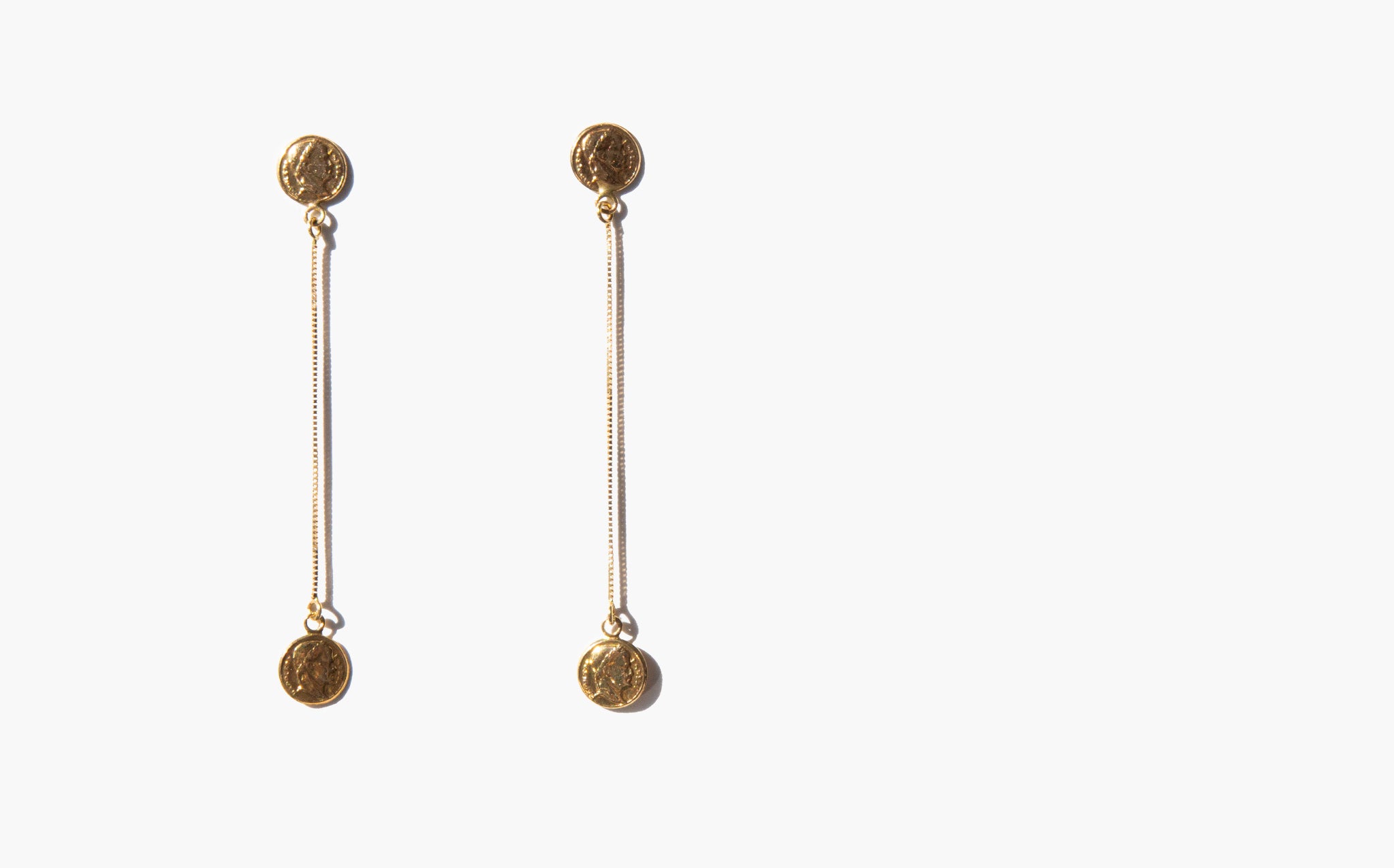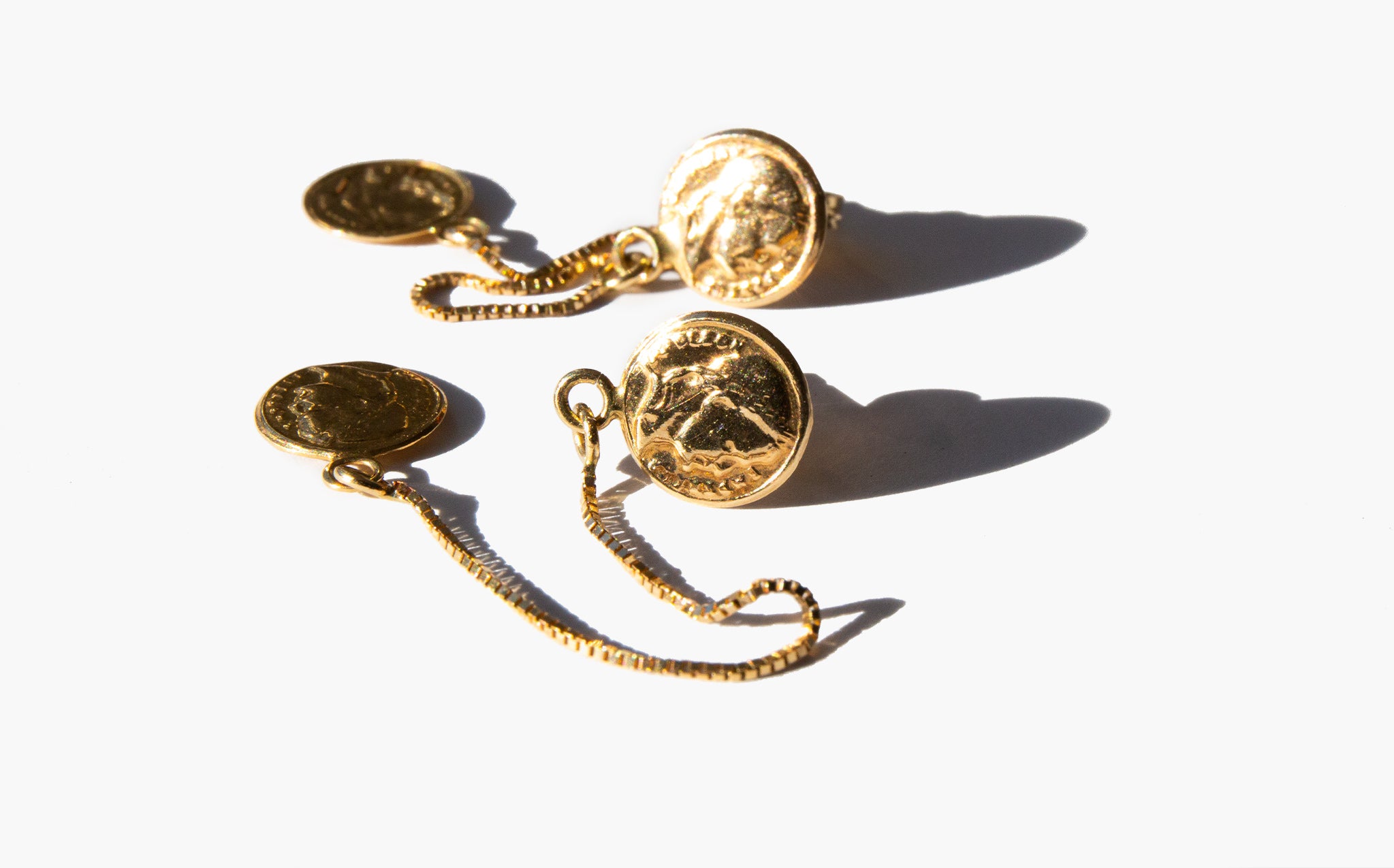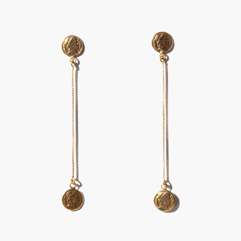 Earrings are approximately 2.5" long, including chain and dangling coin.