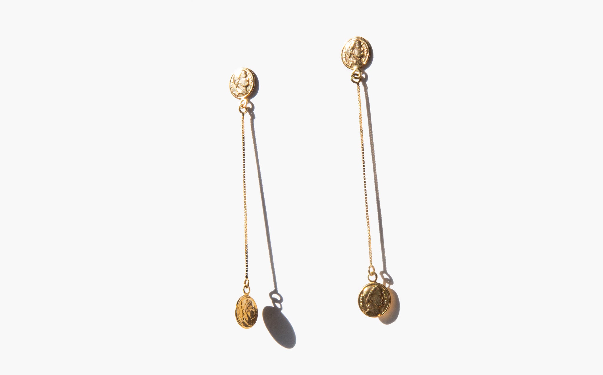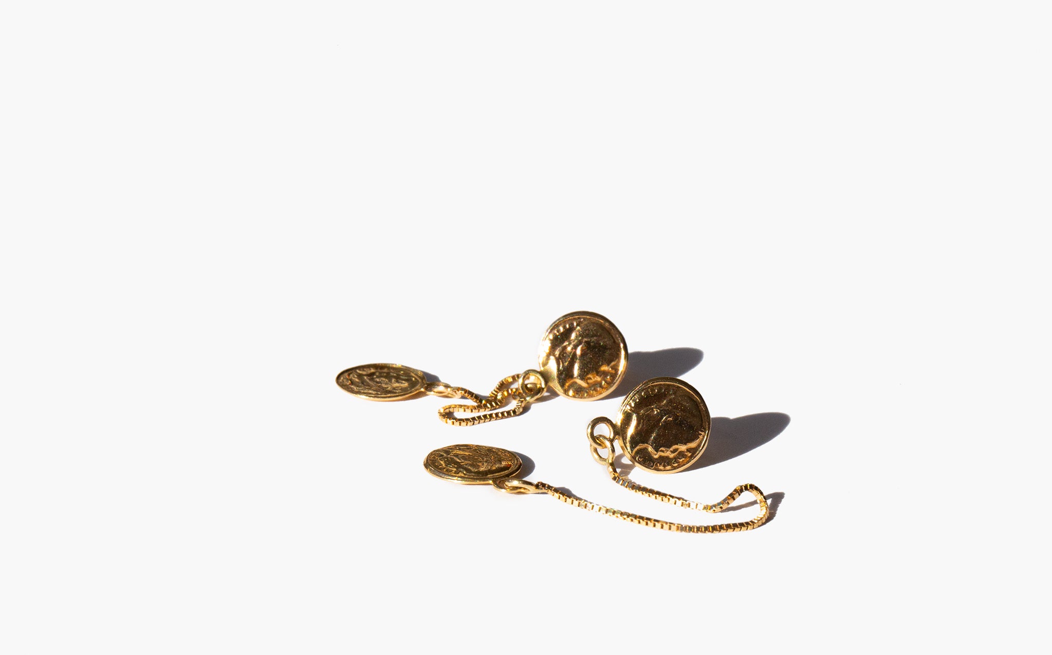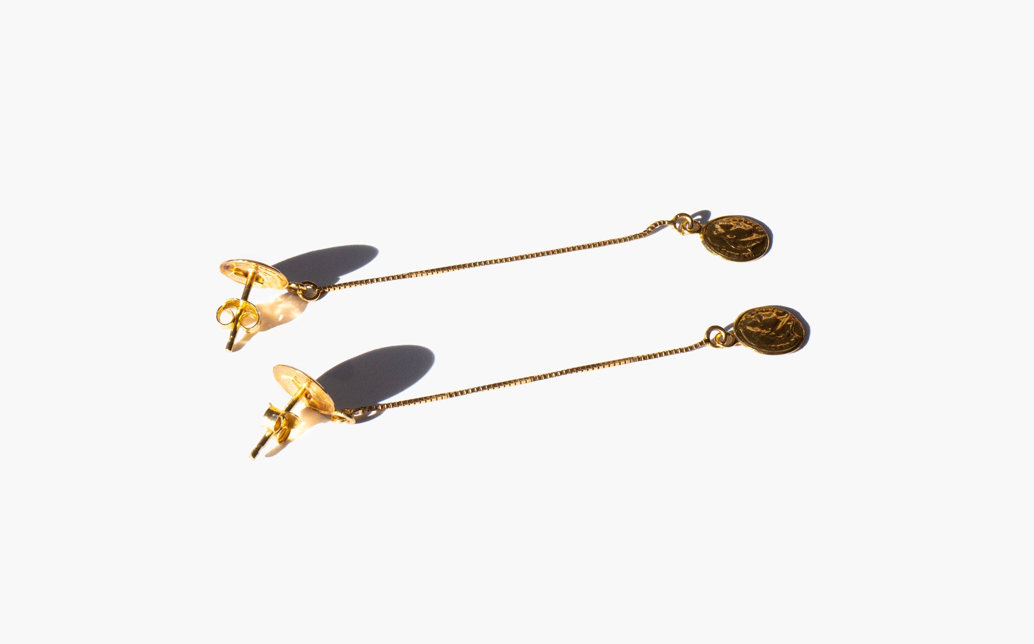 Earrings are approximately 2.5" long, including chain and dangling coin.