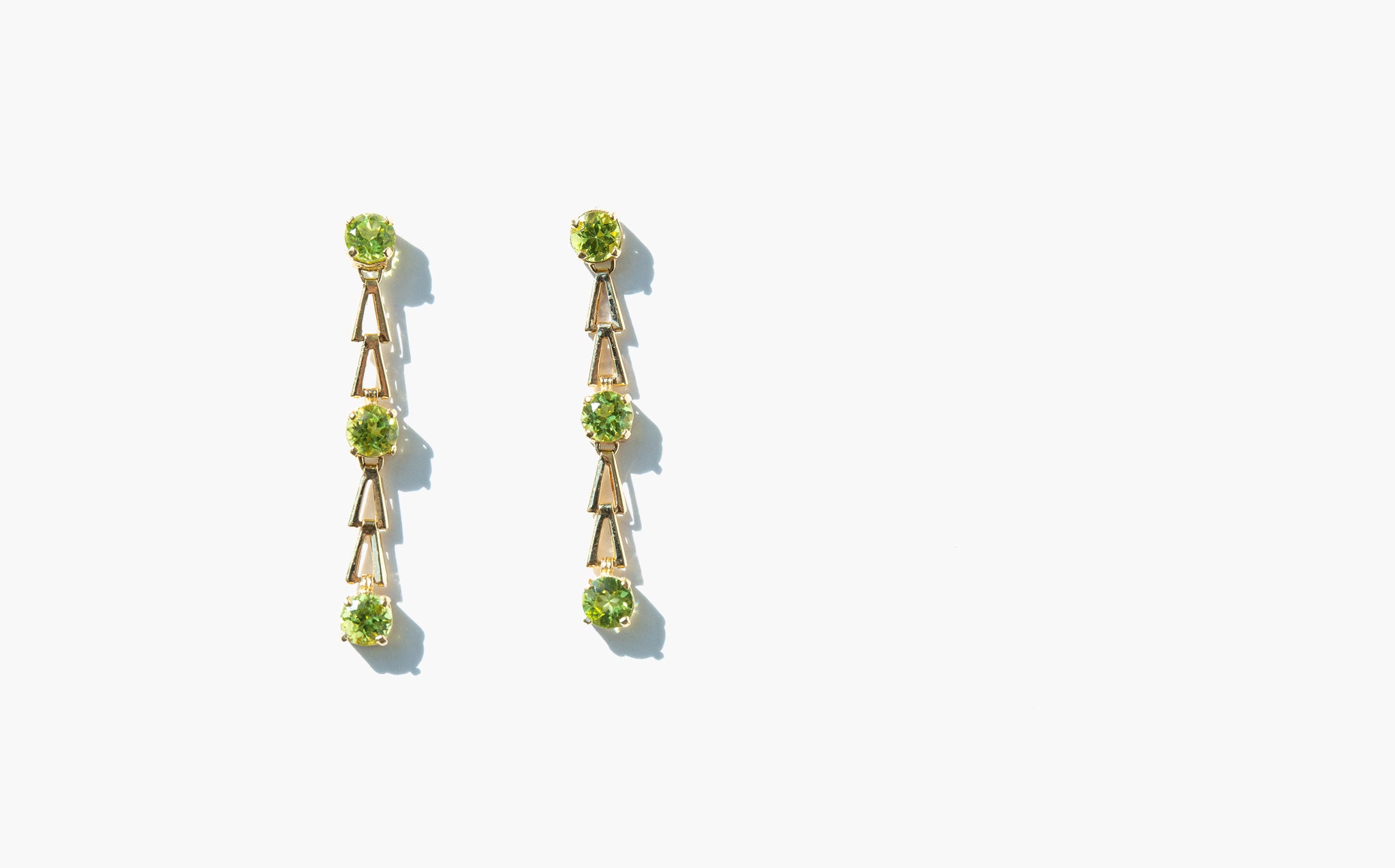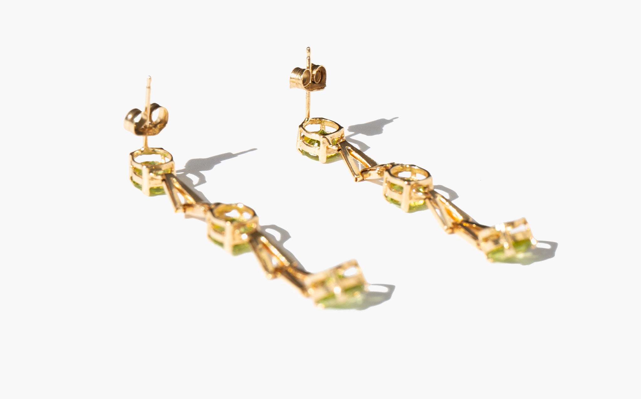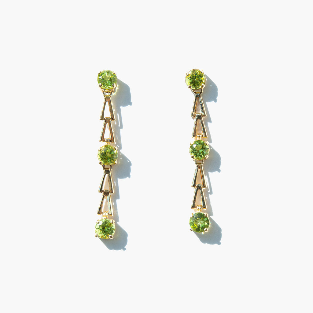 Geometric 14k gold and peridot earrings. A stone of harmony, peridot is associated with peace, tranquility, warmth, and unflagging positive energy.