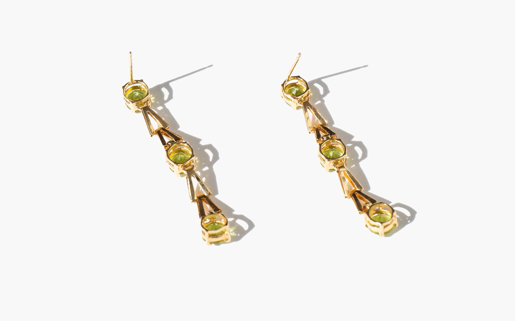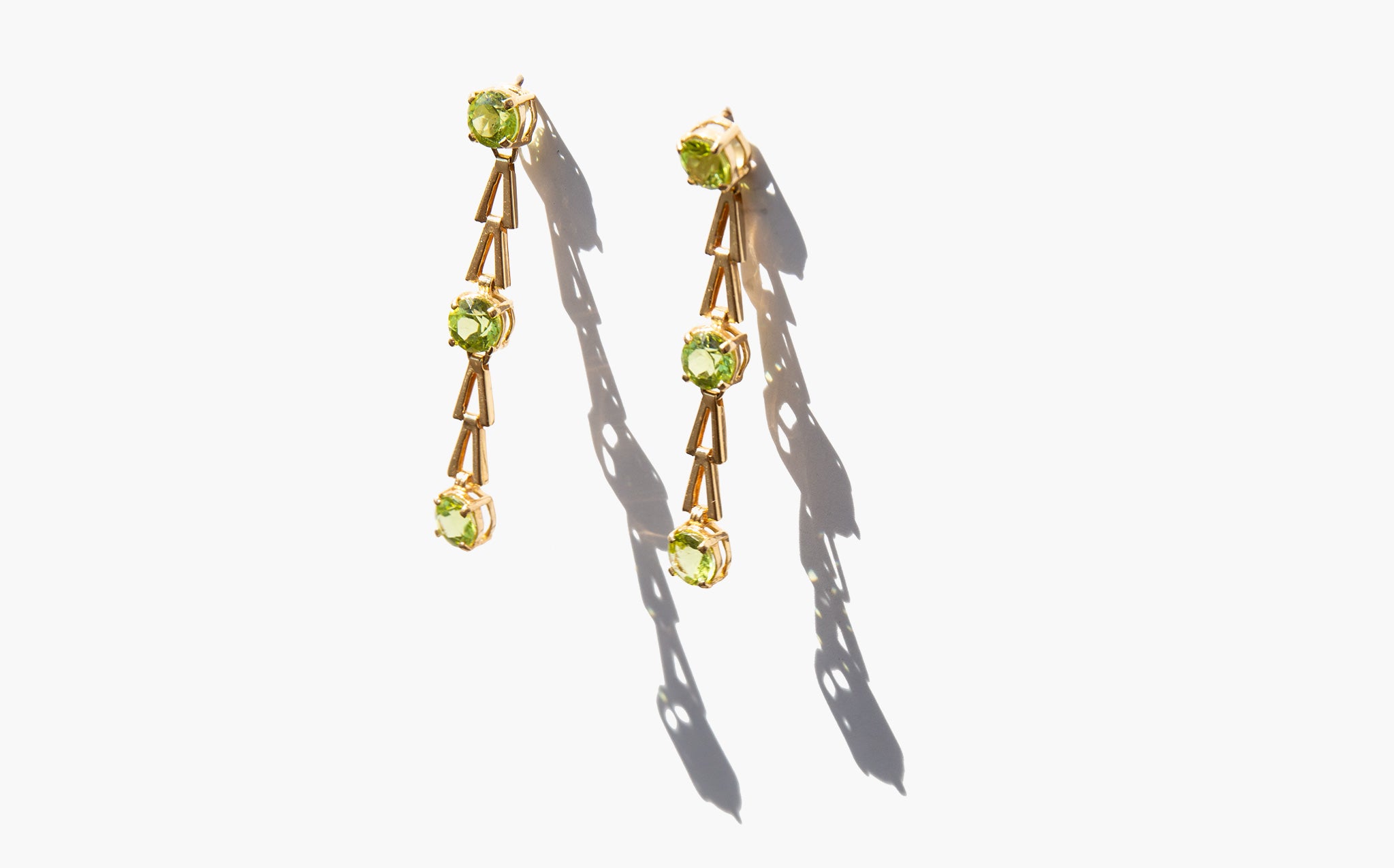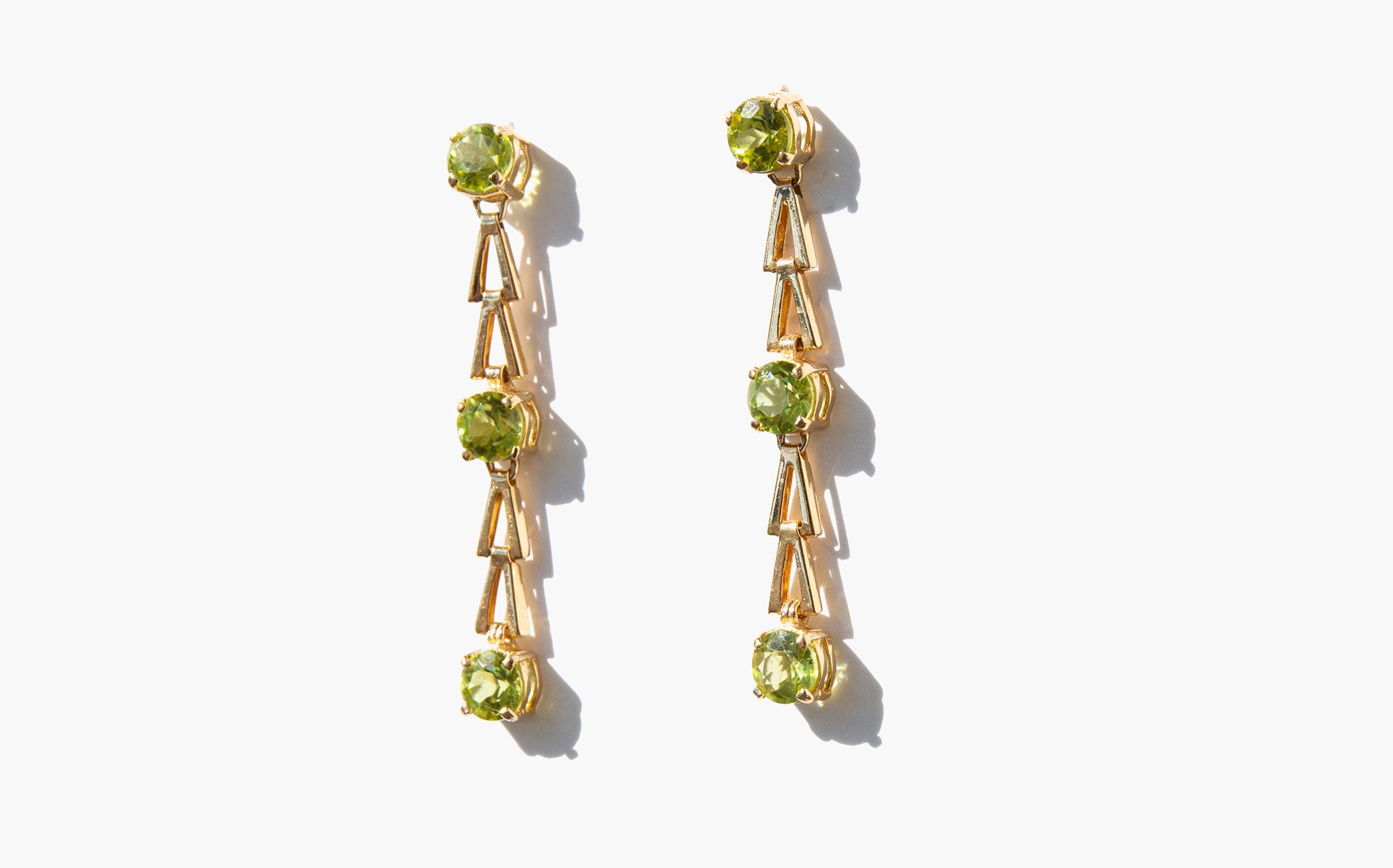 Geometric 14k gold and peridot earrings. A stone of harmony, peridot is associated with peace, tranquility, warmth, and unflagging positive energy.