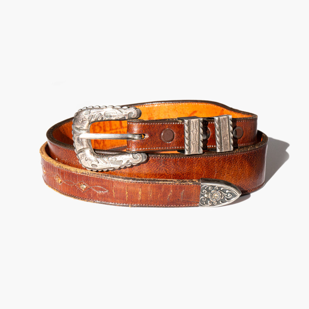 Vintage western leather belt with a solid sterling silver buckle and tip.