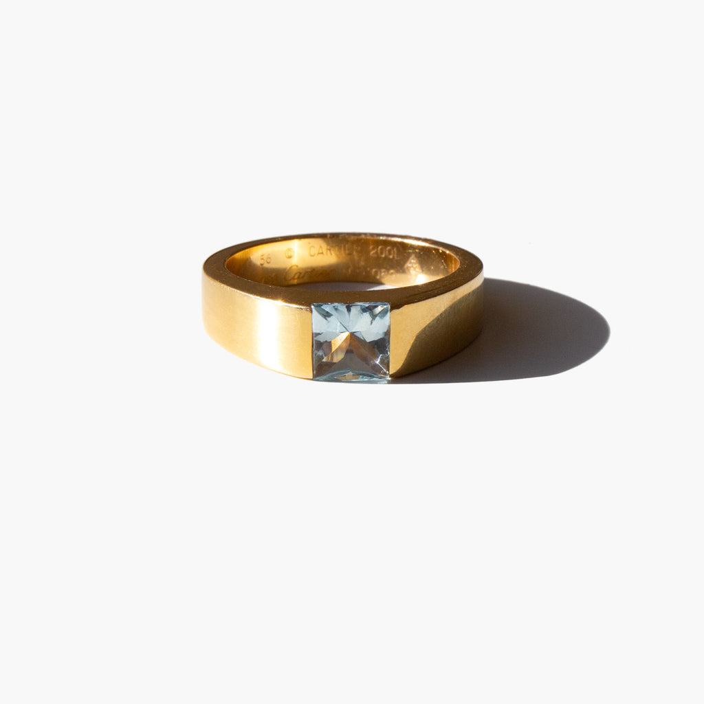 Cartier 18k gold tank ring with a center set aquamarine stone.