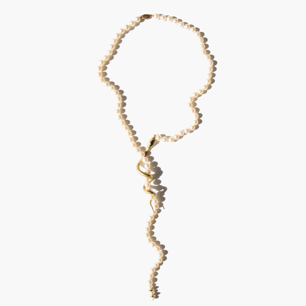 Beautifully crafted solid 14k gold snake with a sapphire embellished head and tiny diamond eyes, coiled into a string of pearls. Snakes are ancient symbols of protection and guardianship because when threatened, they tend to stand their ground and fight rather than retreat. Cultures throughout history have also revered the snake as a symbol of immortality, renewal, and rebirth because of its own rejuvenation through the shedding of its outer layer of skin.