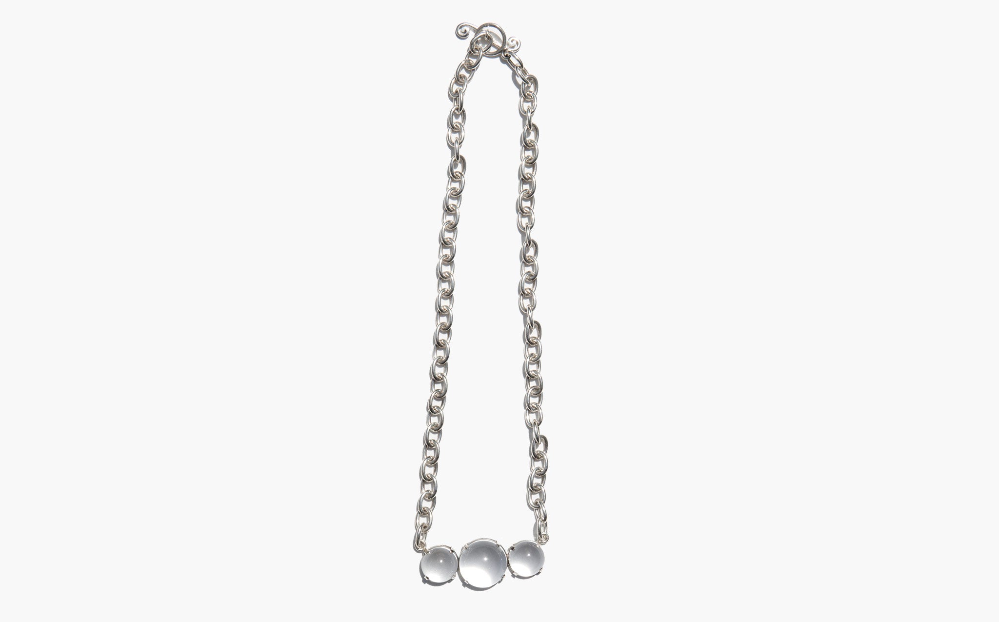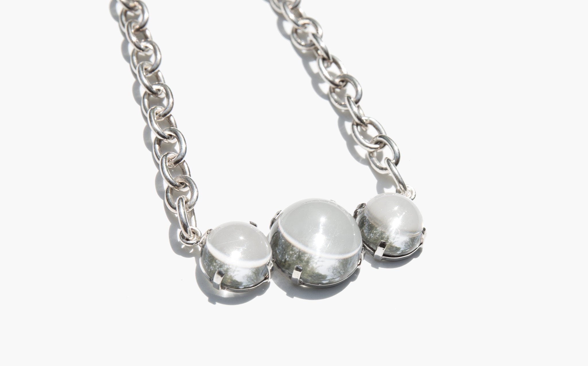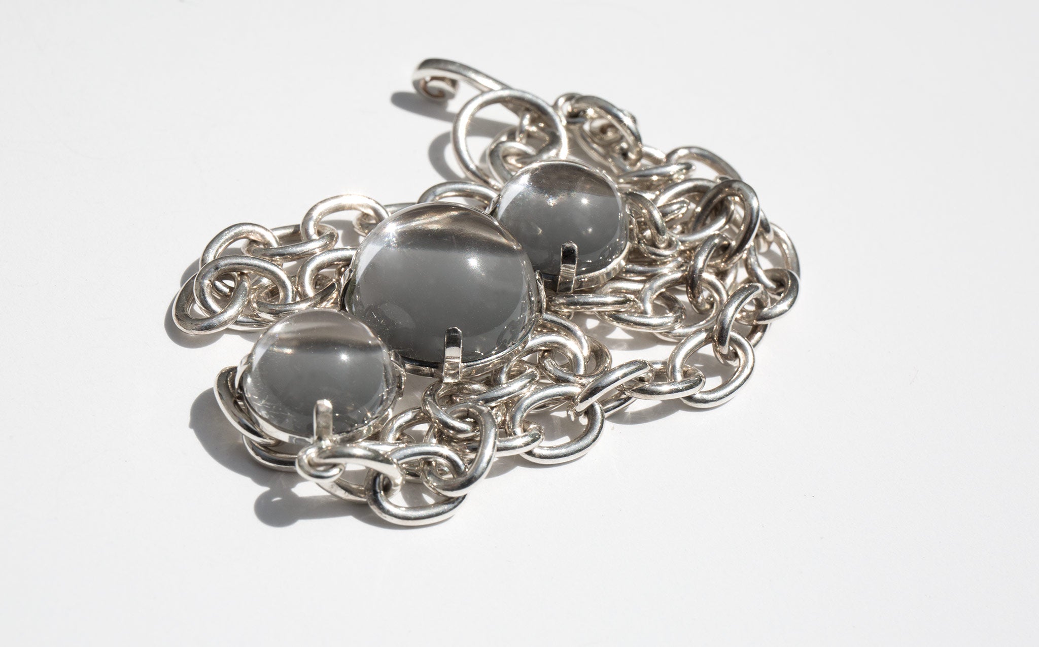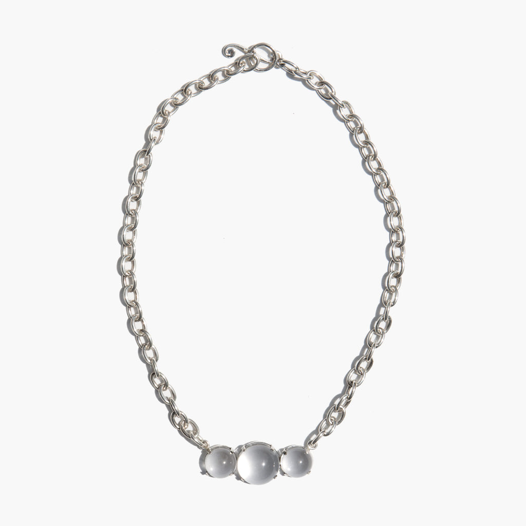 A stunning and unusual choker necklace – a trio of antique crystals known as "pools of light" because of the way the crystal refracts light, casting a pool of ethereal glow set in a thick and heavy vintage sterling silver choker.