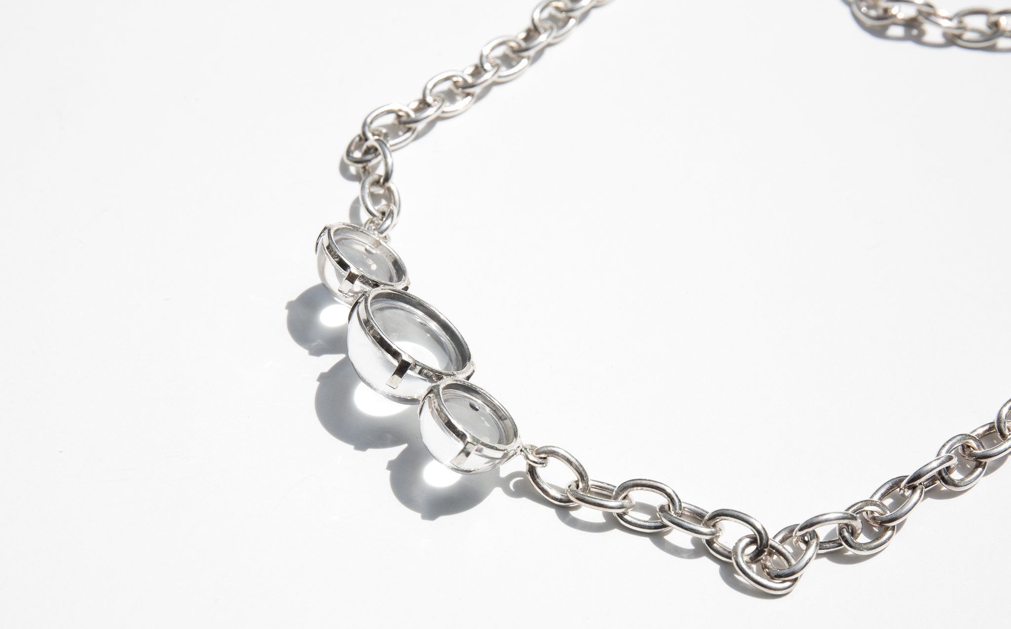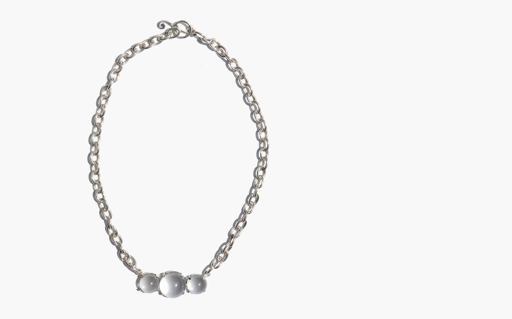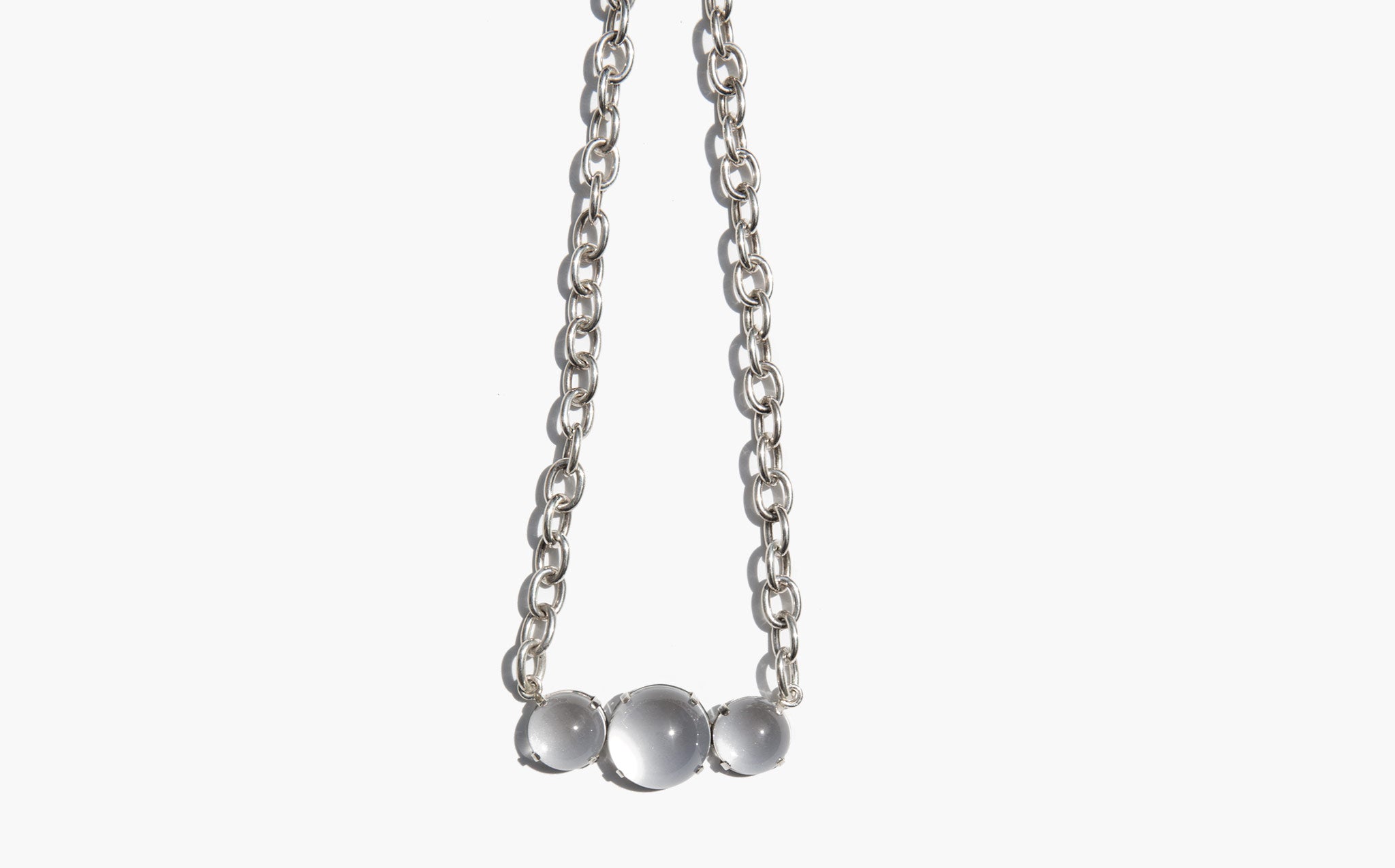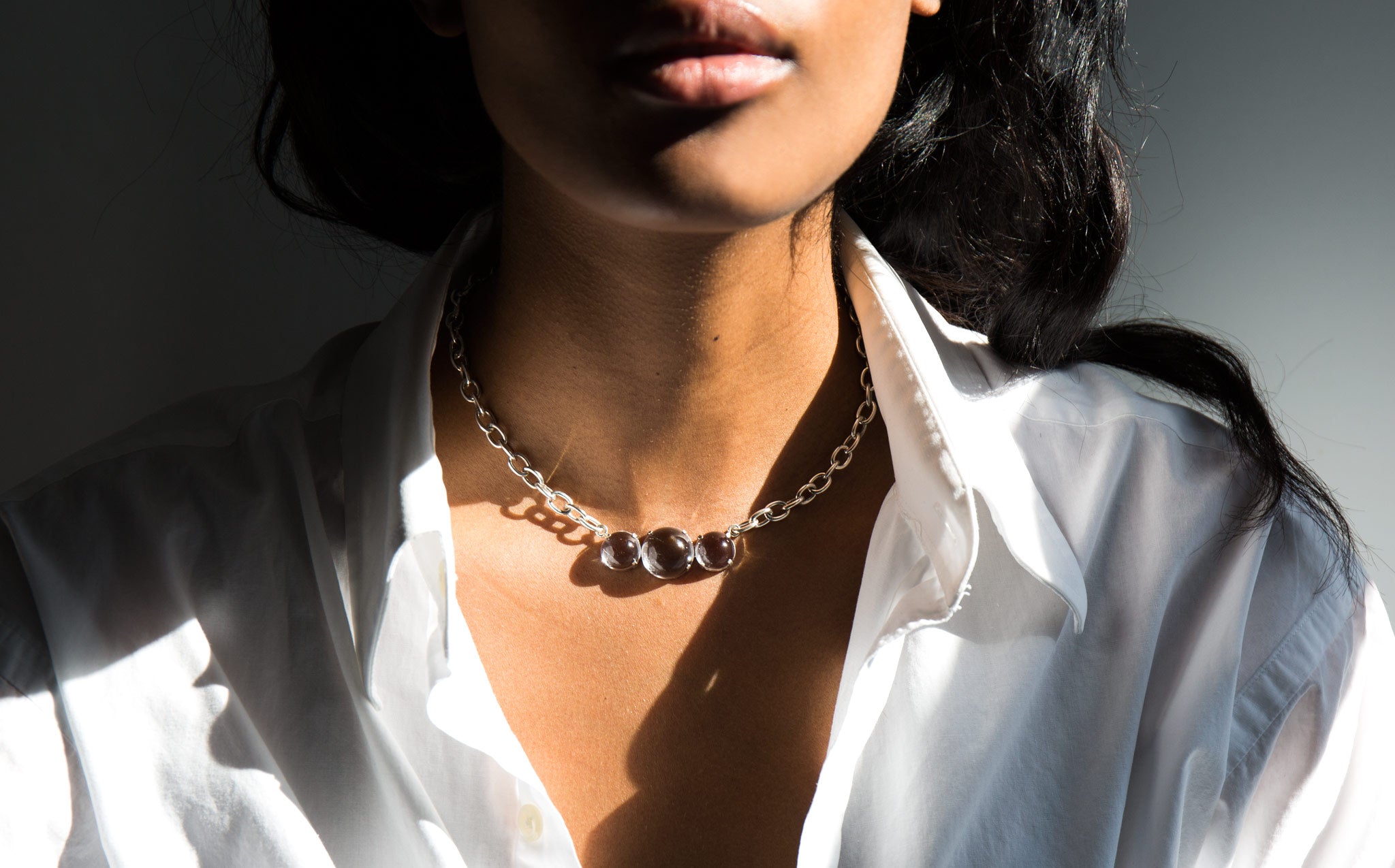 A stunning and unusual choker necklace – a trio of antique crystals known as "pools of light" because of the way the crystal refracts light, casting a pool of ethereal glow set in a thick and heavy vintage sterling silver choker.
