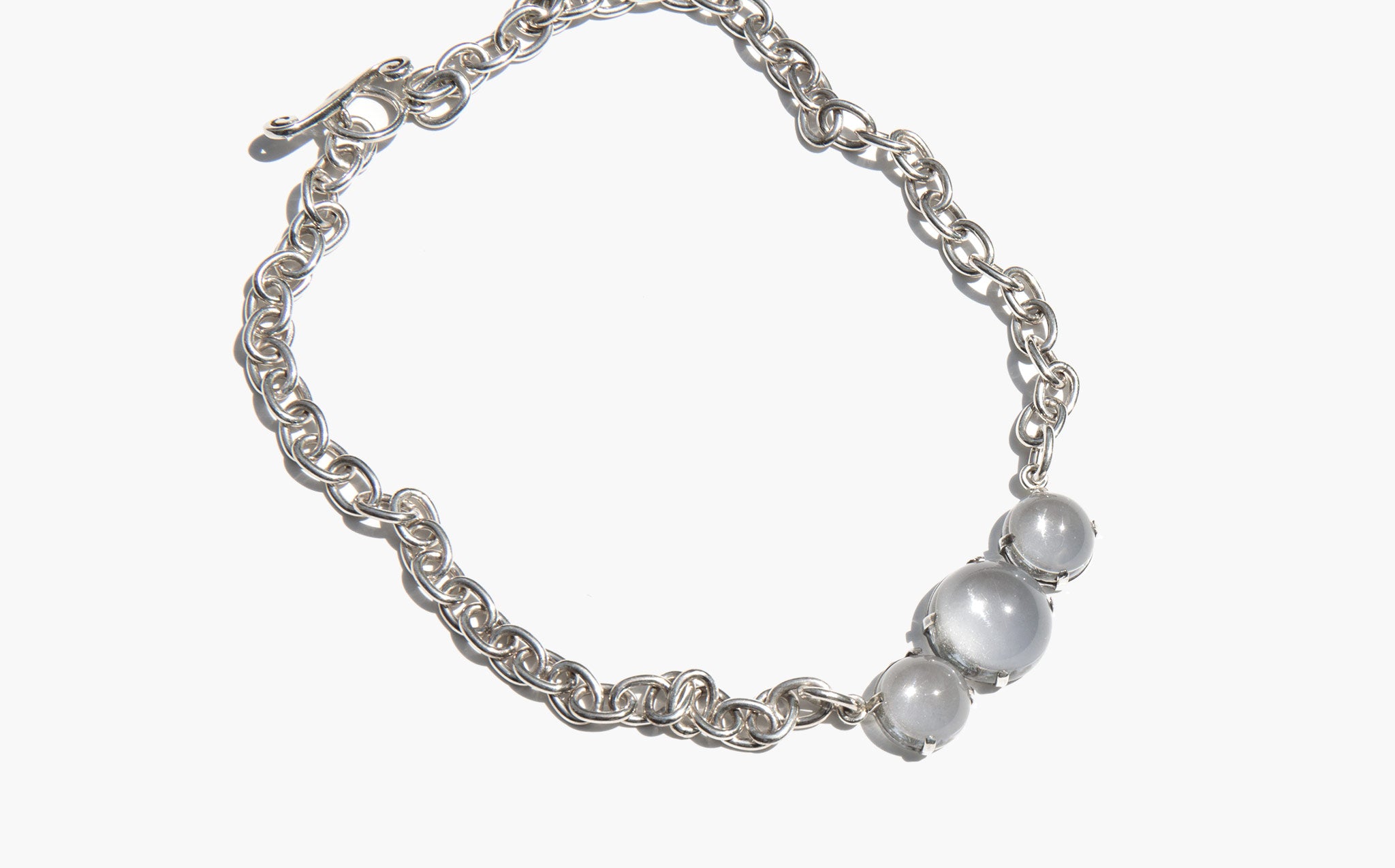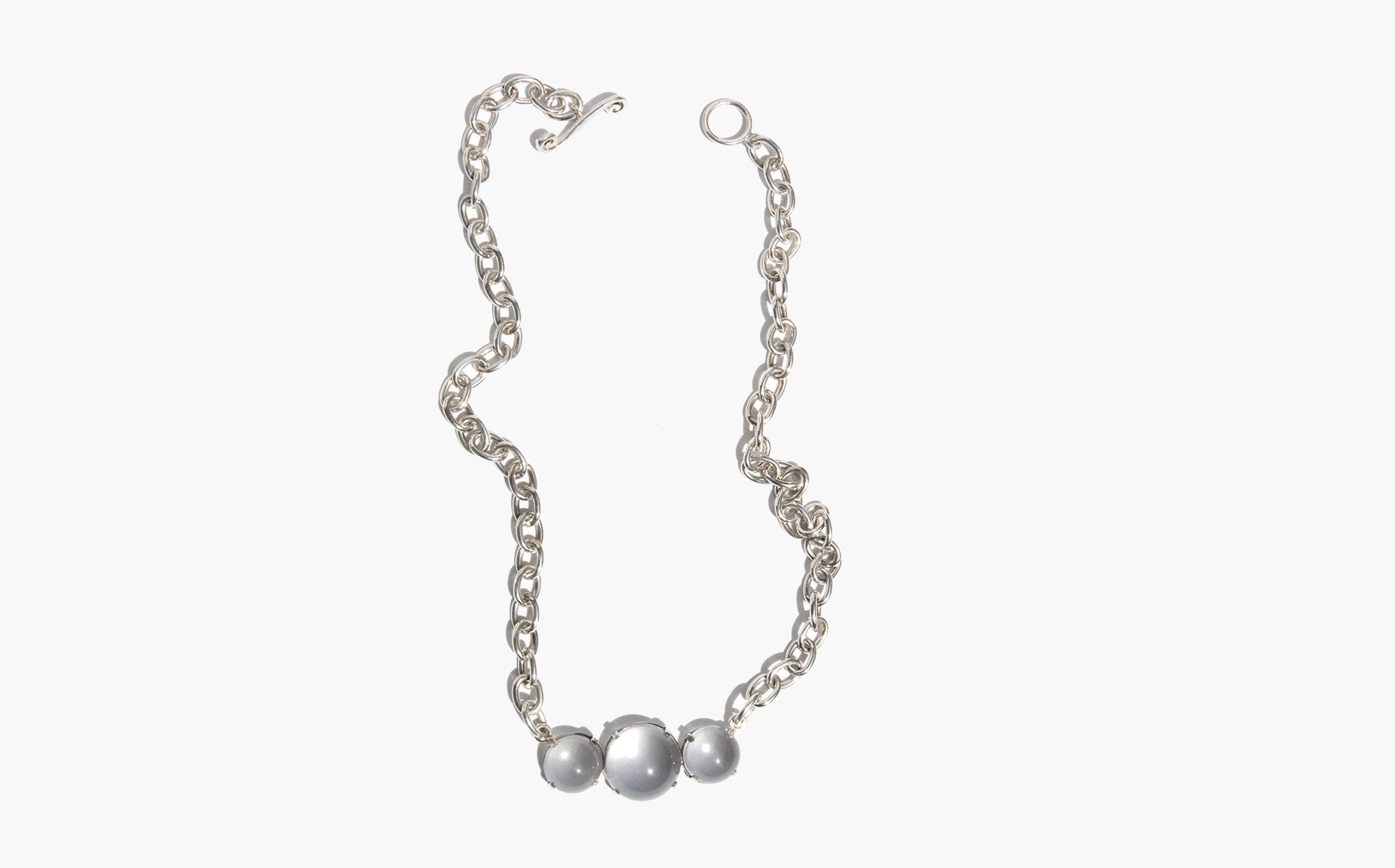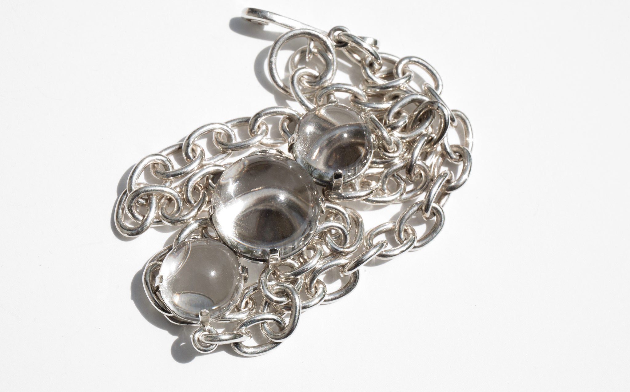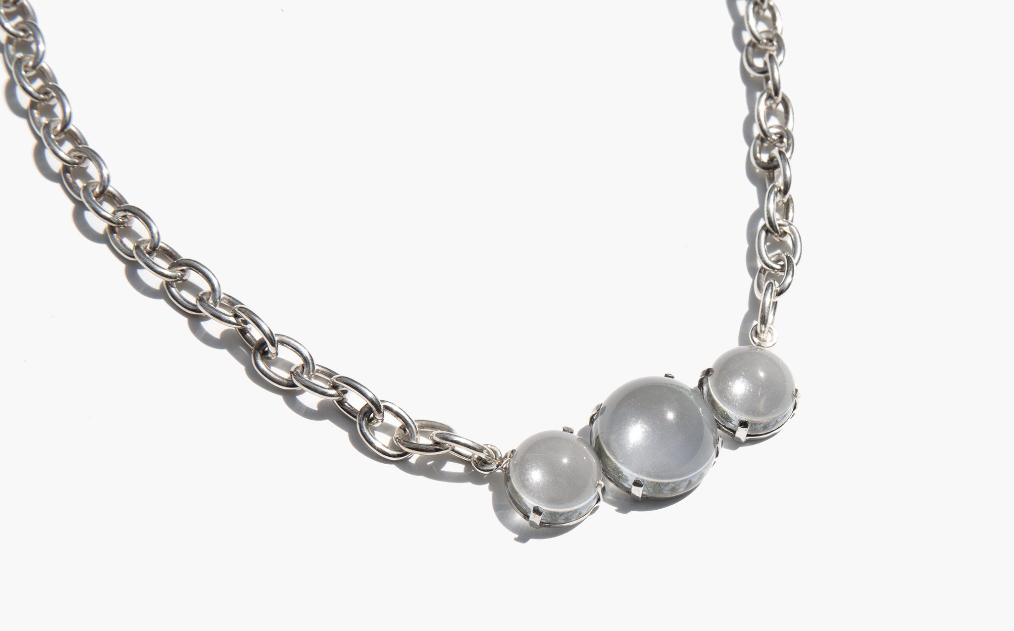 A stunning and unusual choker necklace – a trio of antique crystals known as "pools of light" because of the way the crystal refracts light, casting a pool of ethereal glow set in a thick and heavy vintage sterling silver choker.