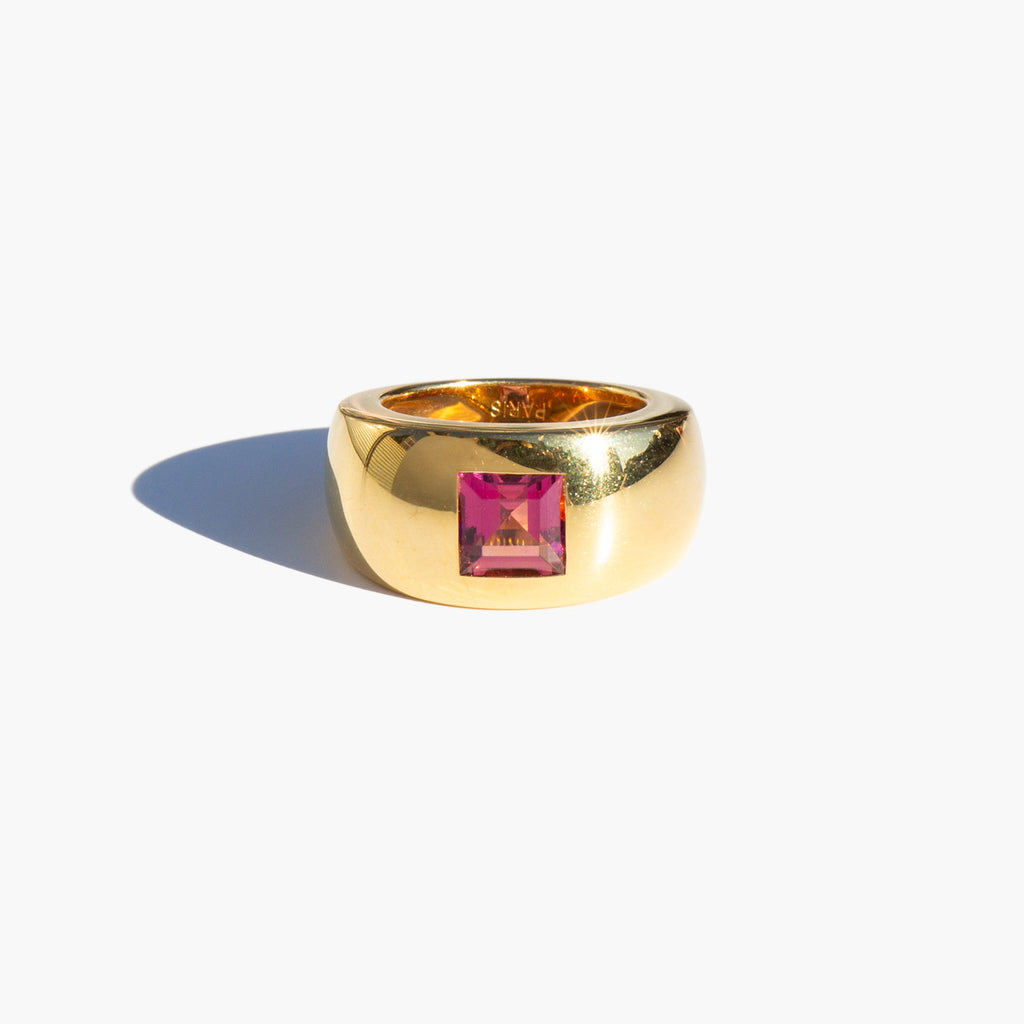 Deliciously weighty Chaumet 18k gold ring with a large pink tourmaline that has a total carat weight of approximately 1.50. Pink tourmaline is known to be calming, soothing, and closely associated with matters of the heart. Said to stimulate feelings of love, joy, and happiness, it is a stone of pleasure thought to also increase vitality and inner strength.