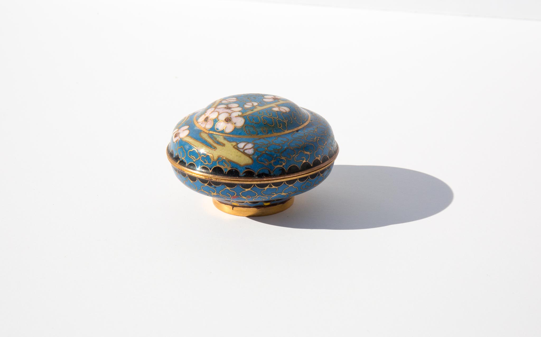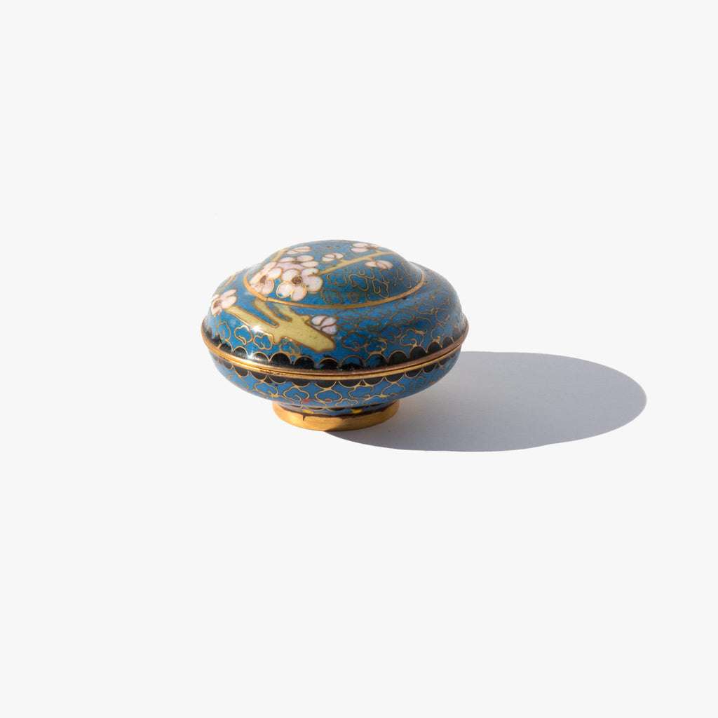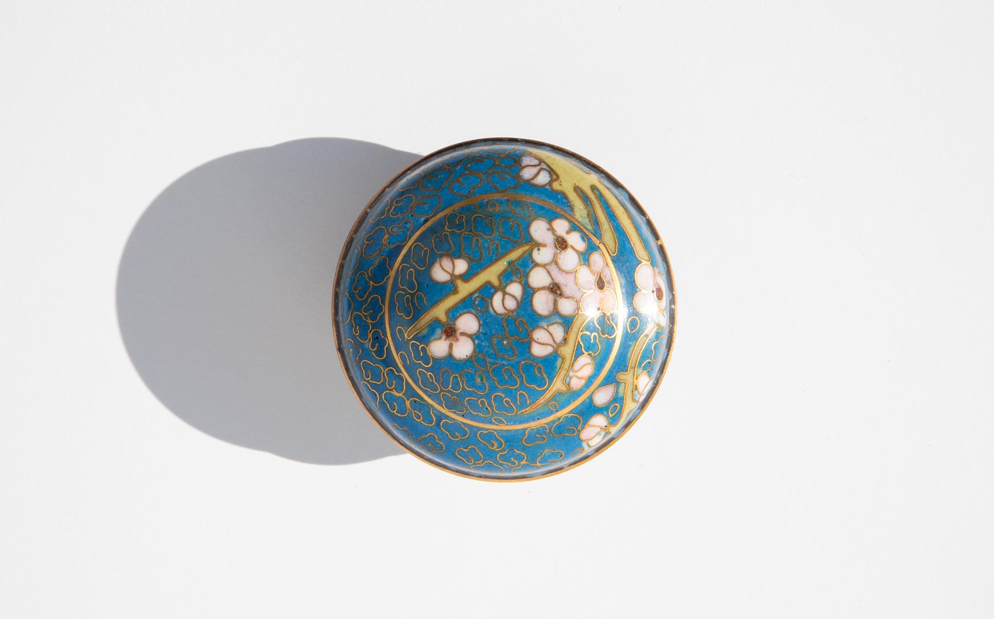 Pale blue cloisonné ring dish ornately patterned with a branch of pale pink cherry blossoms.