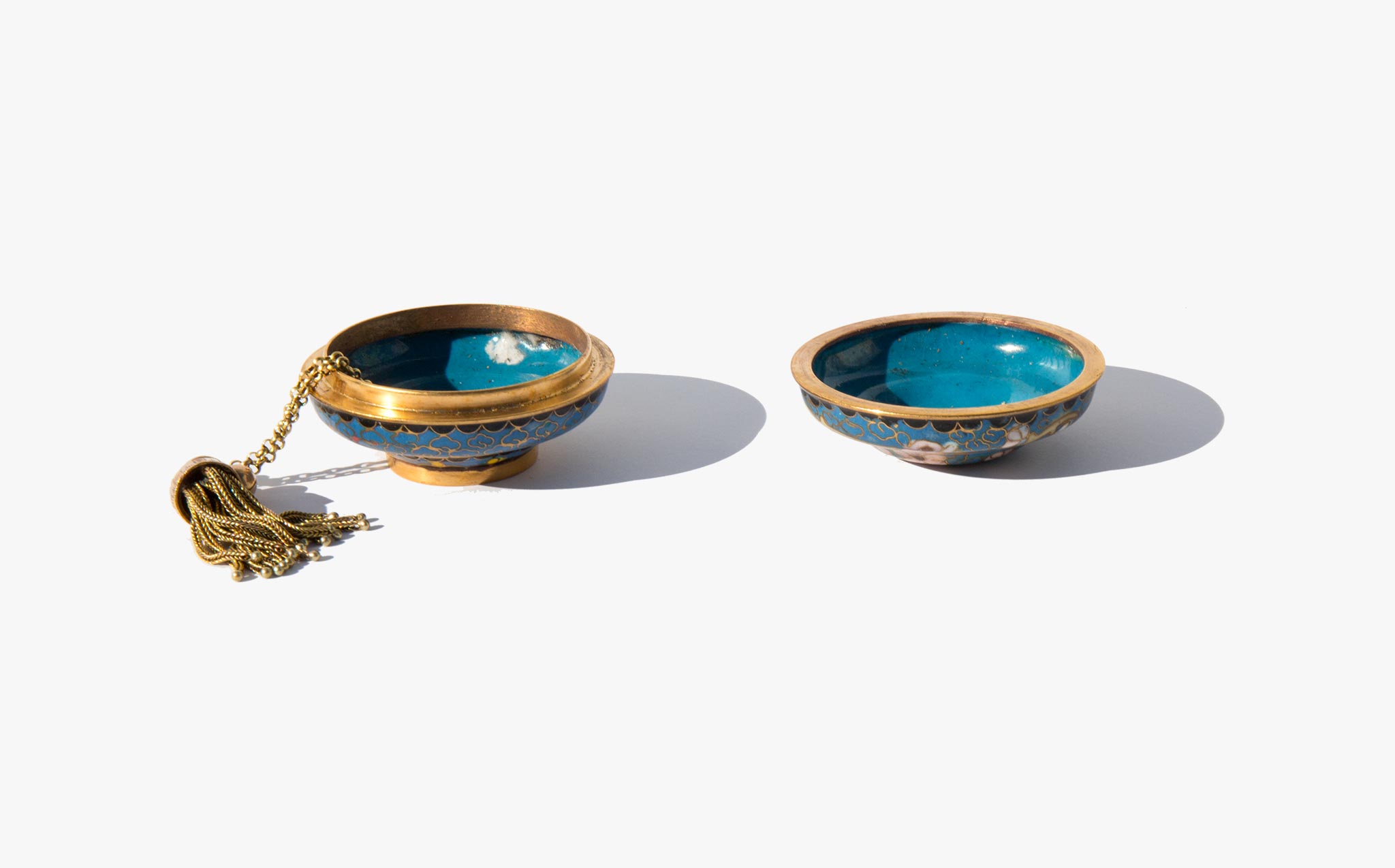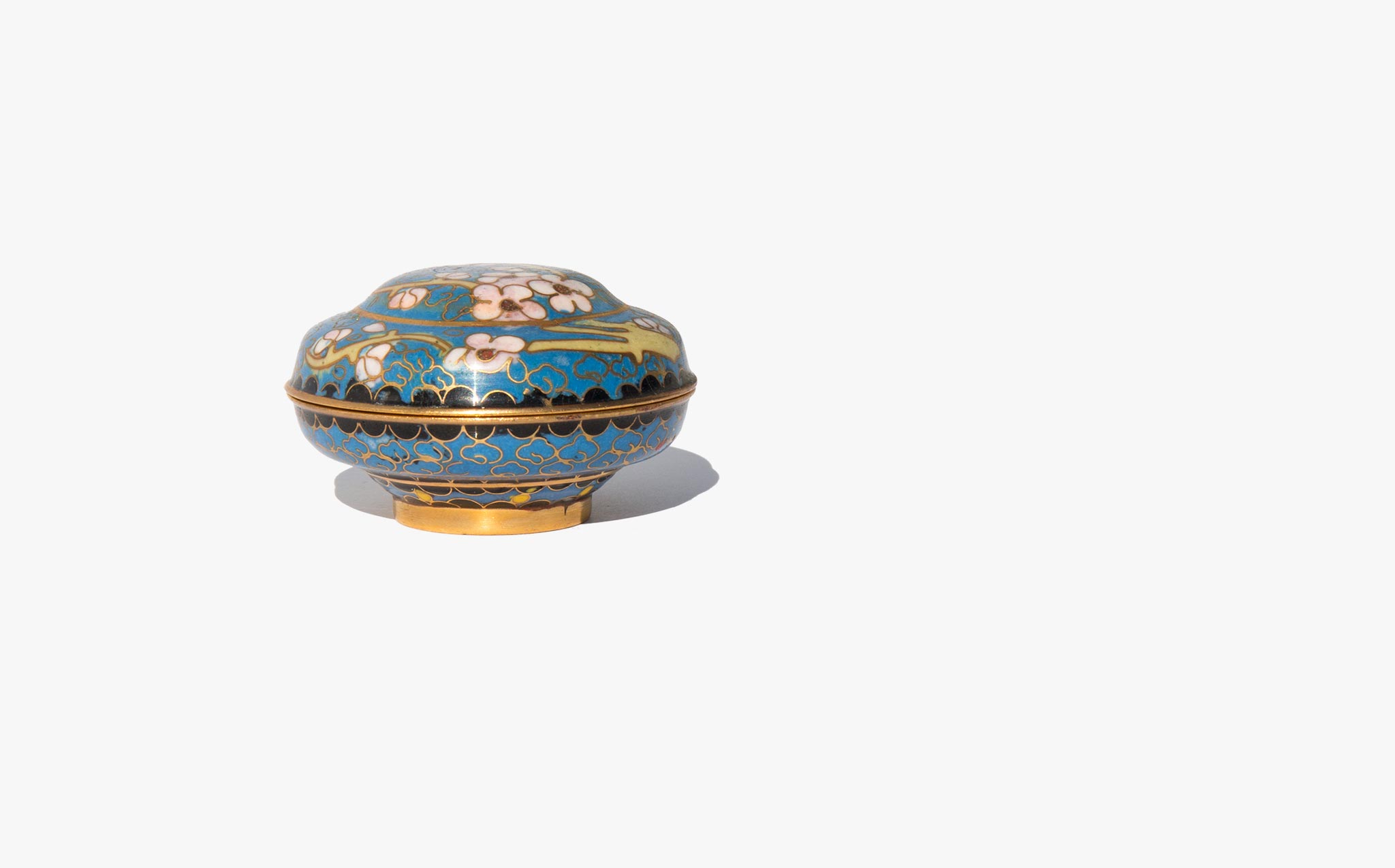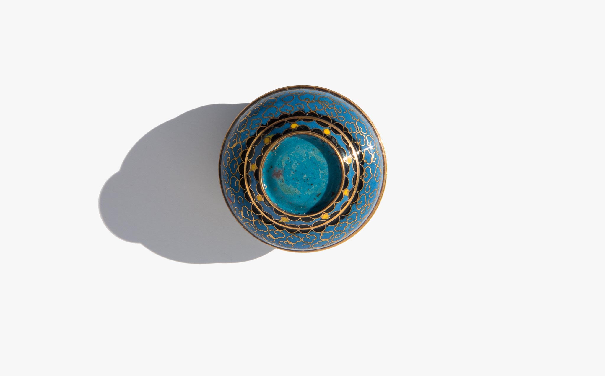 Pale blue cloisonné ring dish ornately patterned with a branch of pale pink cherry blossoms.