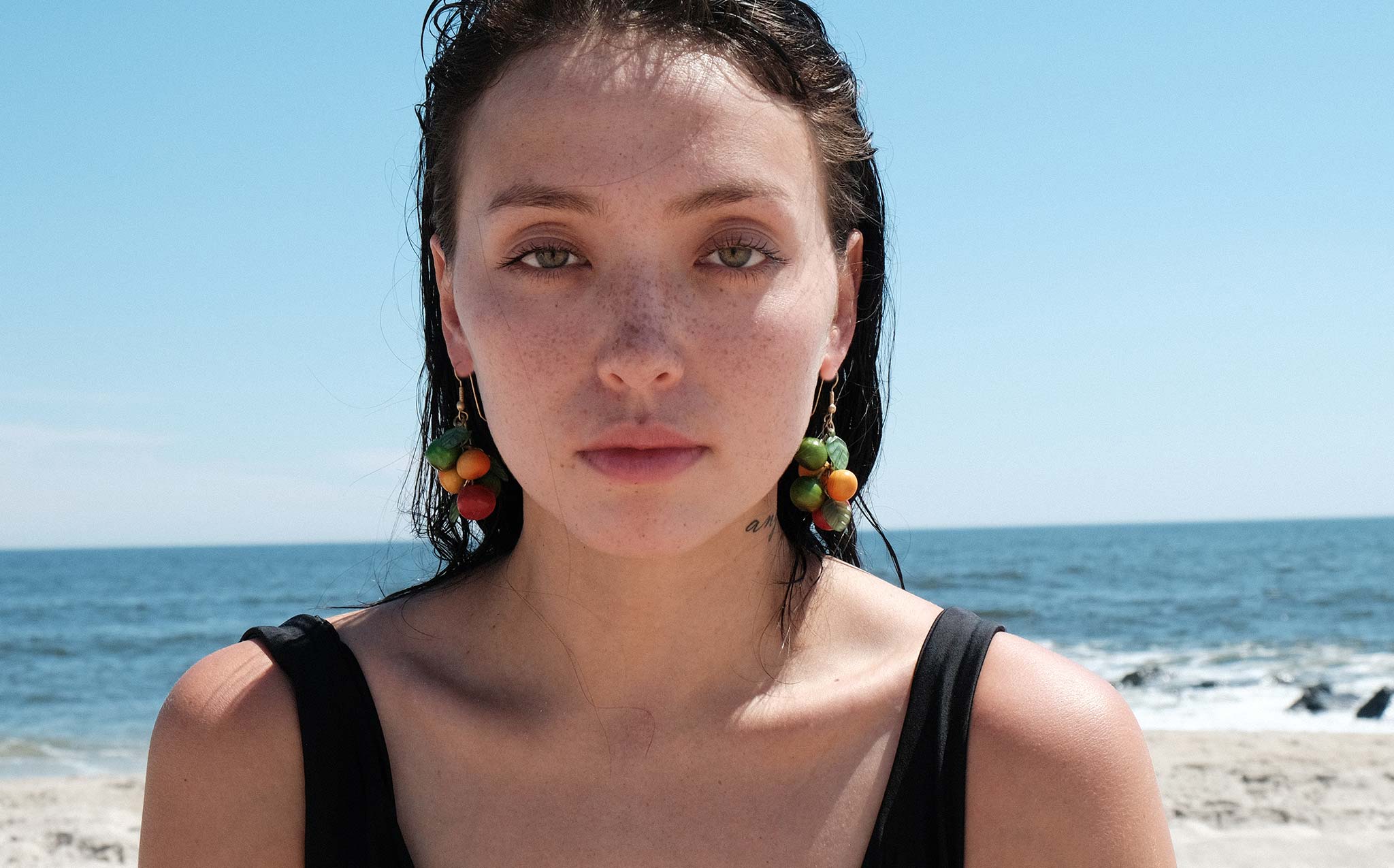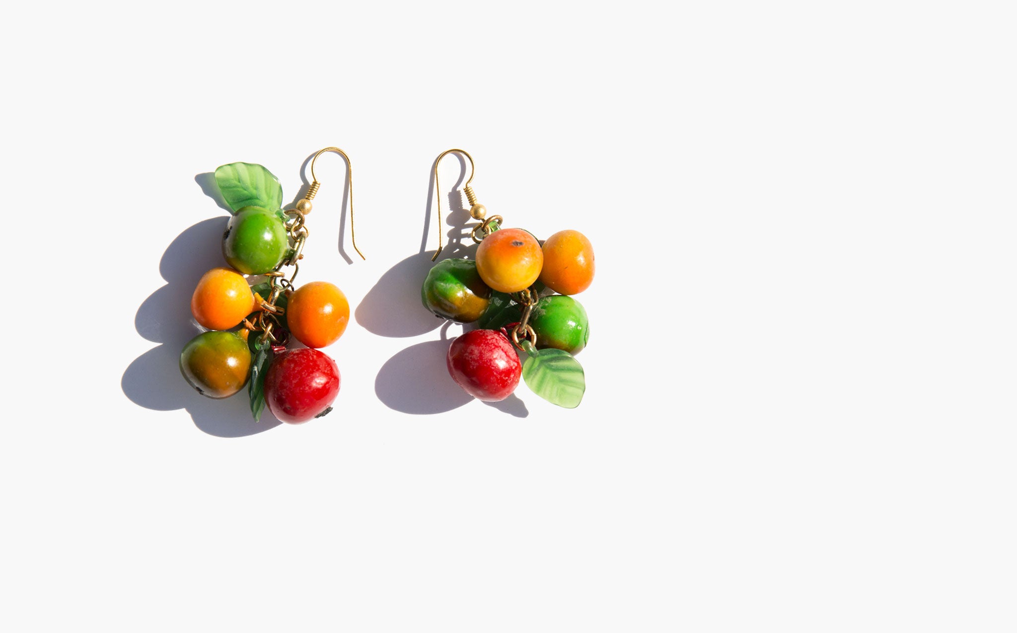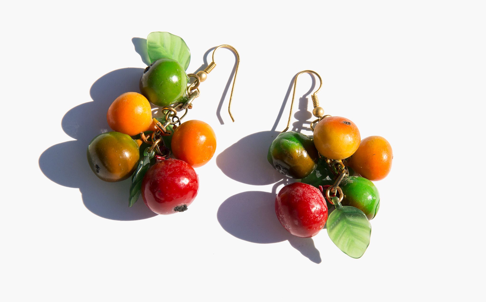 Vintage earrings with 14k gold posts and a cluster of colorful plastic fruits and leaves.