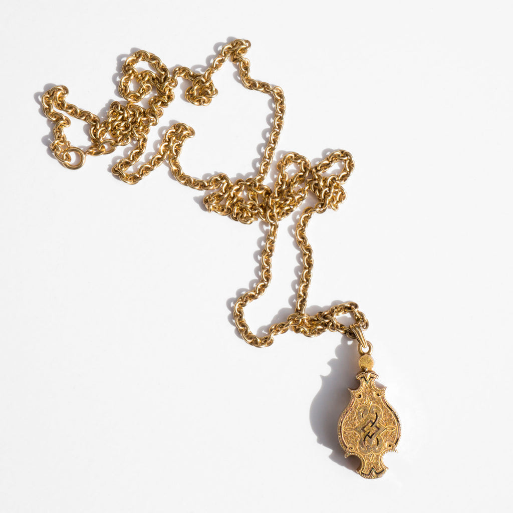 14 k gold Civil War era pendant with original tintype photographs inside. Arriving just prior to the Civil War, tintypes became the favorite way for a soldier to capture his likeness before heading off to battle. The smallest tintypes were called gems because of their tiny size. These tintypes were so small, they were often secreted into lockets and worn by a loved one as a piece of jewelry. This one-of-a-kind, handmade and hand engraved piece features intricate enamel handwork and hangs from a vintage solid 18k gold chain.