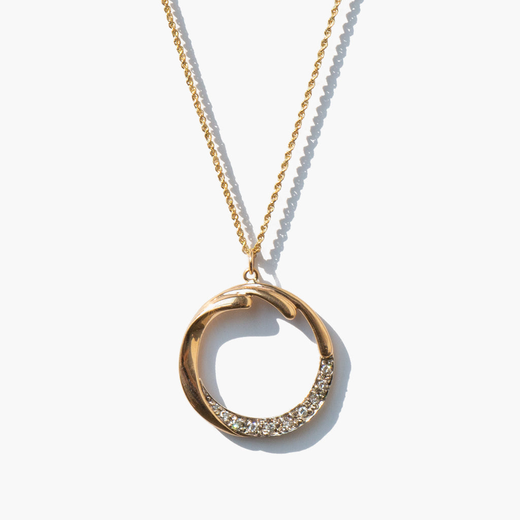 Diamond studded 14k gold pendant on a lovely 14k gold rope chain.