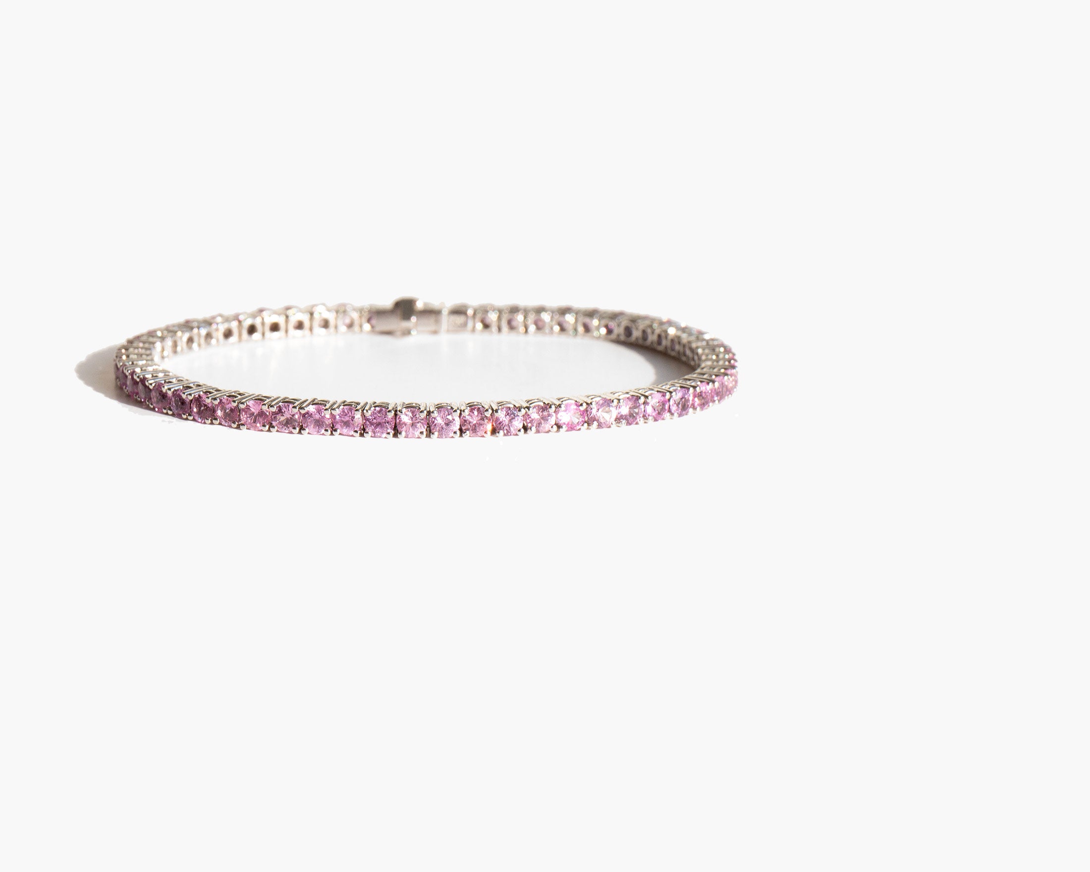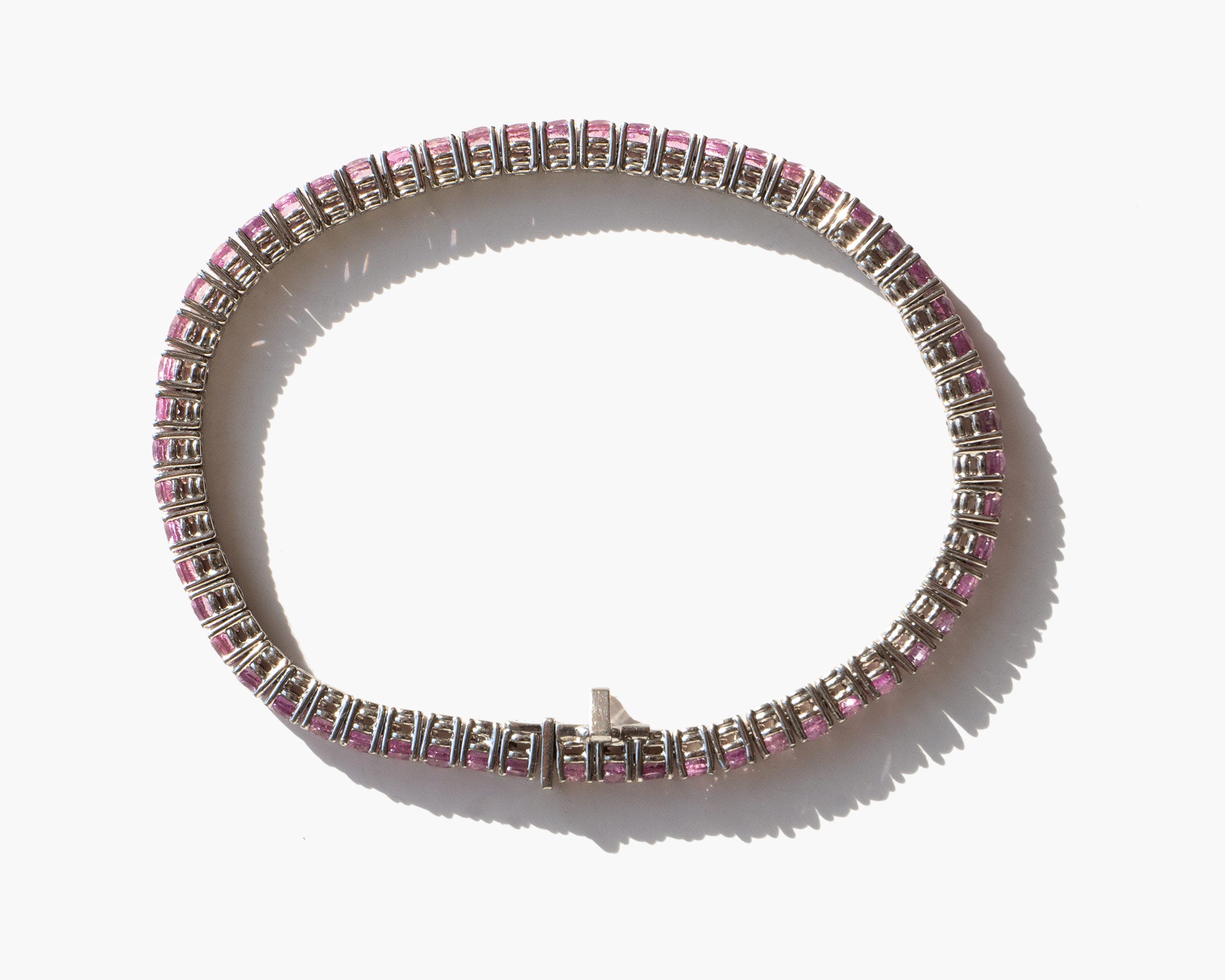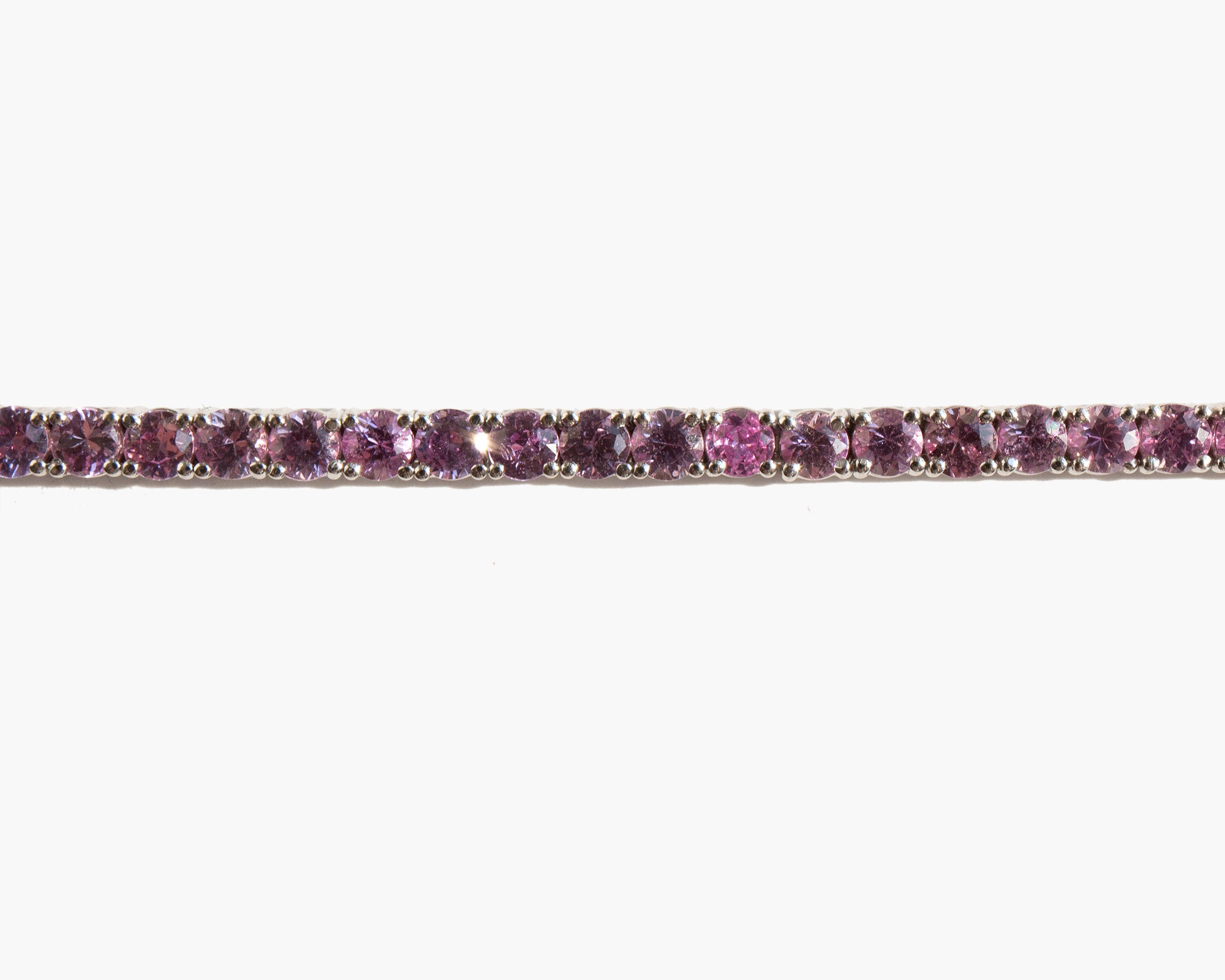Glittering 18k white gold and pink sapphire bracelet. Bracelet totals approximately 7.4 carats of pink sapphire. Pink sapphire is worn for protection, good judgement, and as a talisman of good fortune.