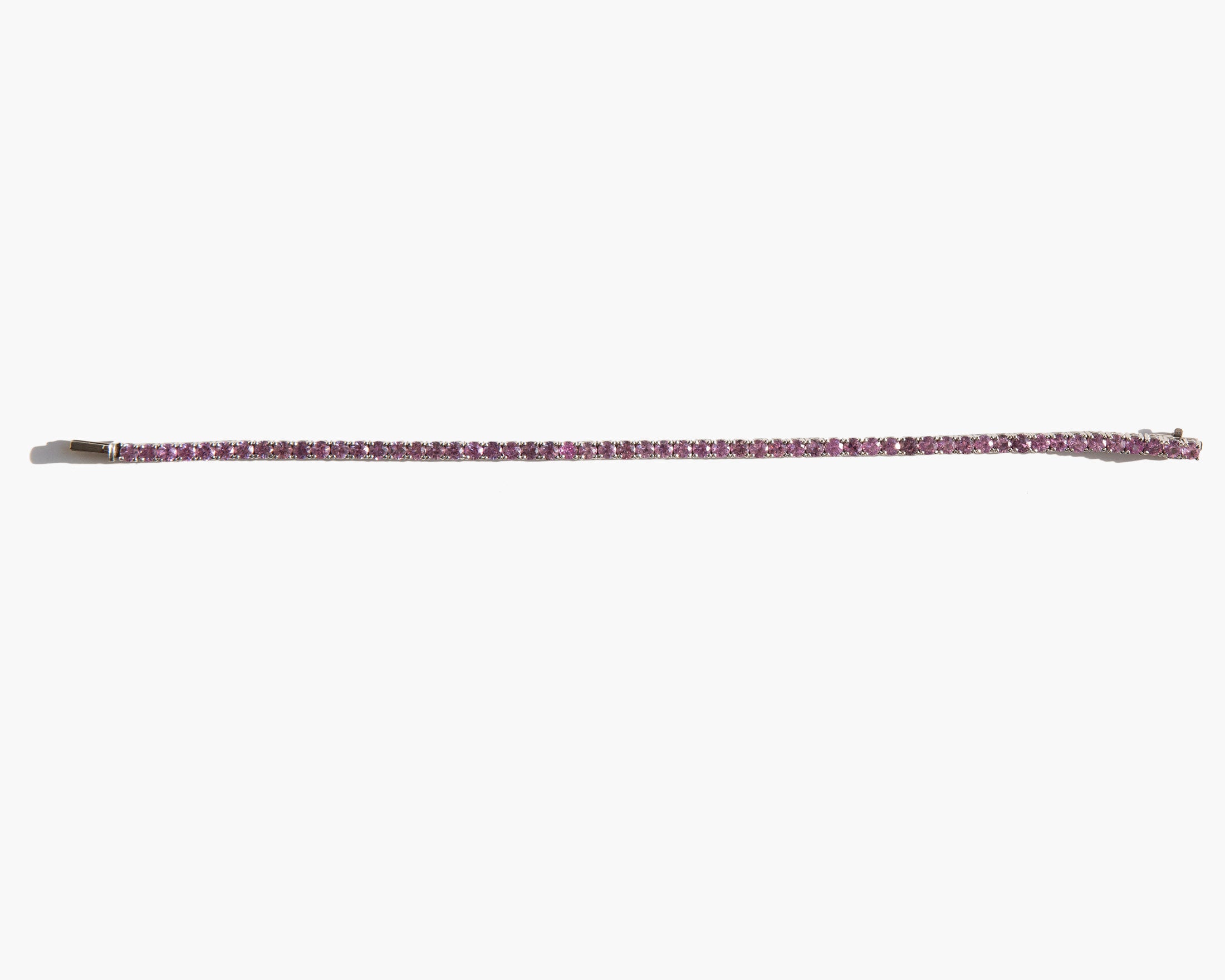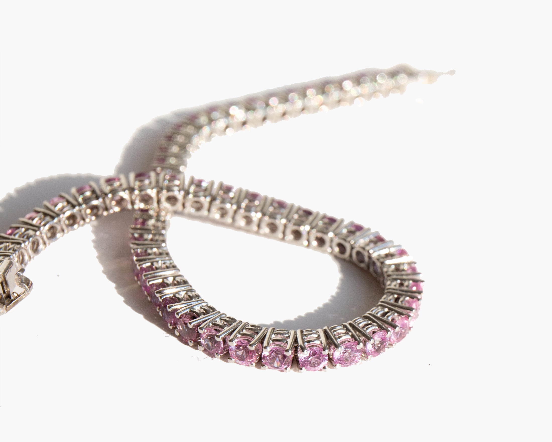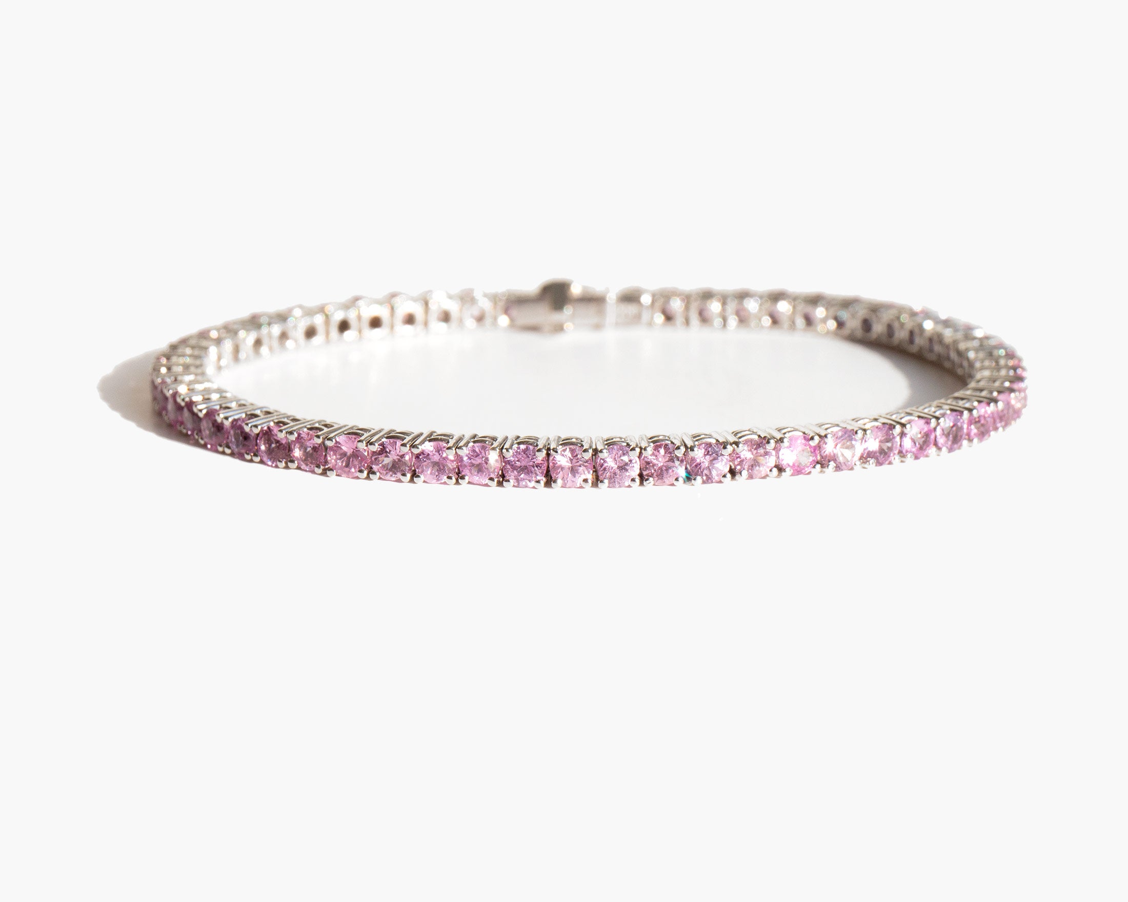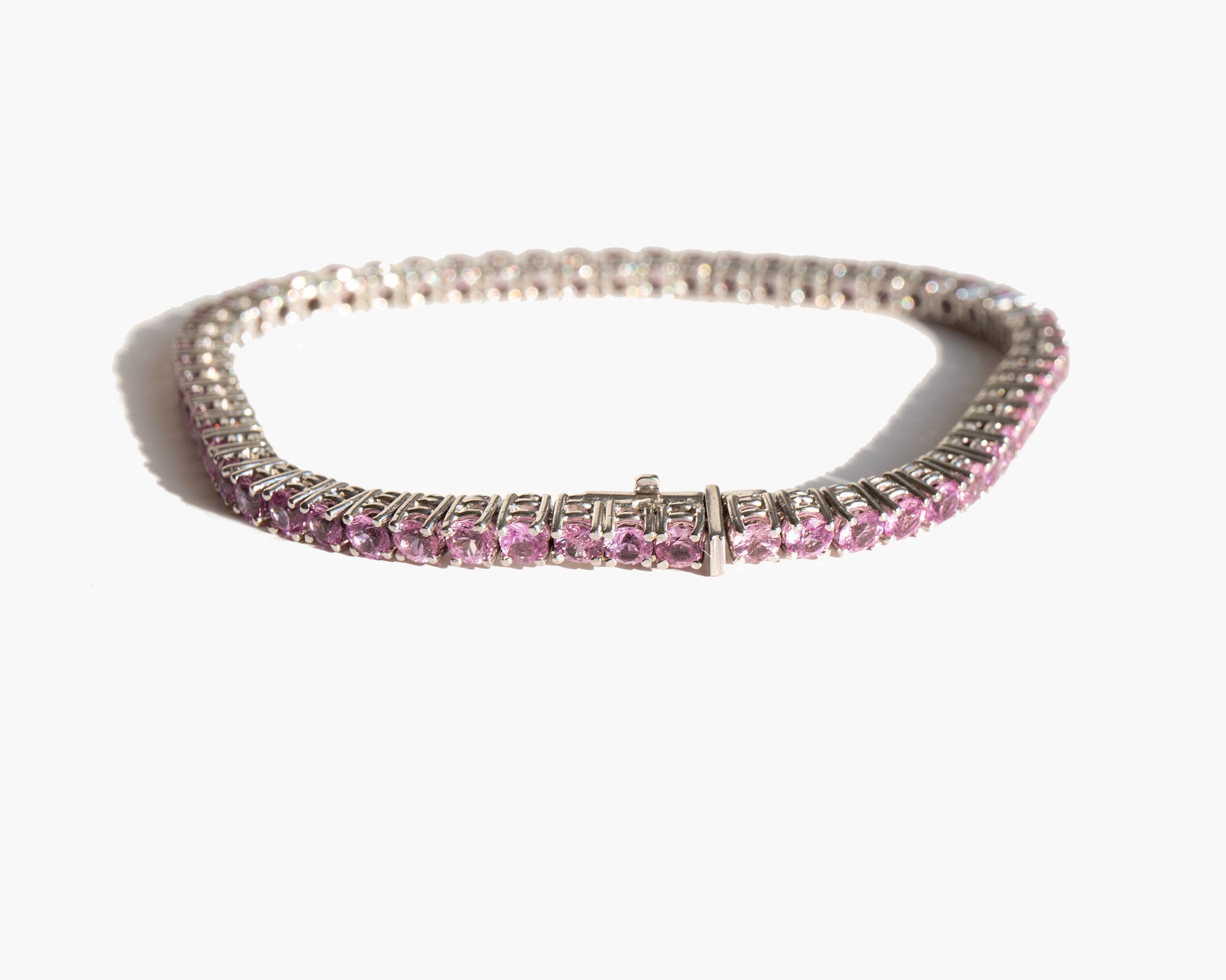 Glittering 18k white gold and pink sapphire bracelet. Bracelet totals approximately 7.4 carats of pink sapphire. Pink sapphire is worn for protection, good judgement, and as a talisman of good fortune.