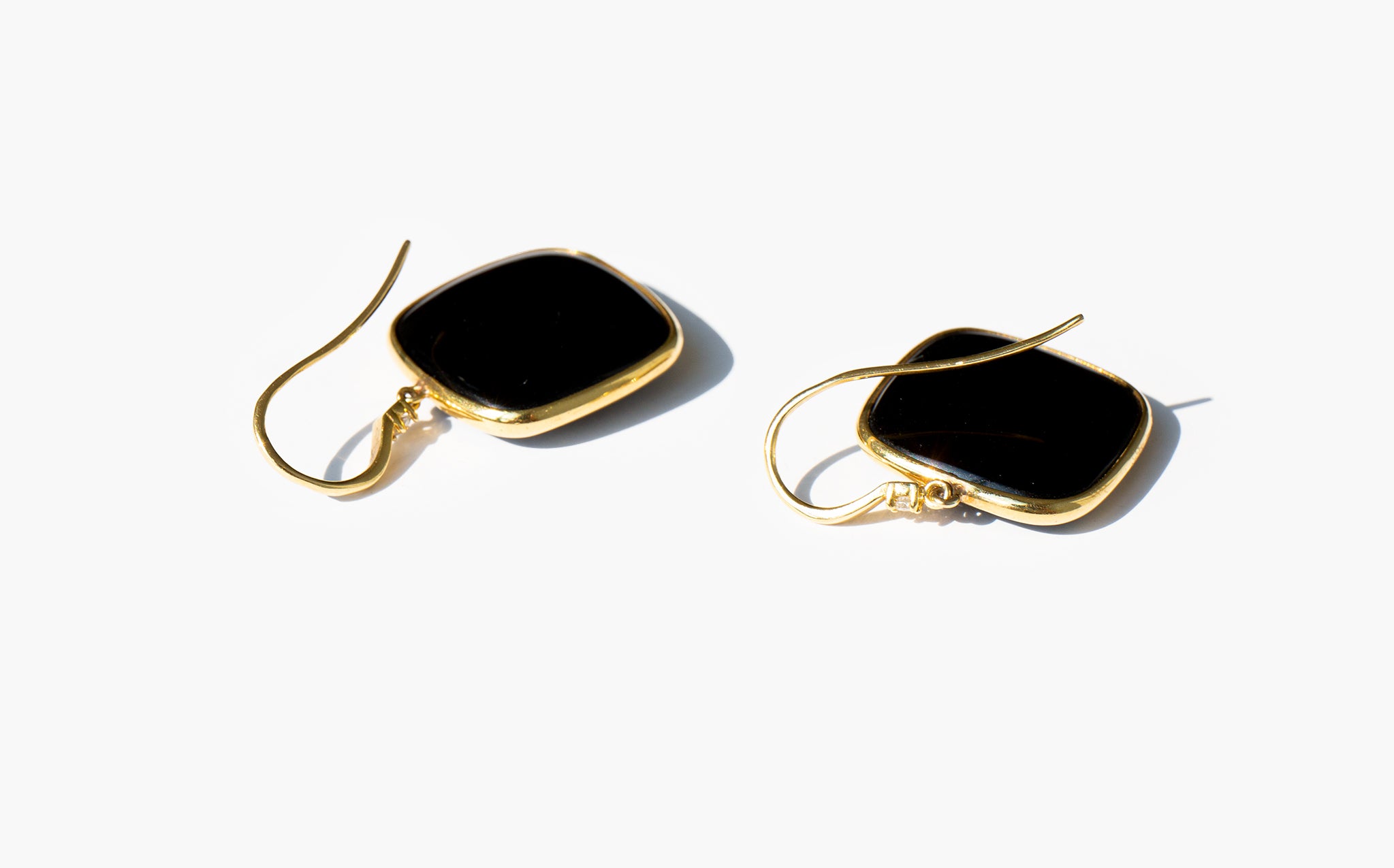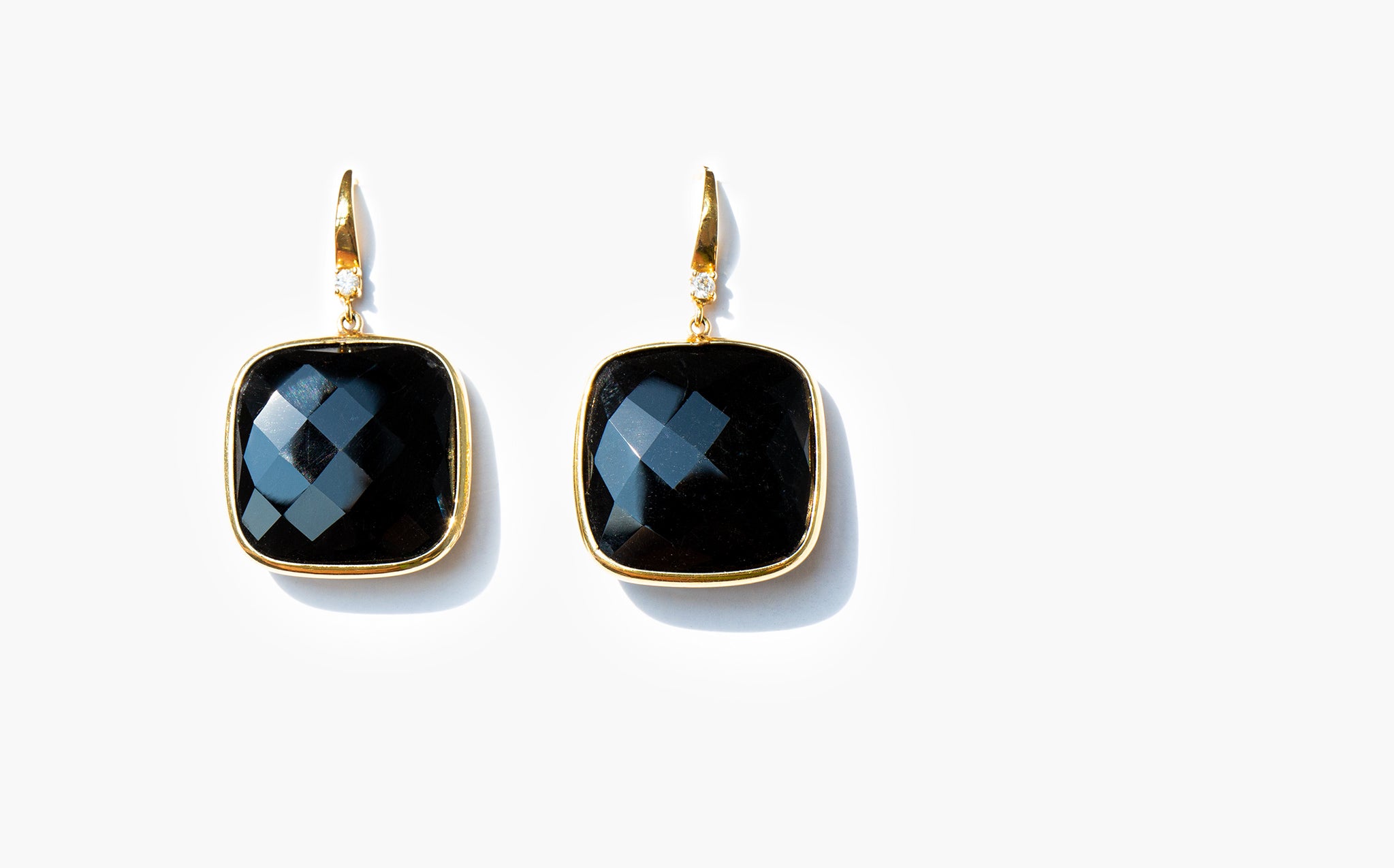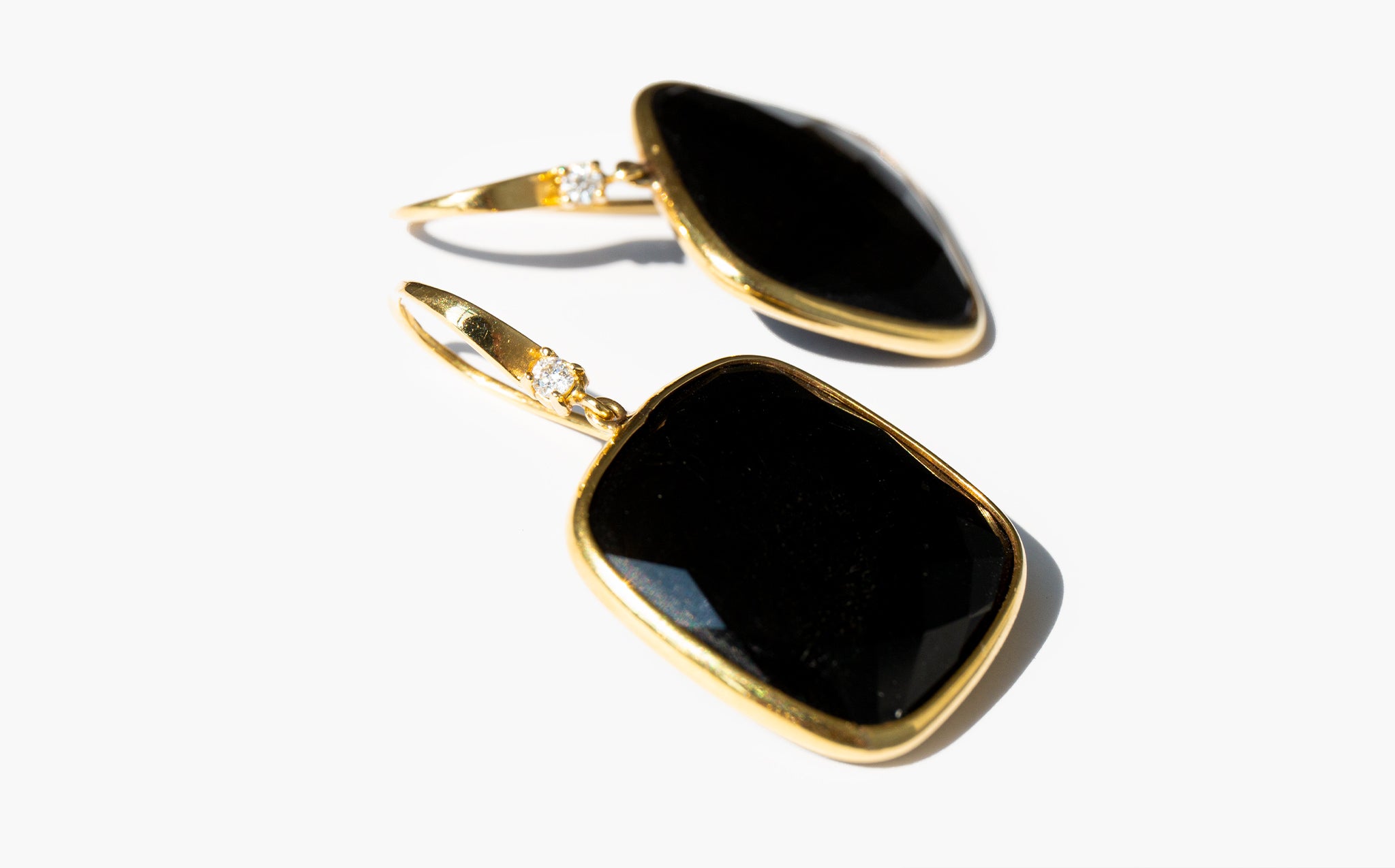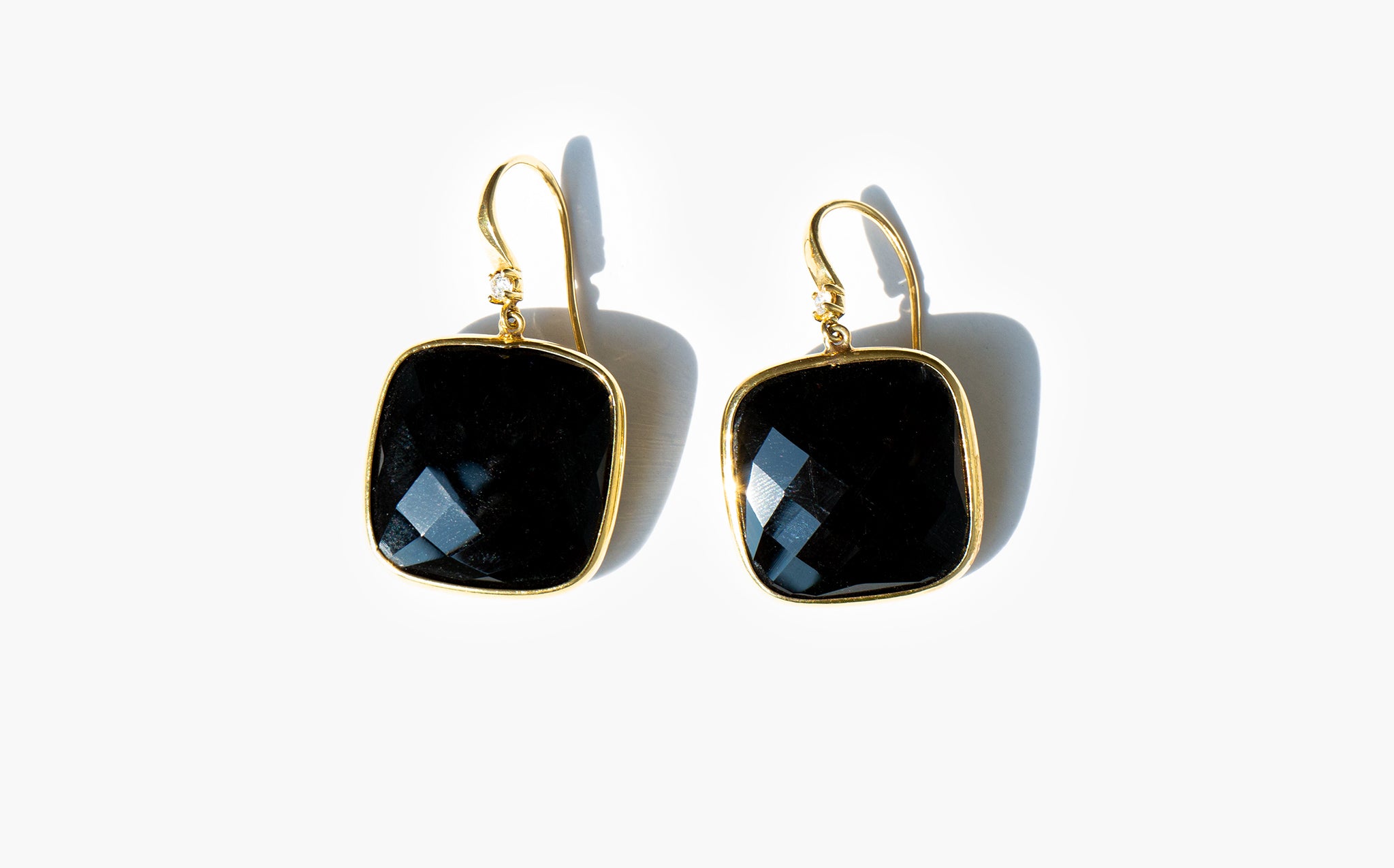 Opulent 14k gold drop earrings with large faceted onyx. Onyx is thought to be a grounding stone that imparts strength, happiness, and good fortune. A tool for repelling negative energy, keep onyx near to create a serene and pleasant environment.