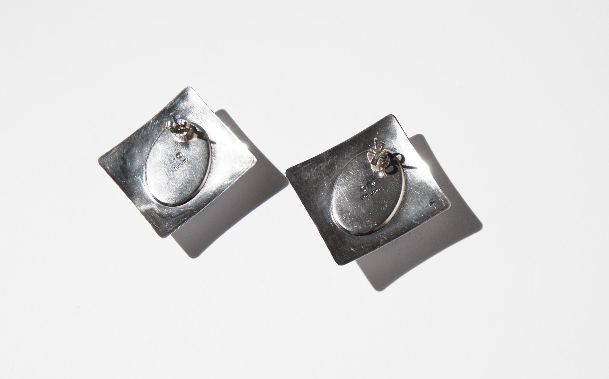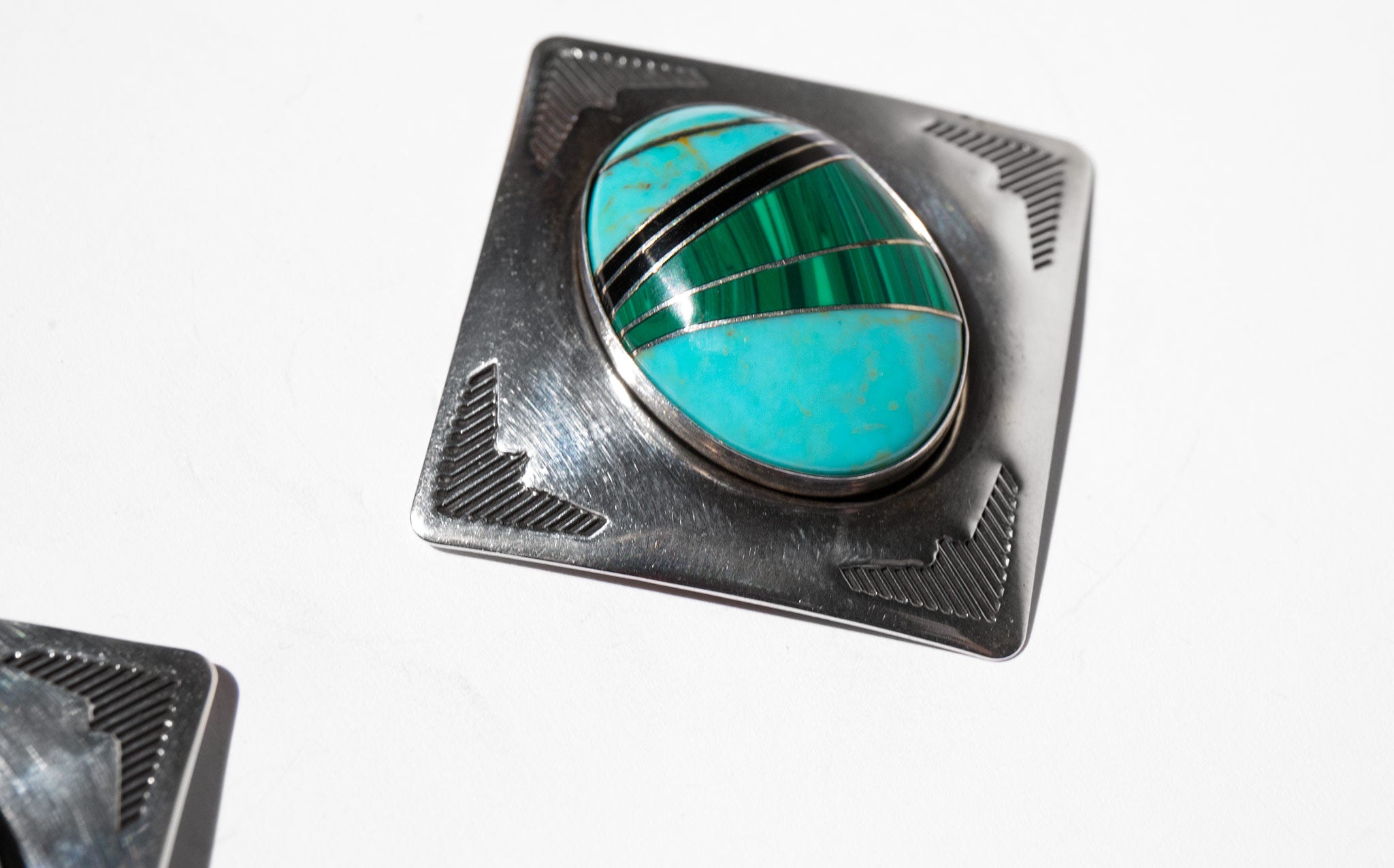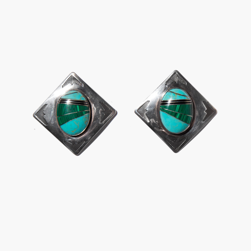 Southwestern sterling silver statement earrings with turquoise, onyx, and malachite.