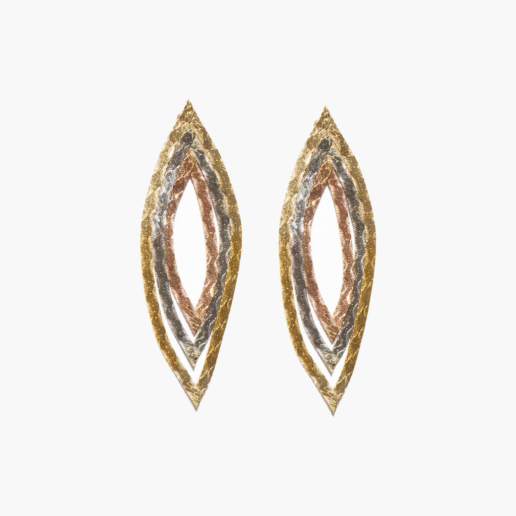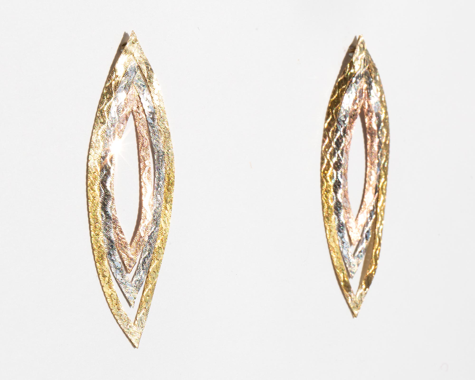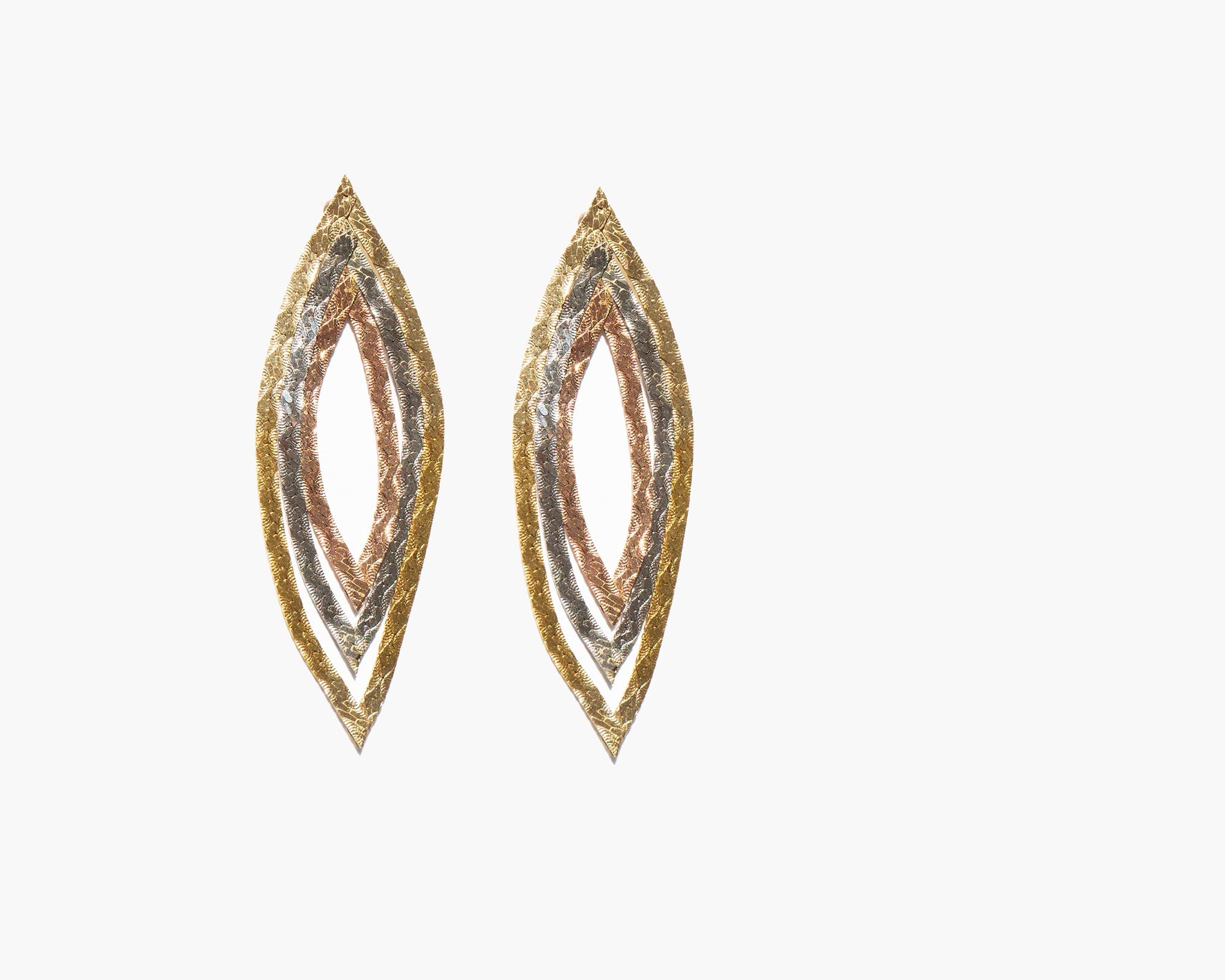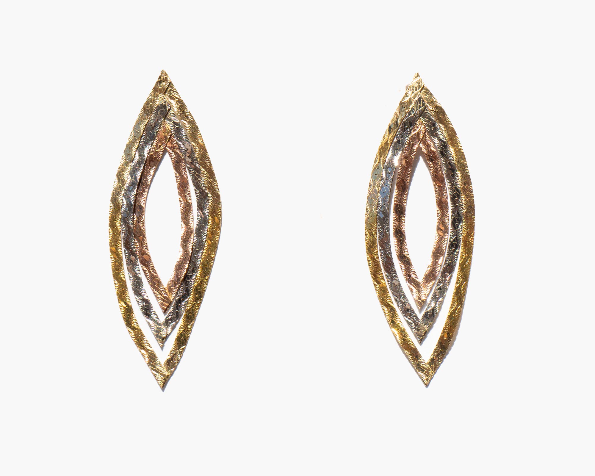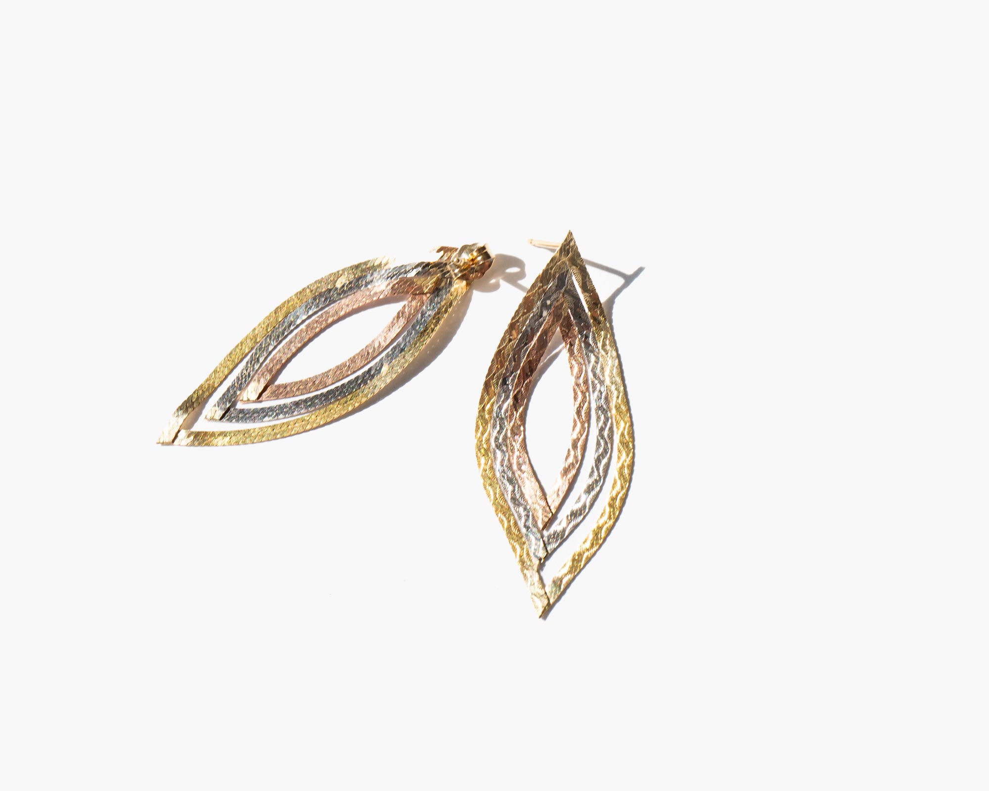Graceful tri-color 14k gold tear drop earrings.