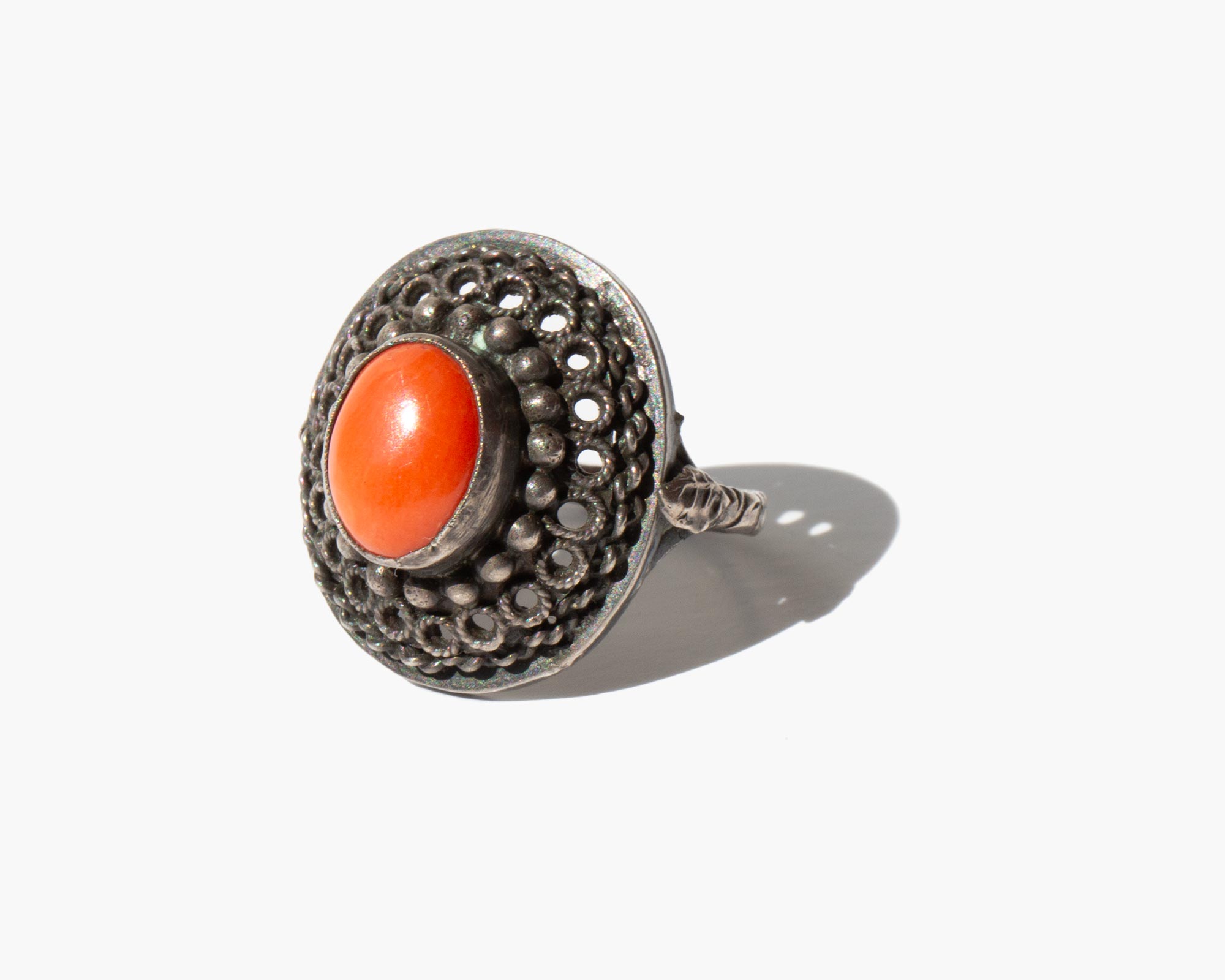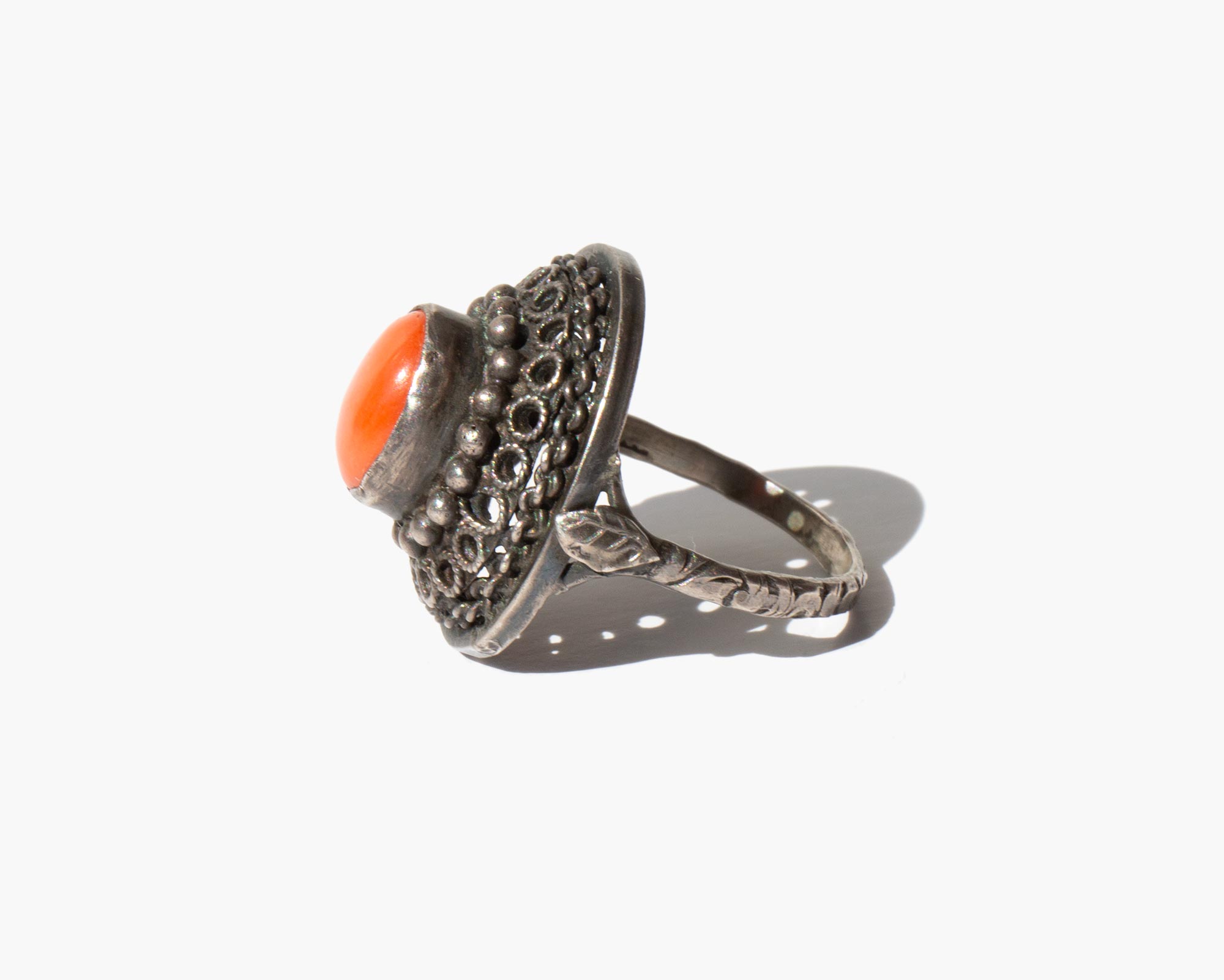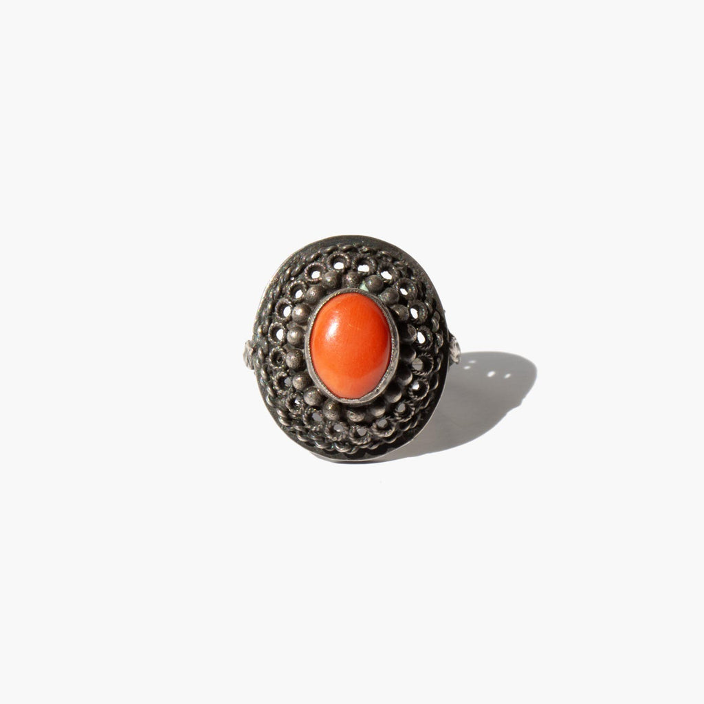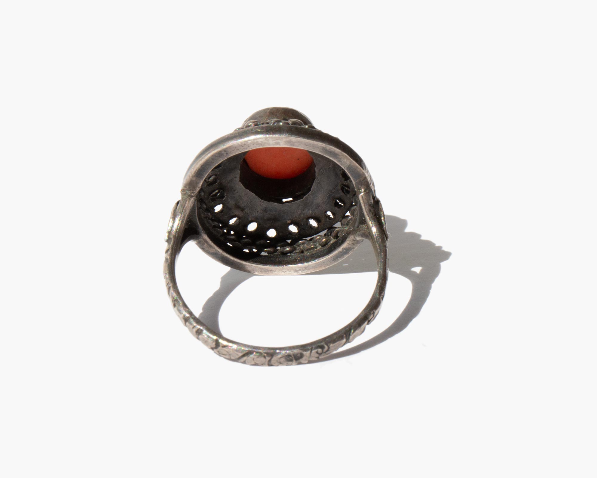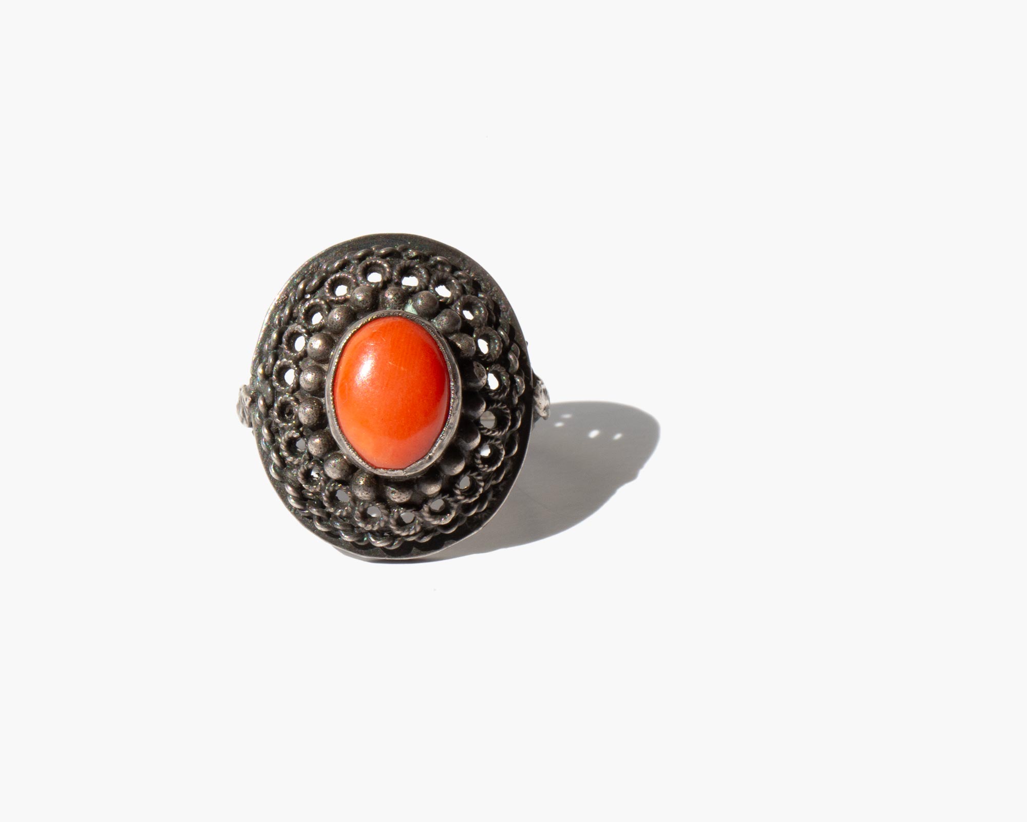 Early 20th century, pre-war sterling silver and coral ring. During the Victorian period red coral was given to children to protect them from becoming a changeling, a fairy child swapped and left in the place of a human child. For this reason you’ll often see antique Victorian rattles with red coral incorporated. Still thought to have protective powers, coral is said to guard against demonic powers, curses, the destructive forces of the Evil Eye and to ward off visitations by succubus or incubus demons. To be effective, the coral should be worn directly against the body so that it can capture and destroy any sorcery before it reaches the wearer of the amulet.