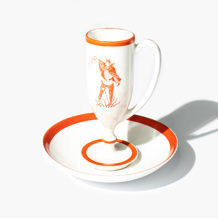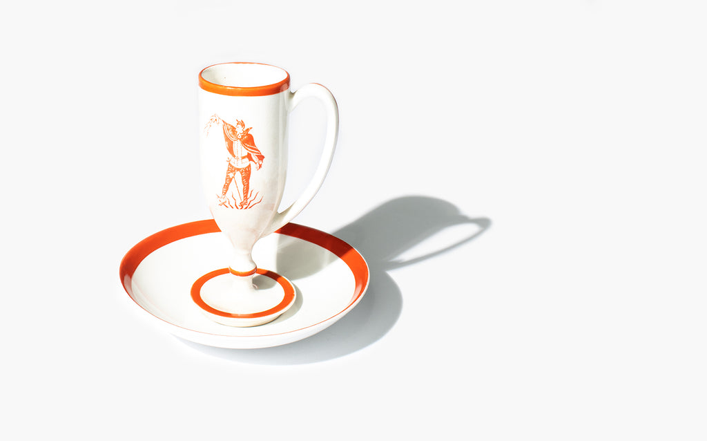Cup and saucer made at the Bovey Pottery Company in Bovey Tracey England. The cup features a stylized Mephistopheles, an agent of the devil from German folklore.