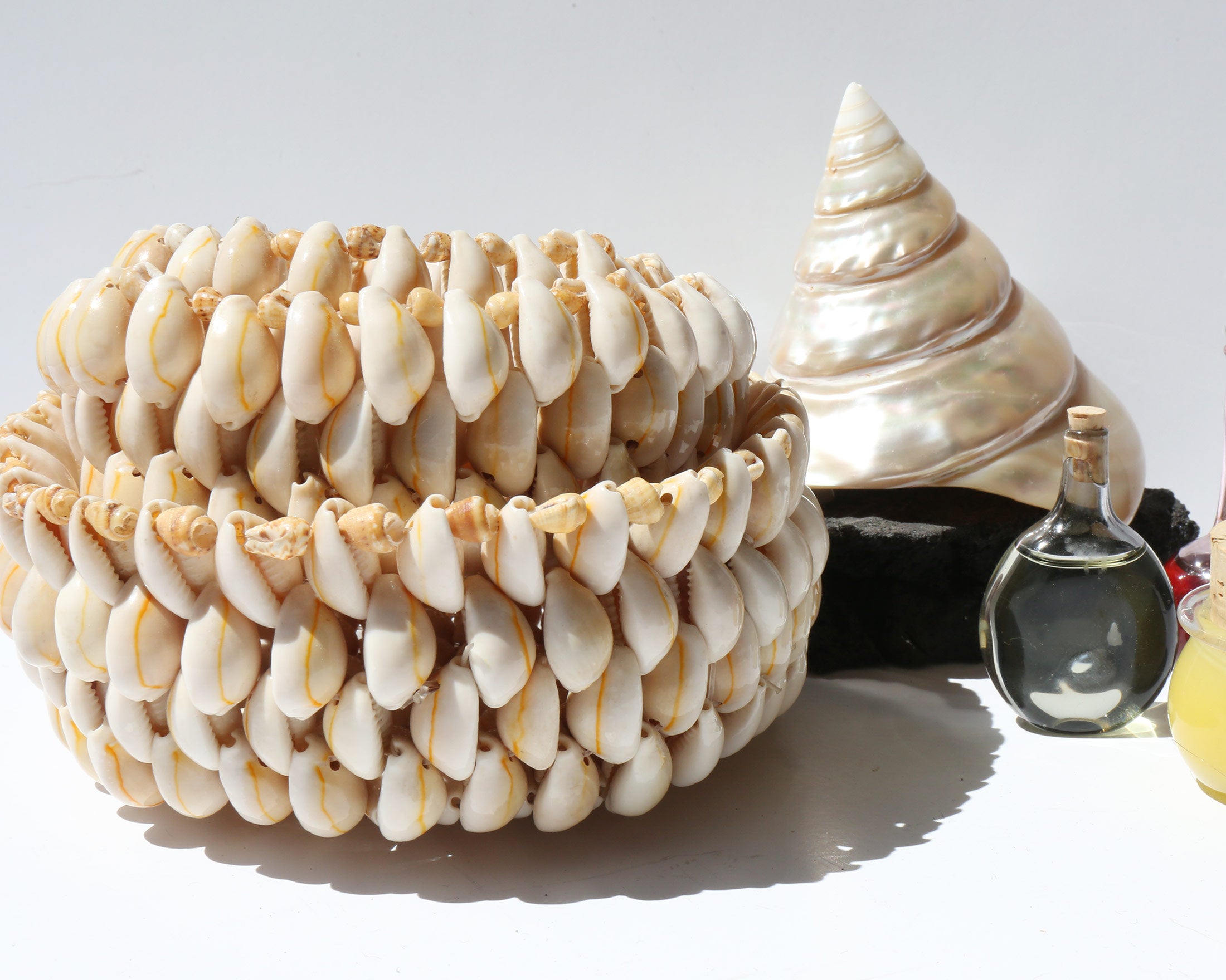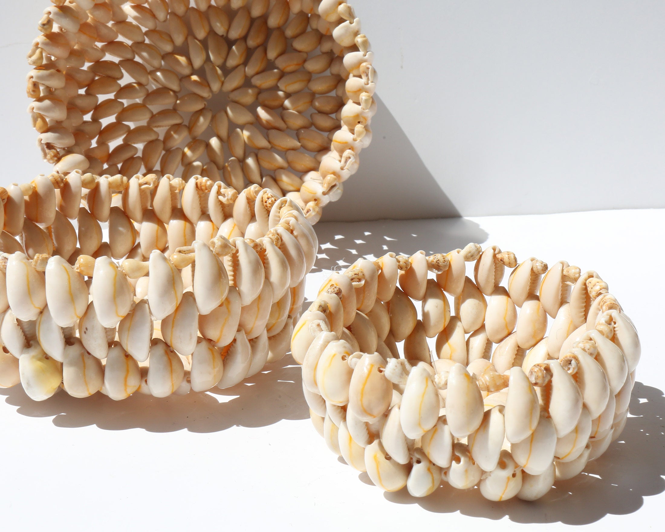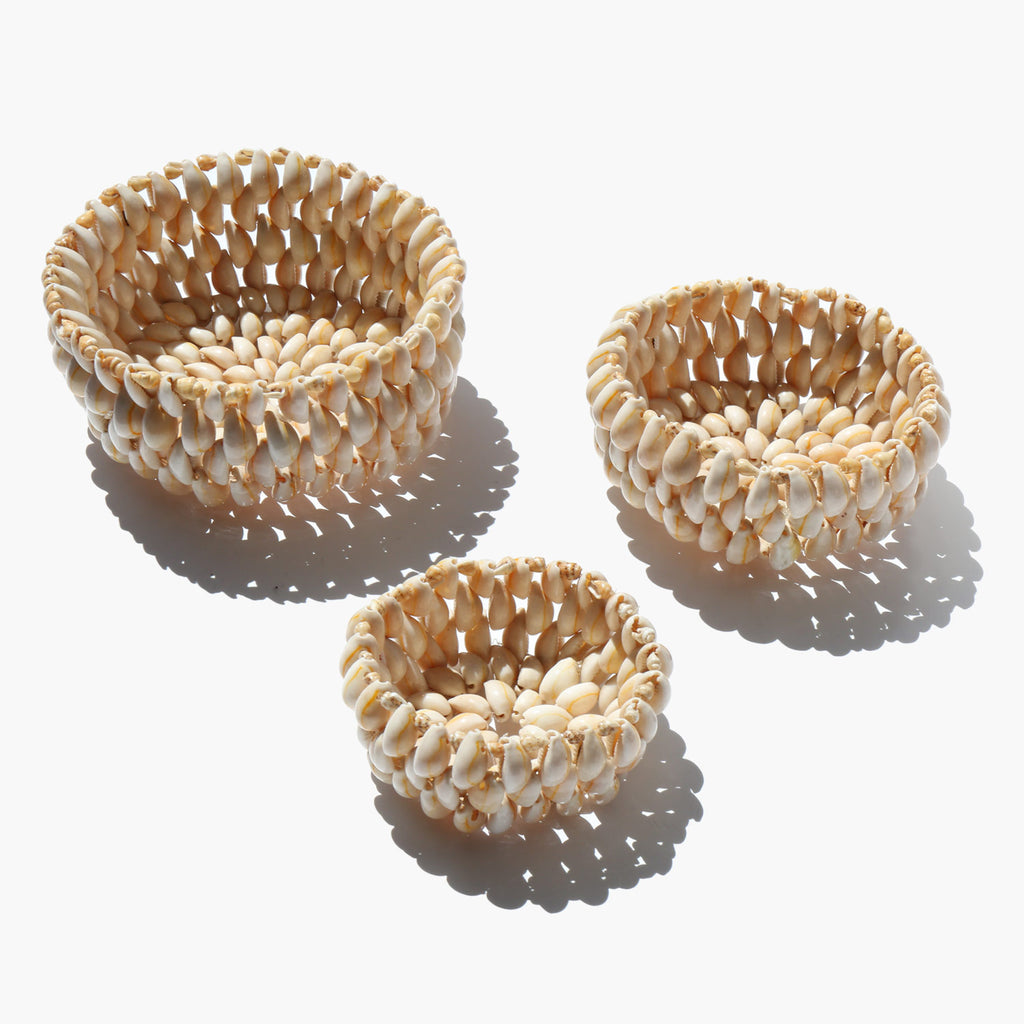 Hand woven cowrie shell art bowls in three sizes that can be nested.