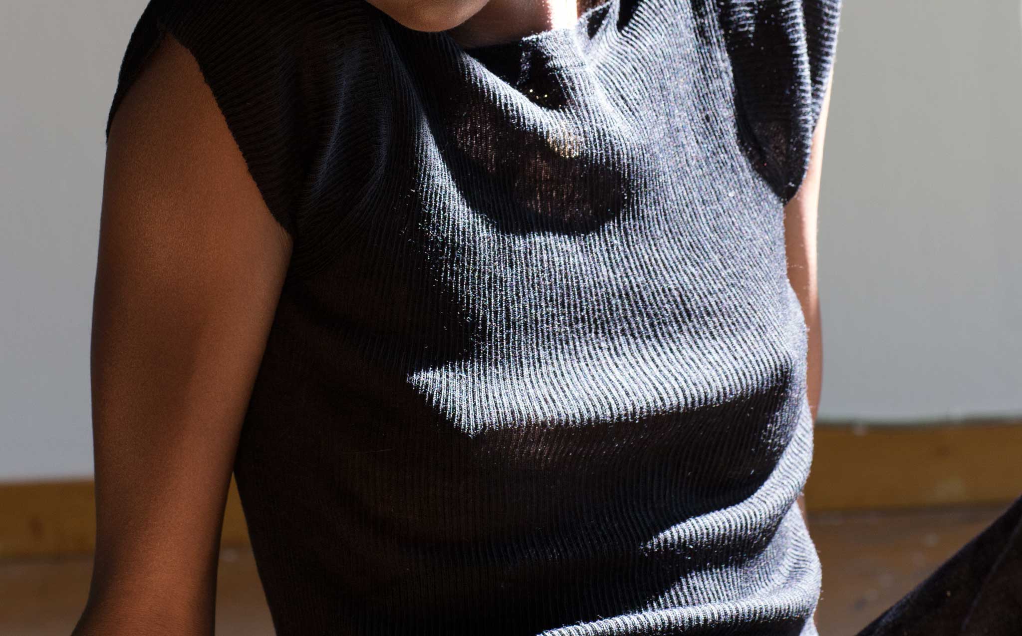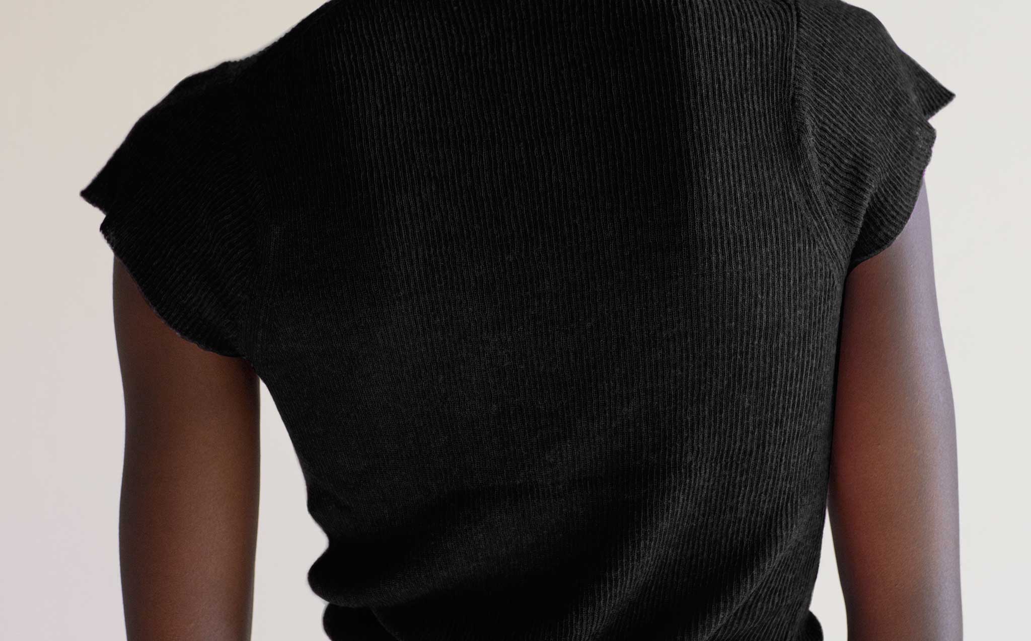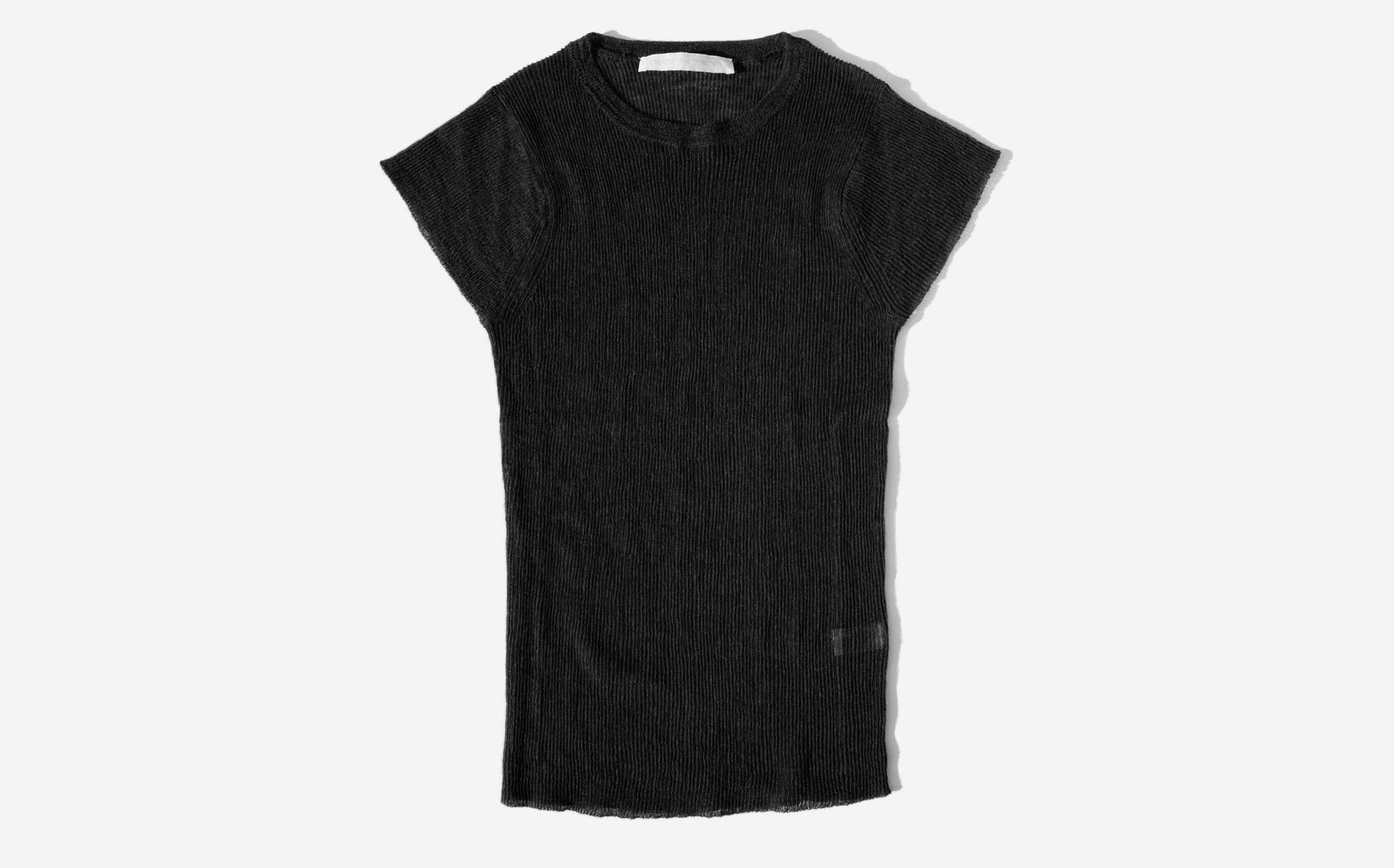 The Creatures Of Comfort Shrunken Tee is a slightly sheer, fitted, rib-knit tee made from luxurious, superfine, high twist Japanese yarn. The perfect wardrobe staple with a high, round neck and capped sleeves. This item is FINAL SALE.