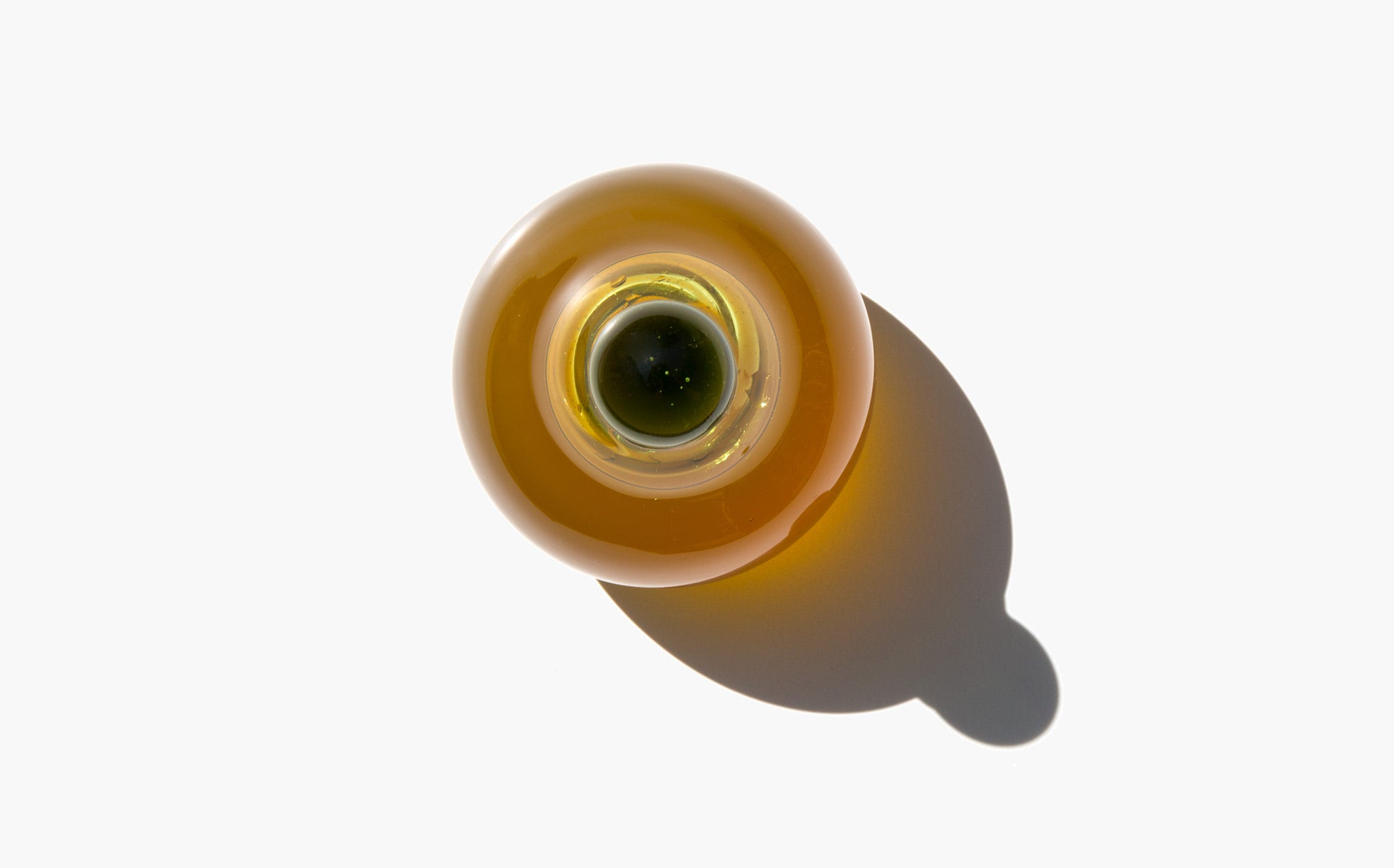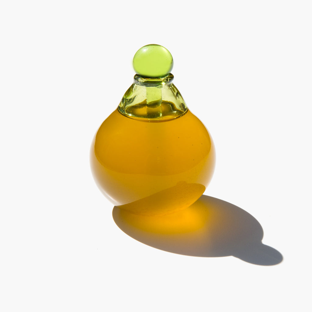 Approximately 2 3/4 oz, hand blown glass bottle with dabber that is shipped wax and cork sealed.
